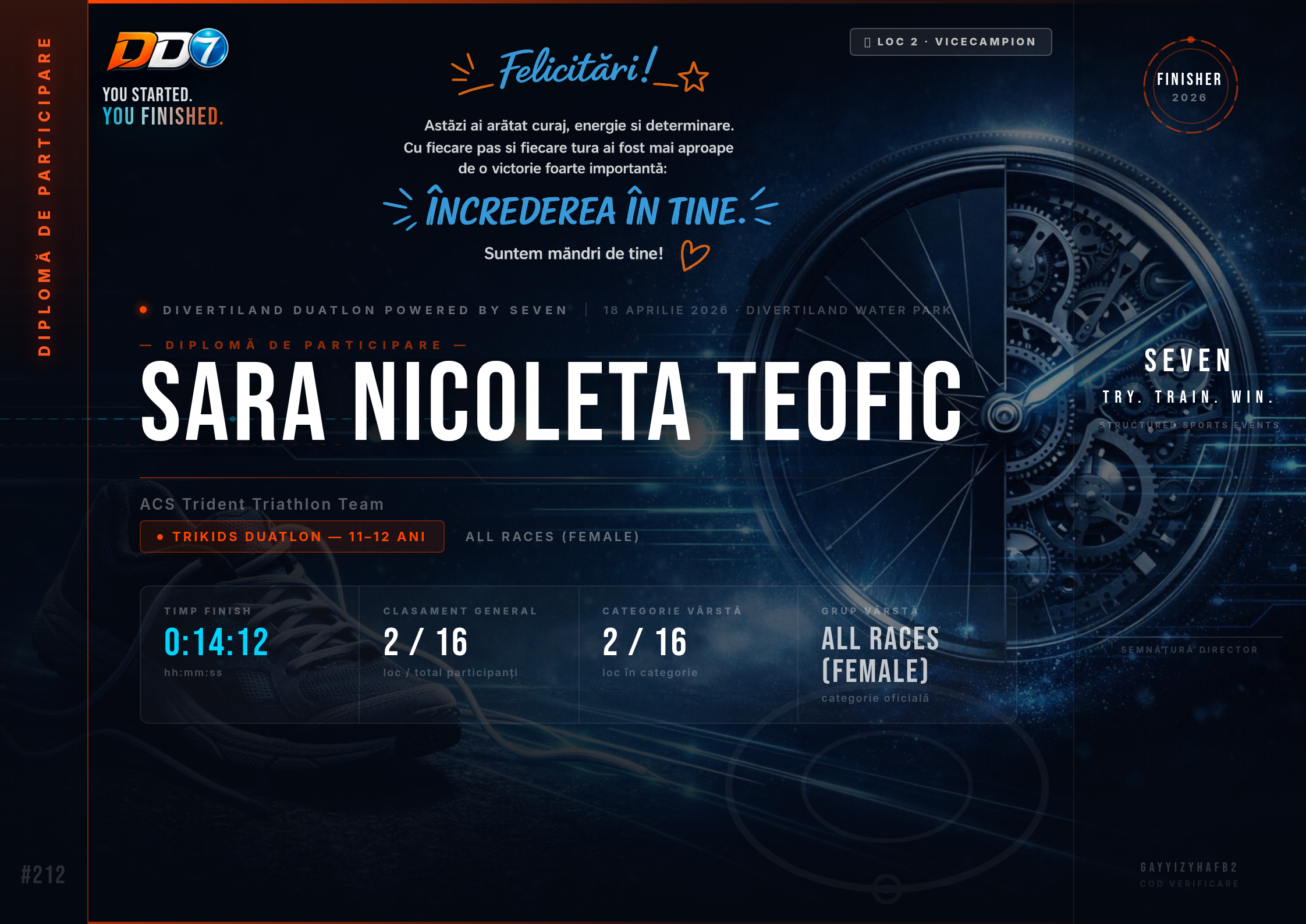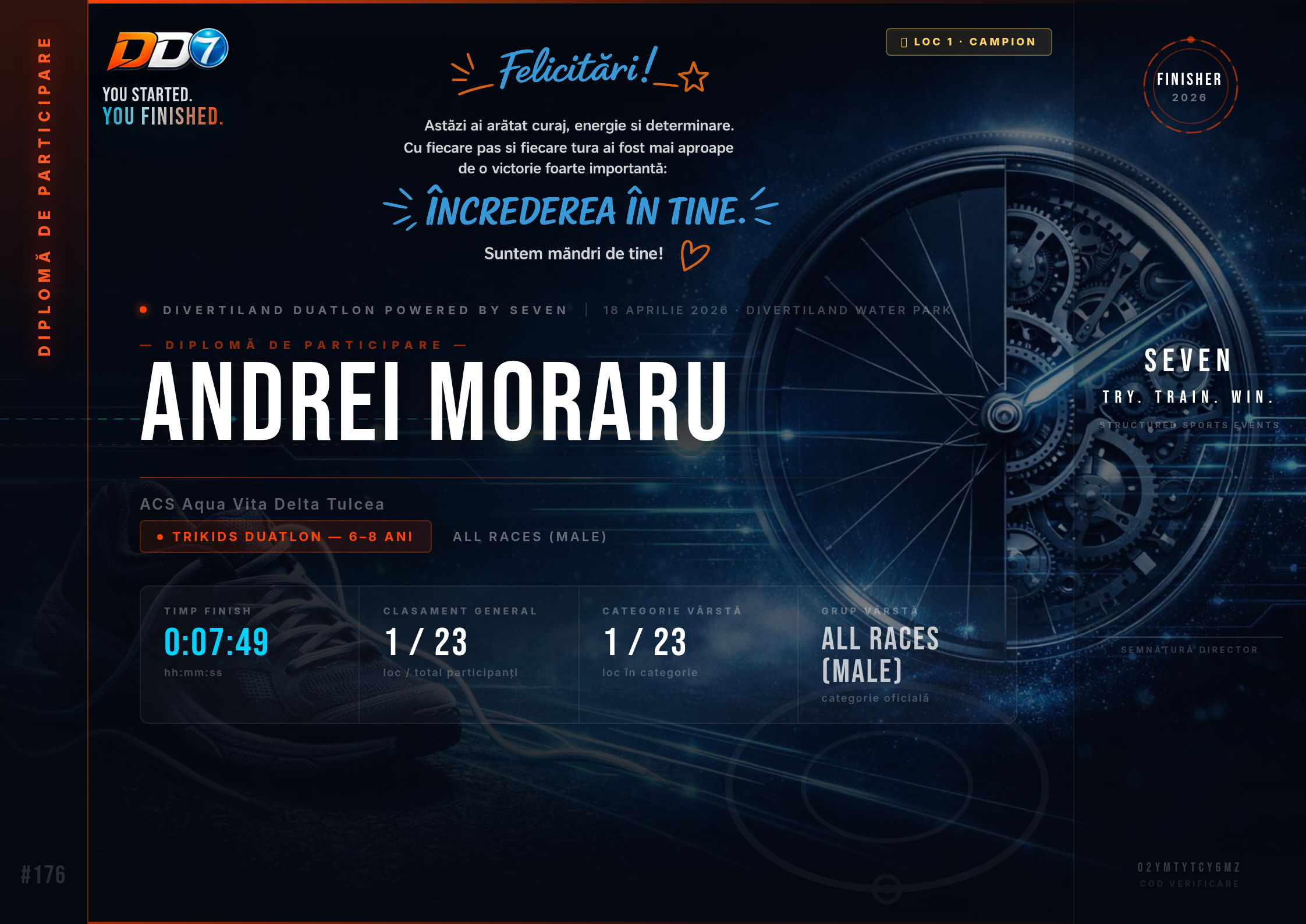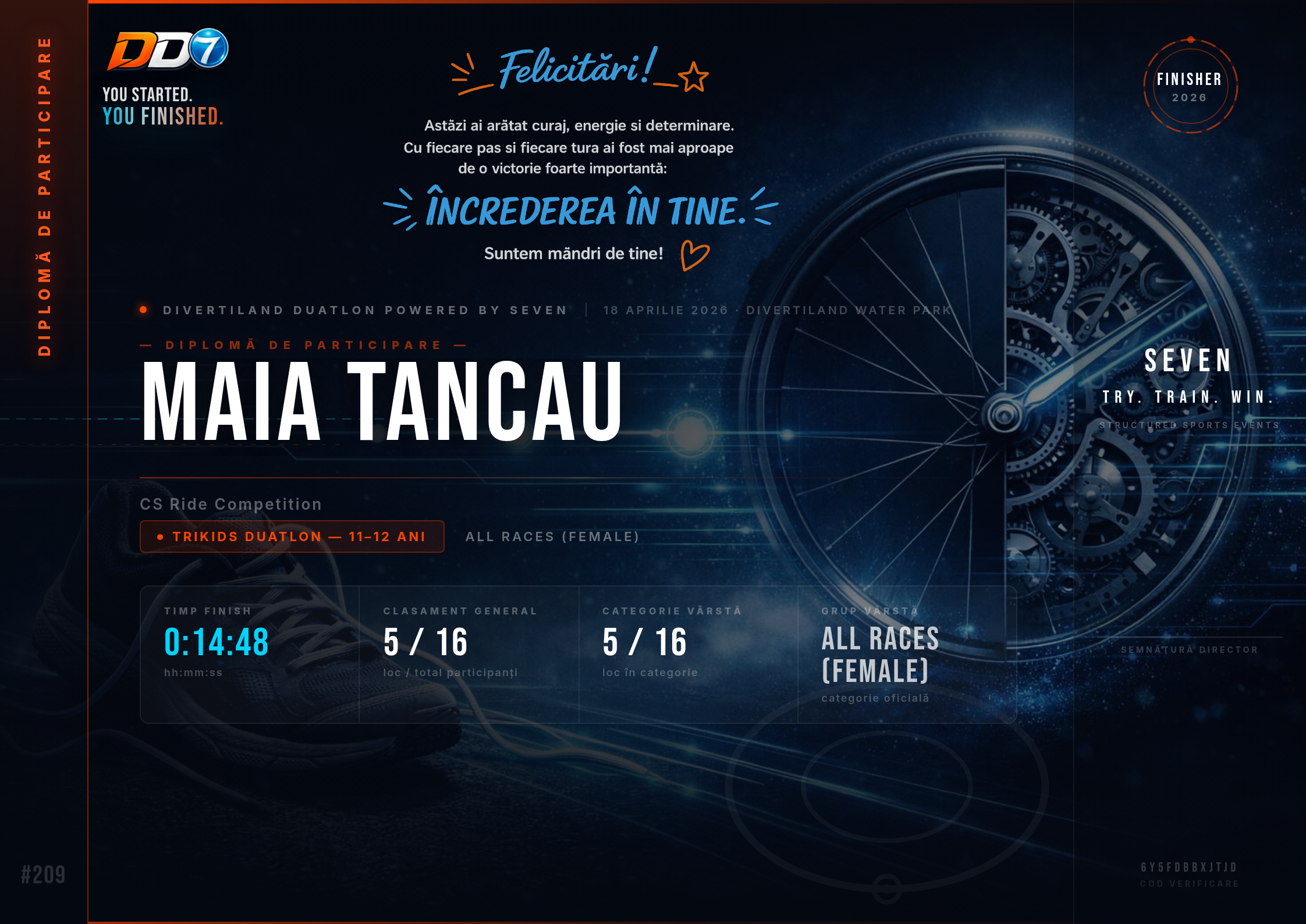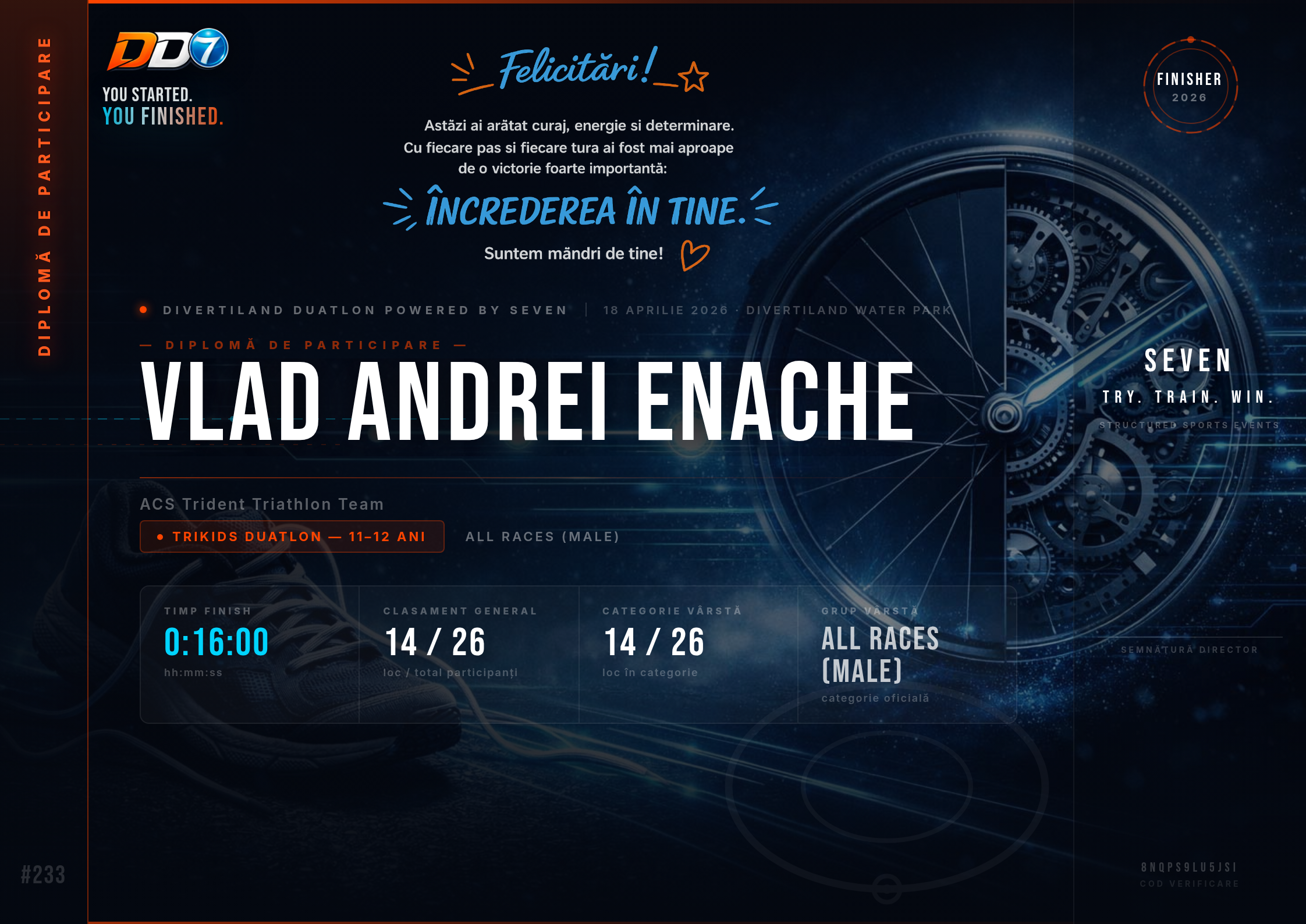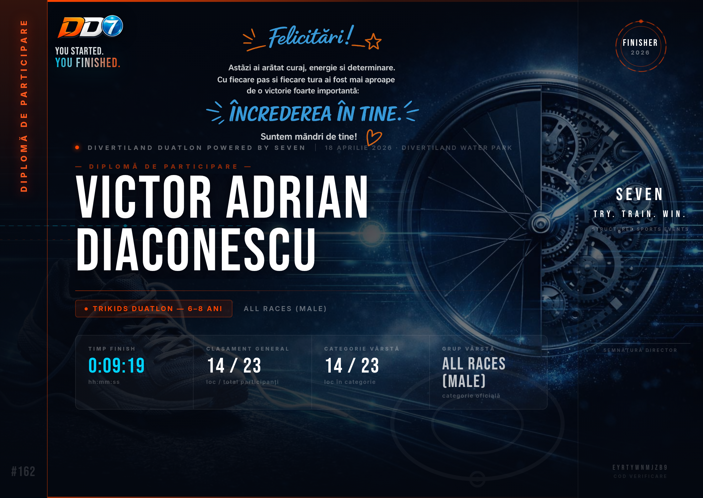 | 14 | Victor AdriaN Diaconescu | TRIKids 6-8 Ani | M | 162 | 0:01:07 | 0:00:59 | 0:05:36 | 0:01:38 | 0:09:19 | 📜 |