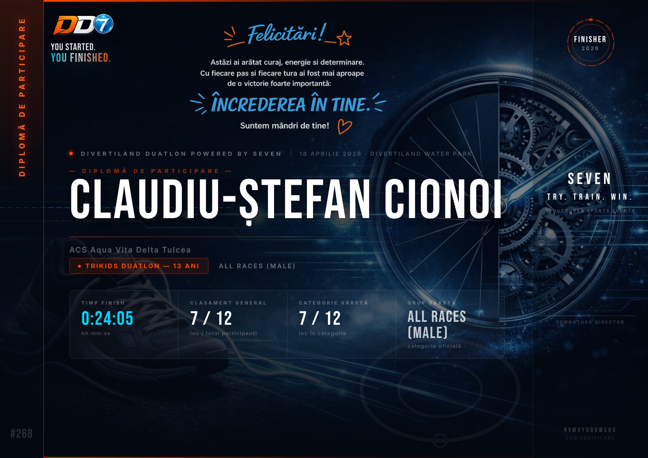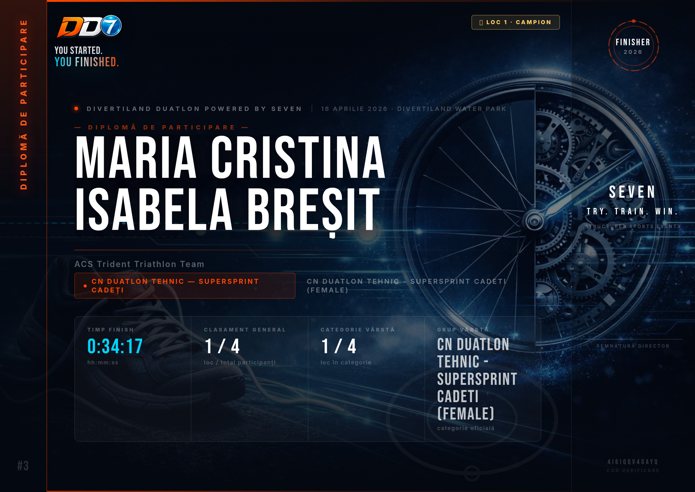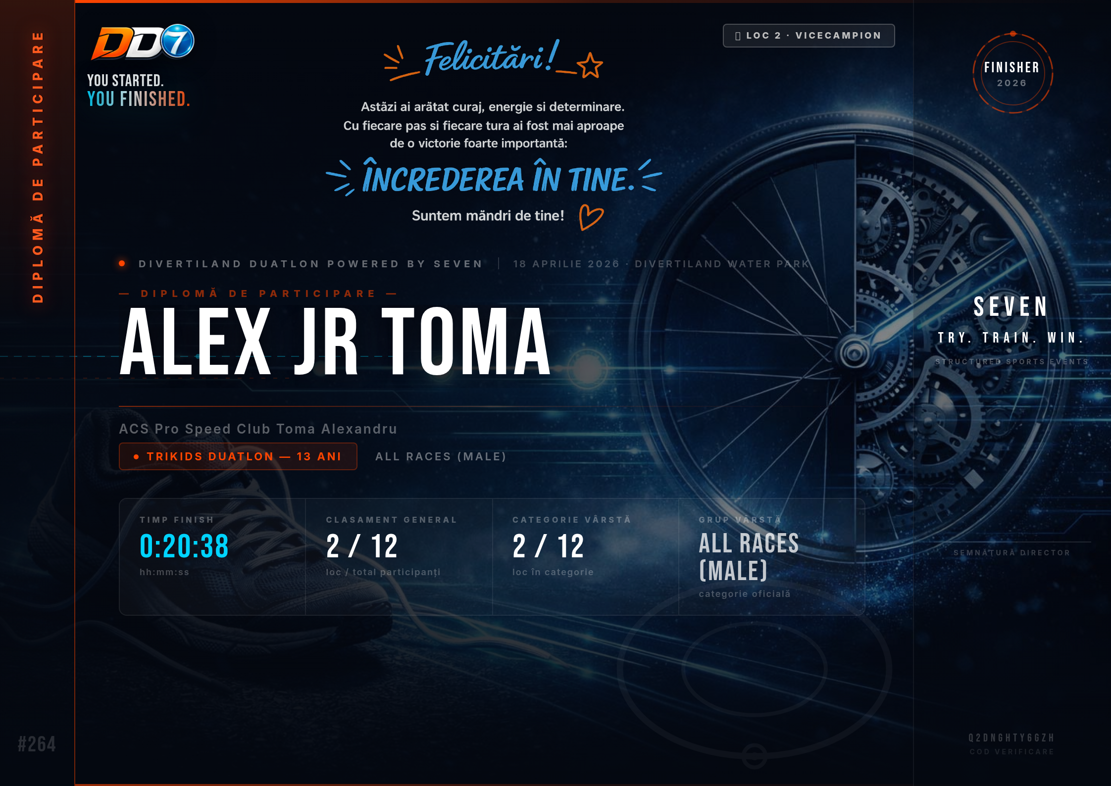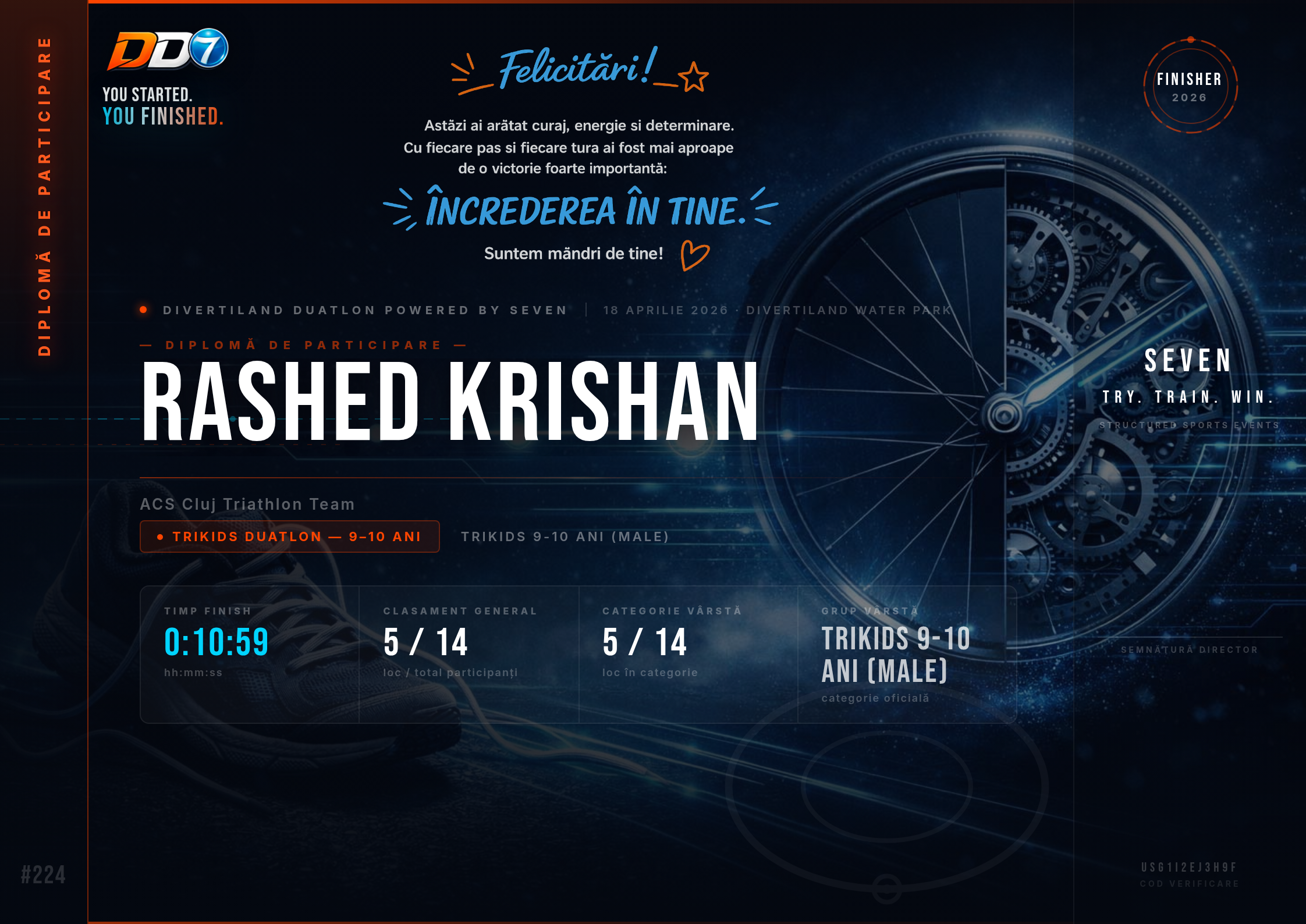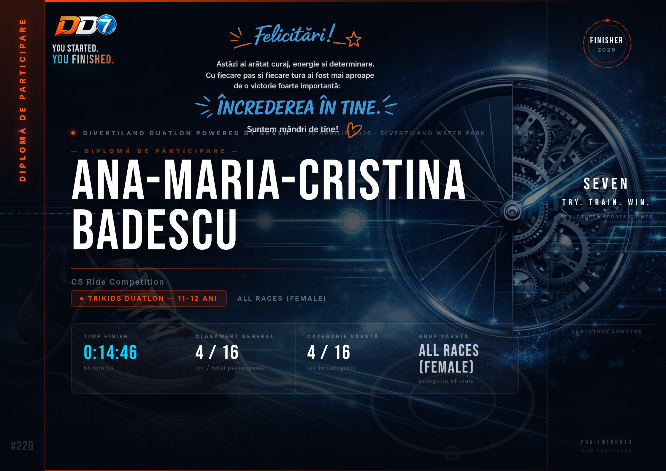 | 14 | Victor AdriaN Diaconescu | TRIKids 6-8 Ani | M | 162 | 0:01:07 | 0:00:59 | 0:05:36 | 0:01:38 | 0:09:19 | 📜 |