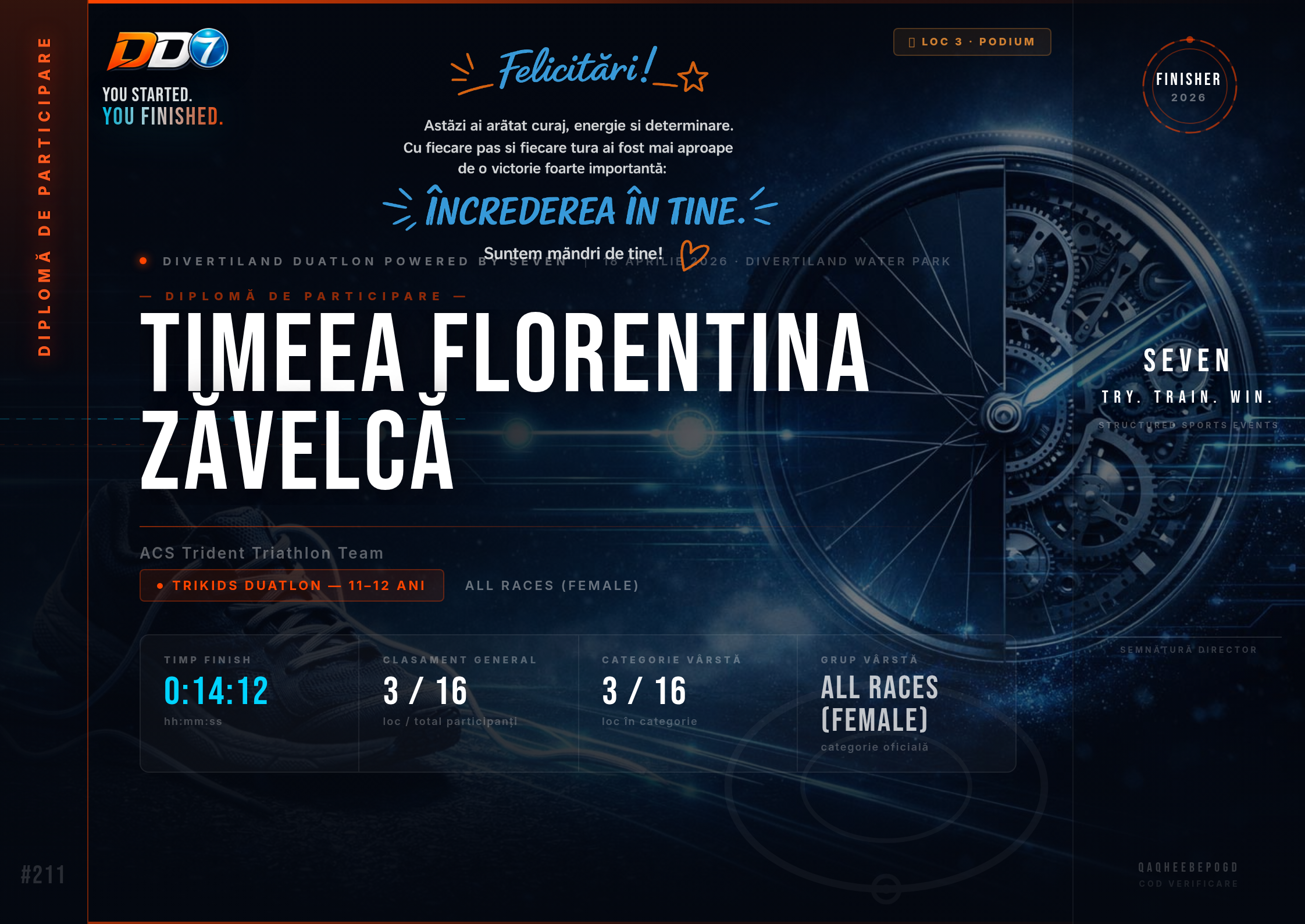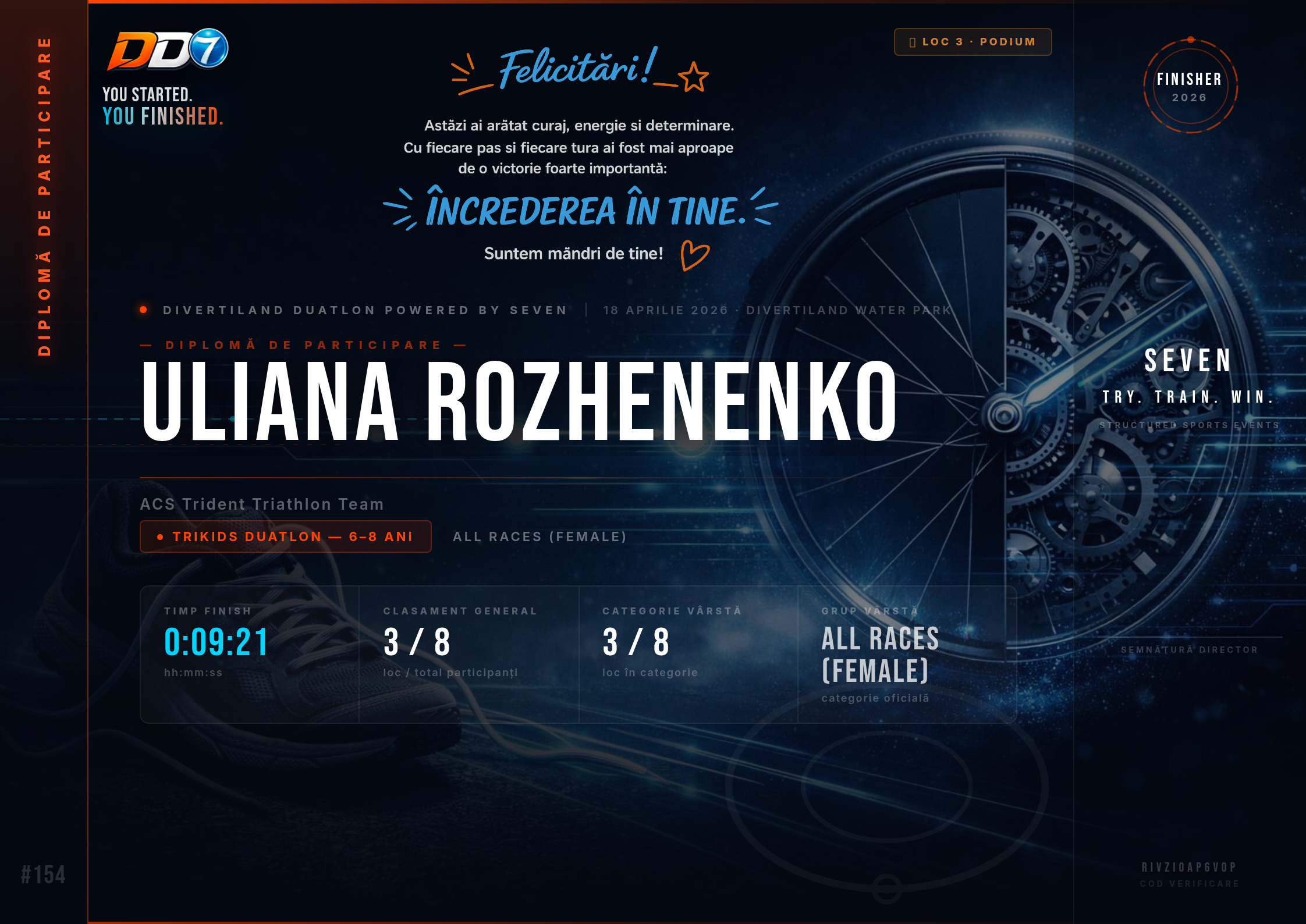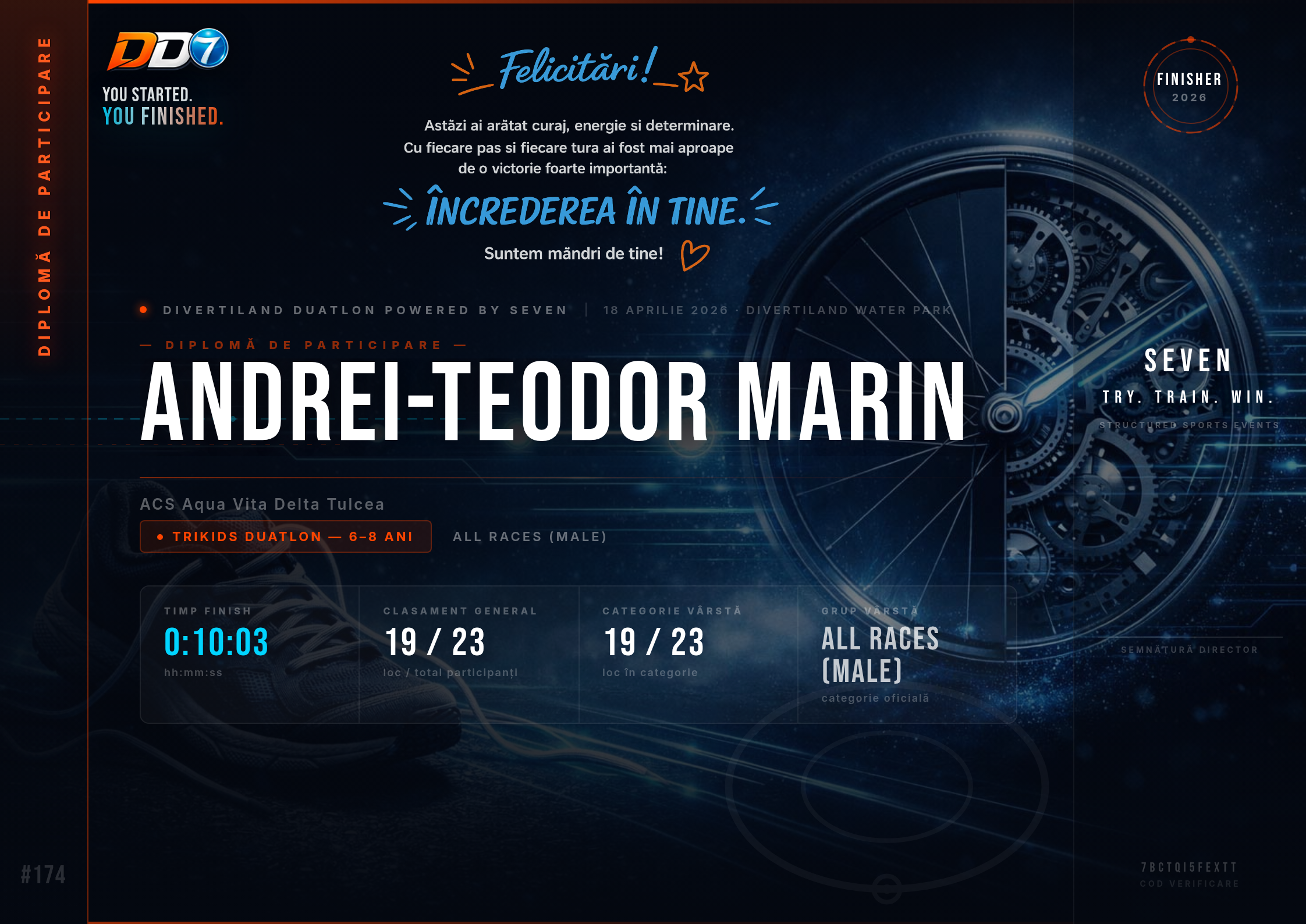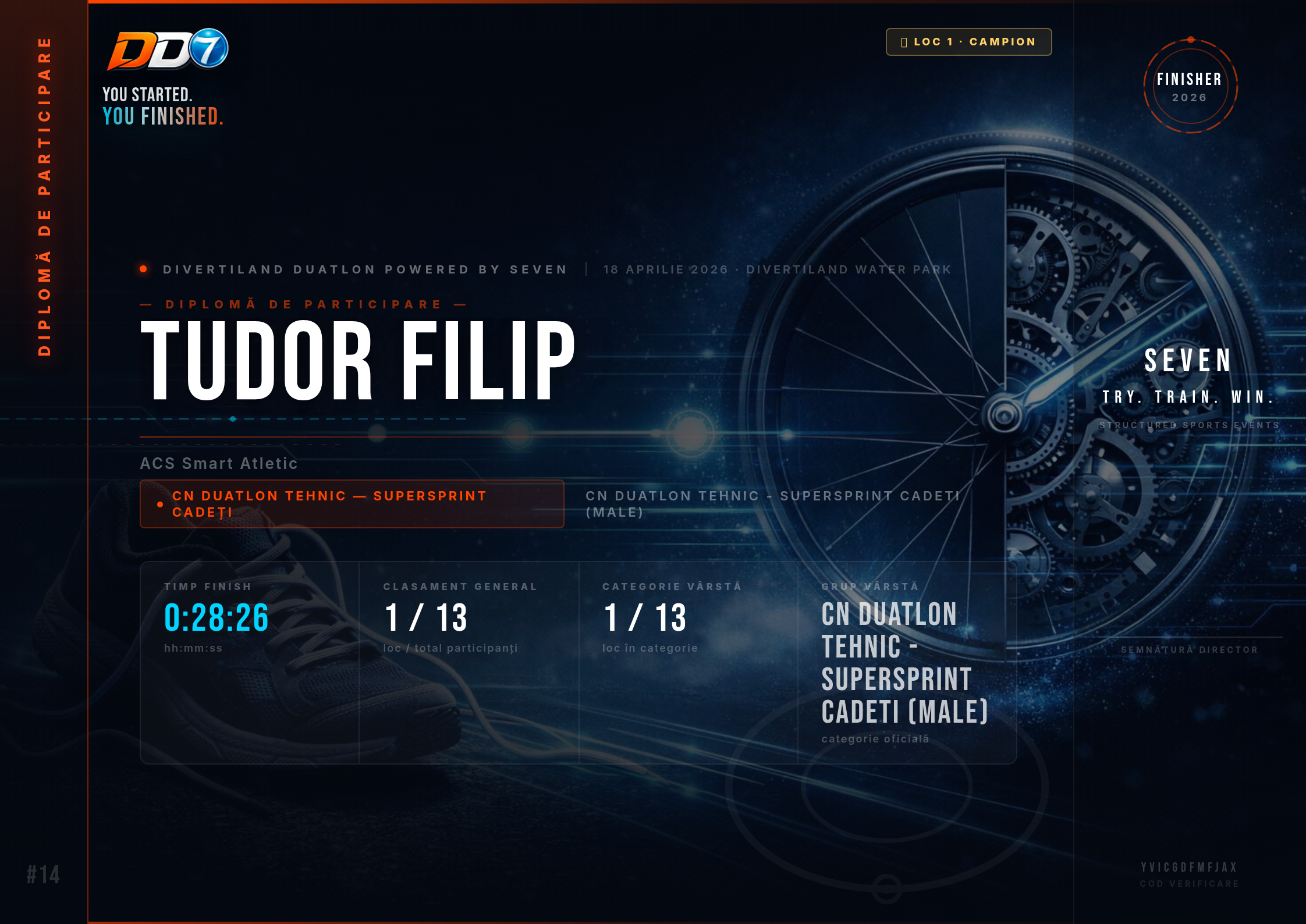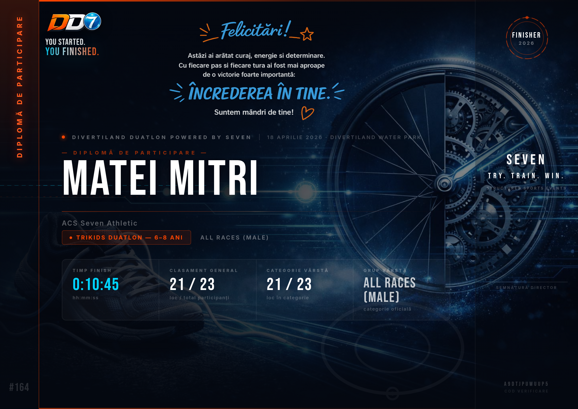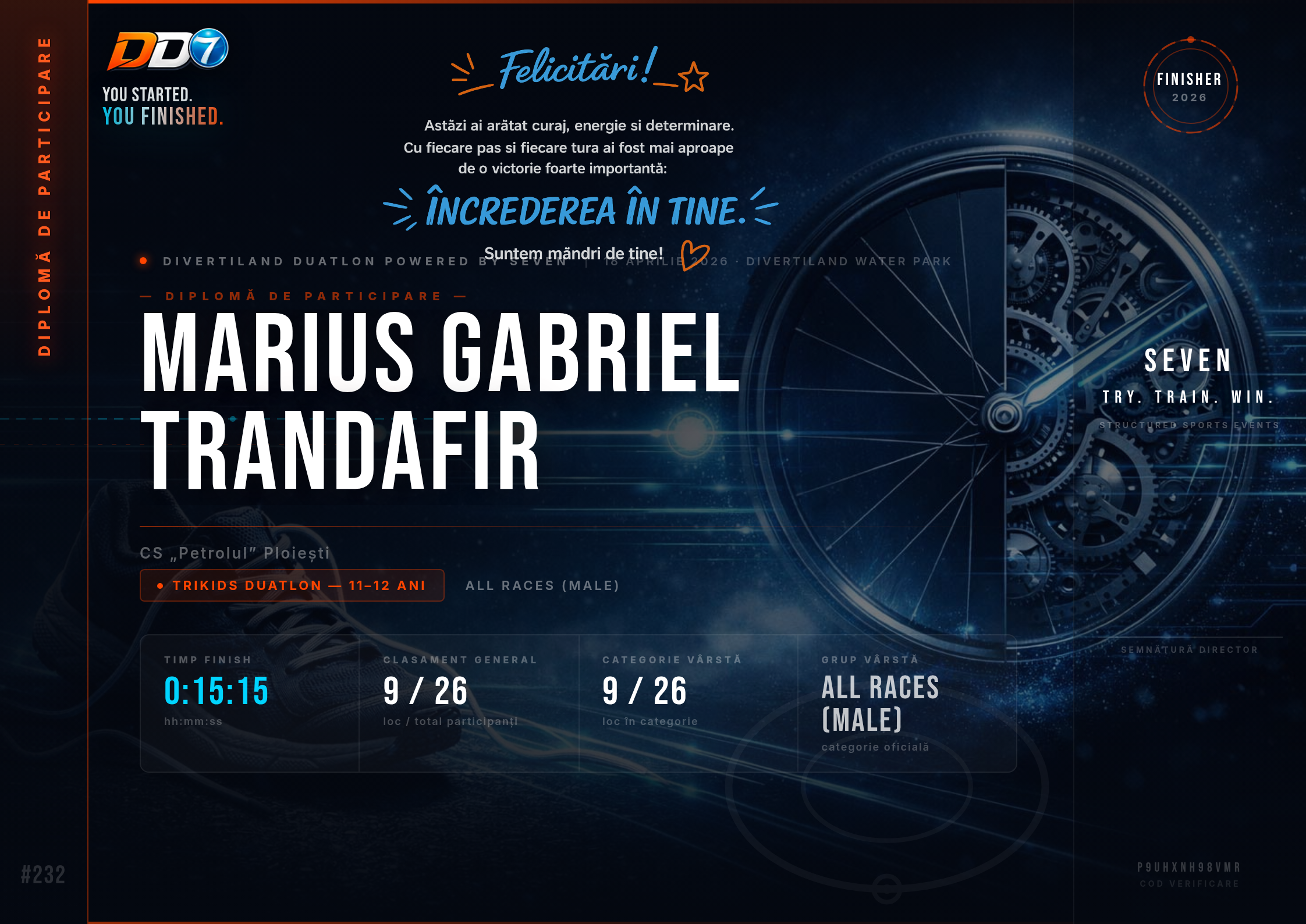 | 14 | Victor AdriaN Diaconescu | TRIKids 6-8 Ani | M | 162 | 0:01:07 | 0:00:59 | 0:05:36 | 0:01:38 | 0:09:19 | 📜 |