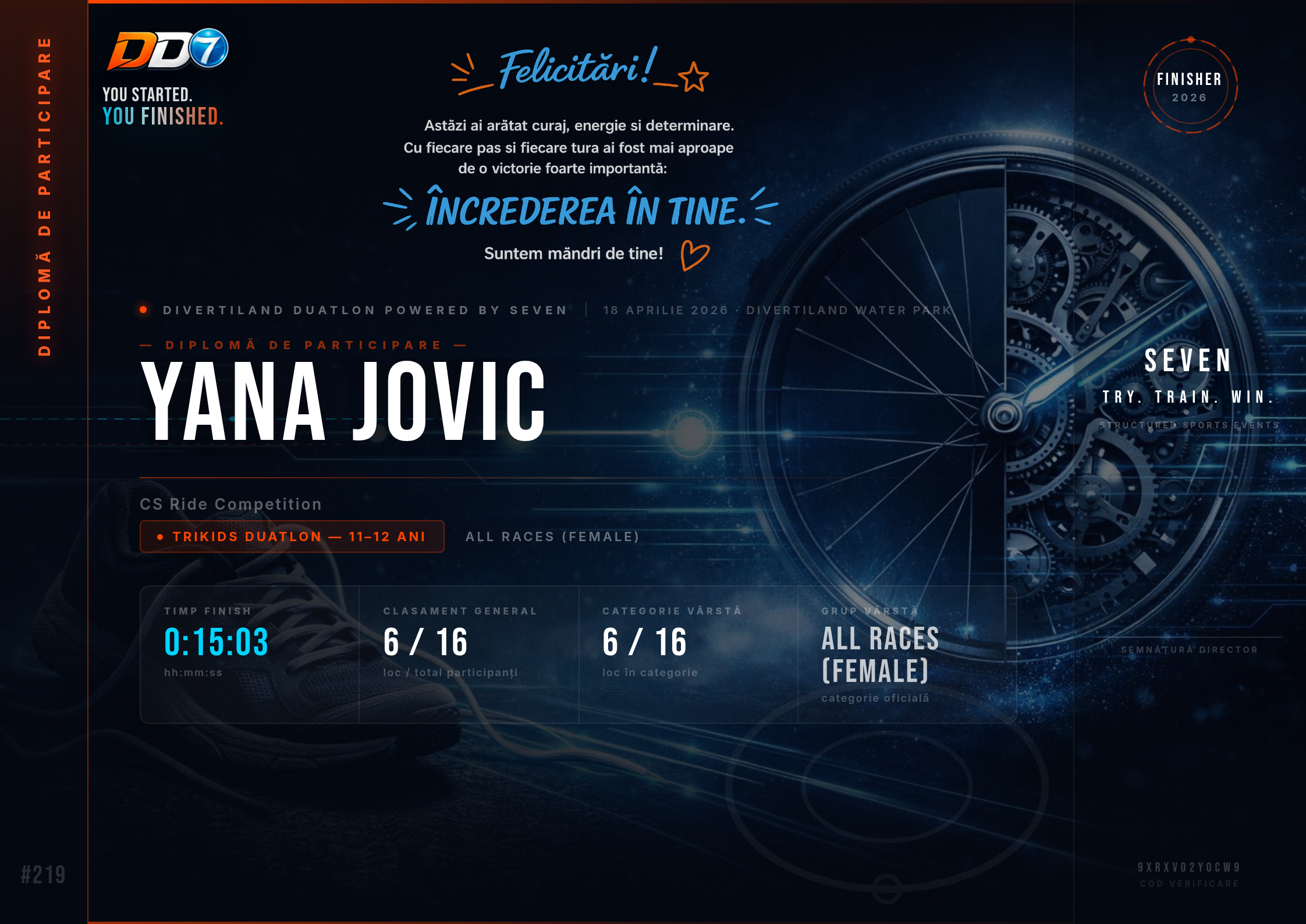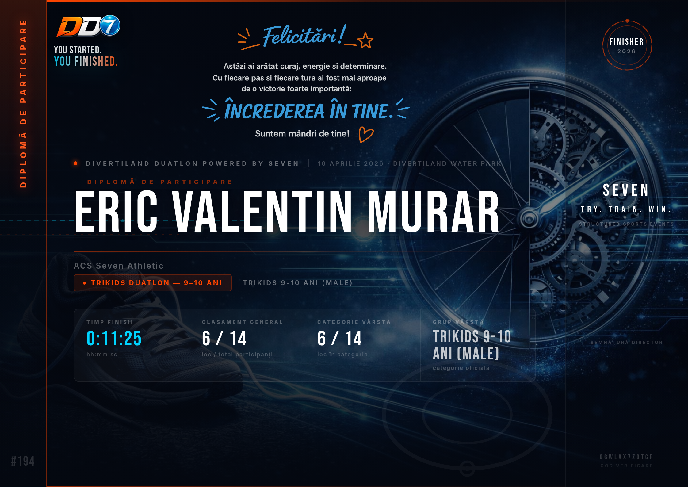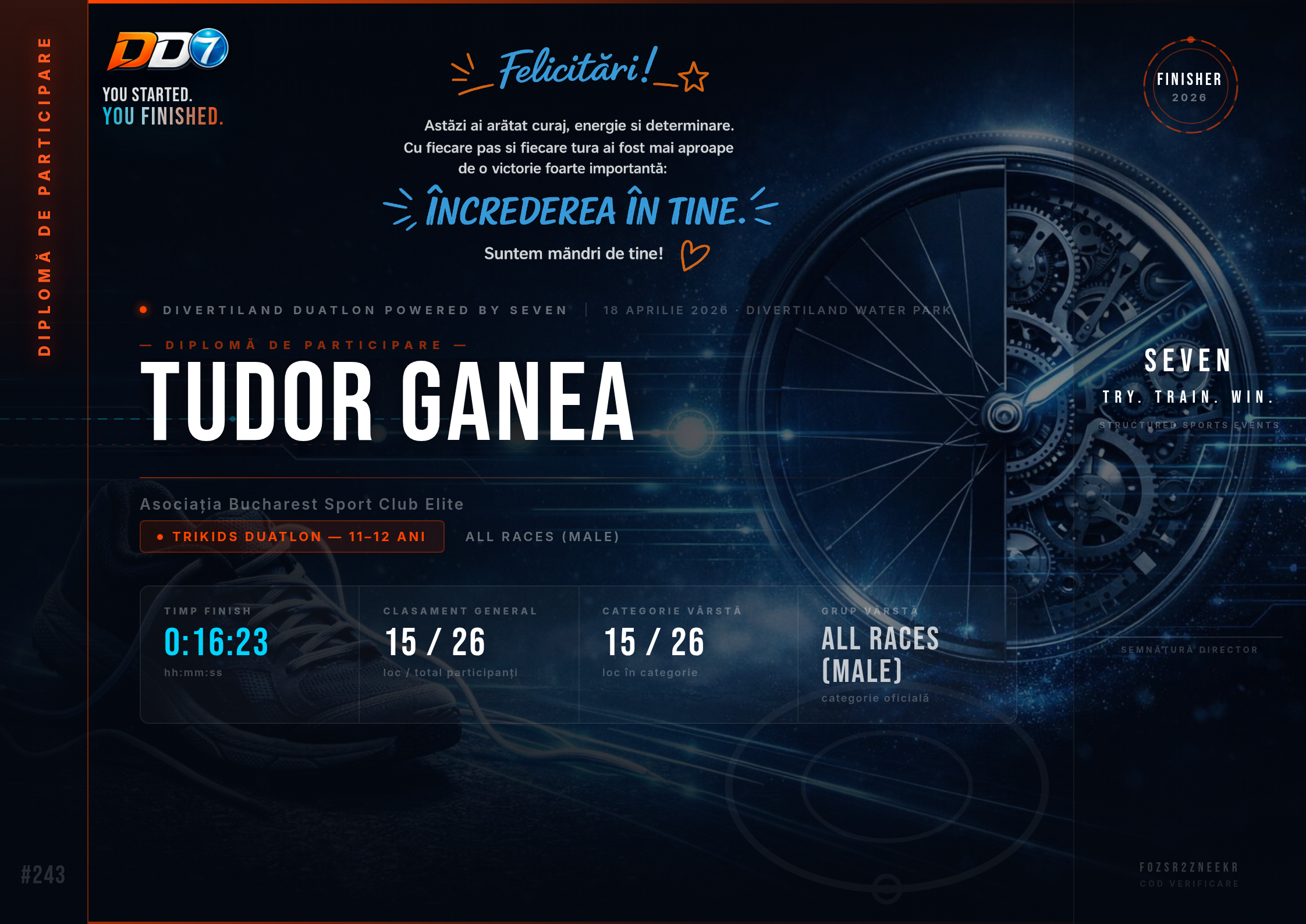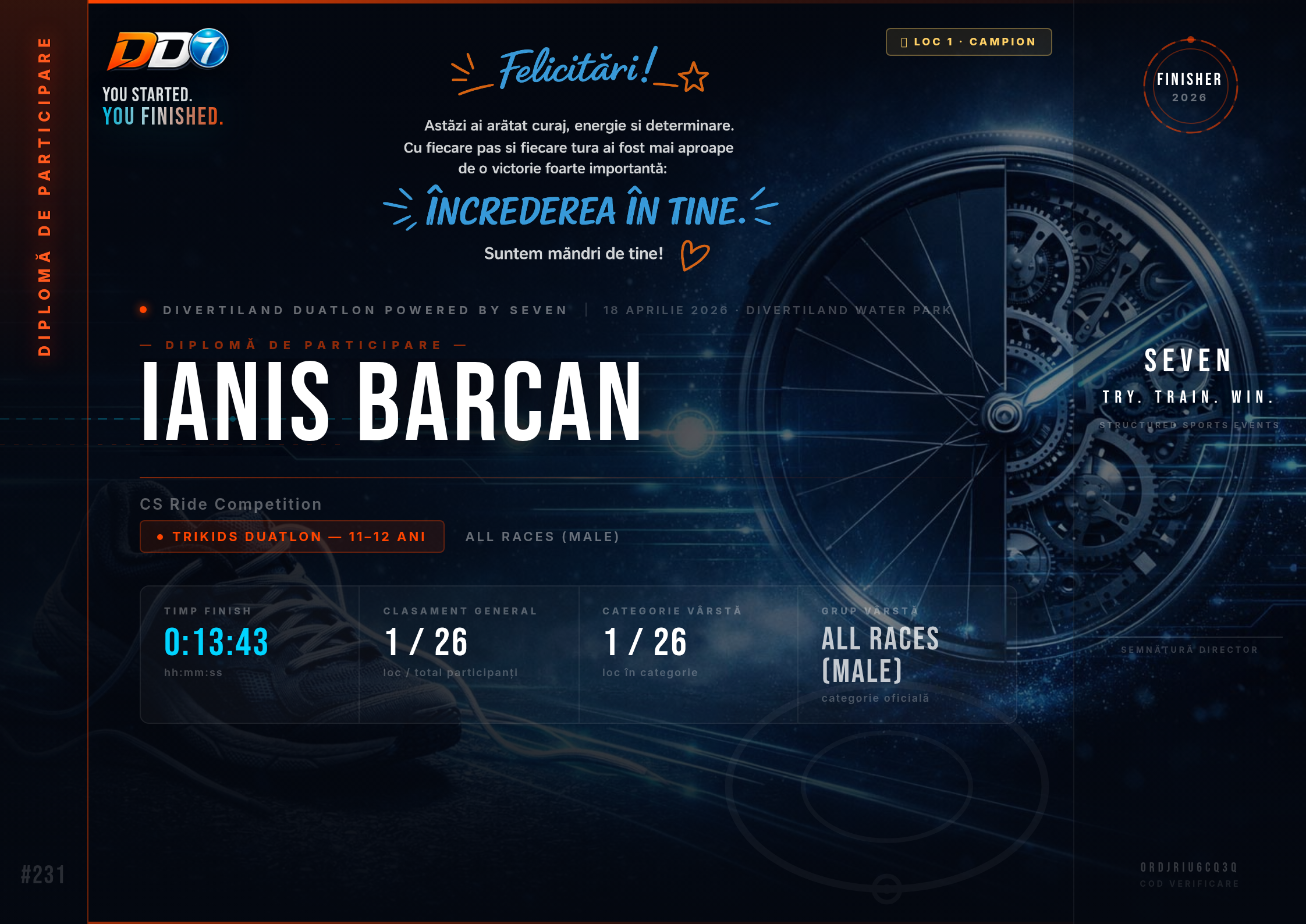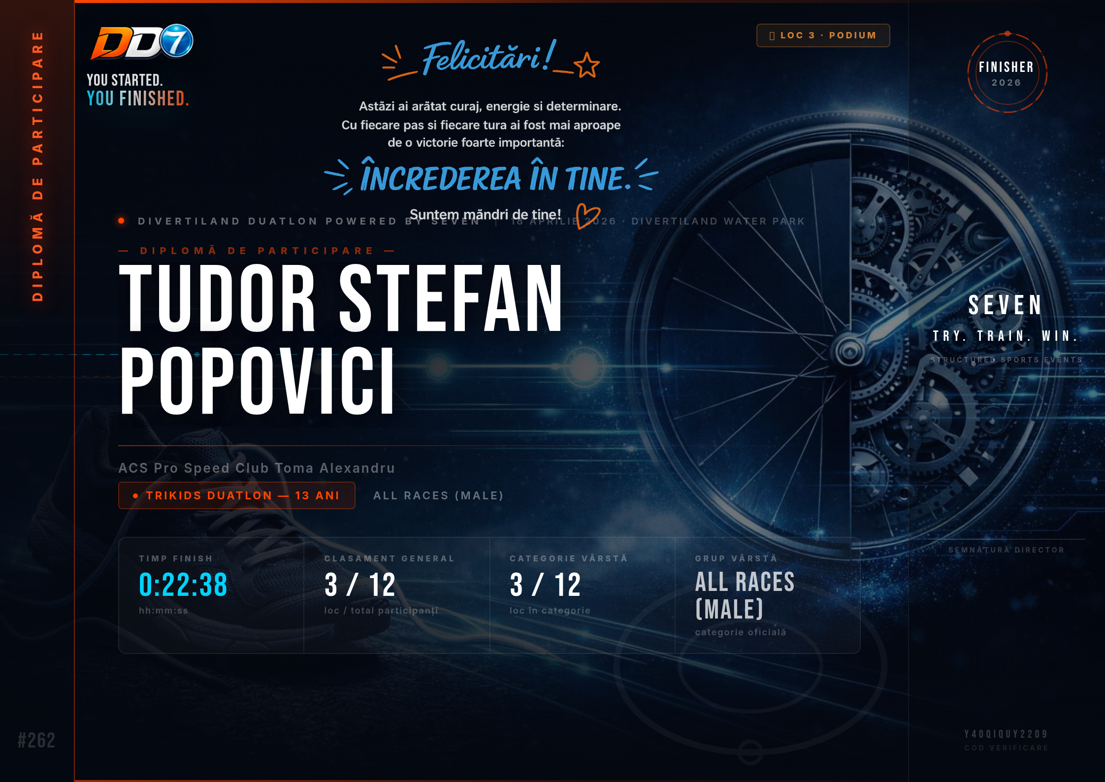 | 14 | Victor AdriaN Diaconescu | TRIKids 6-8 Ani | M | 162 | 0:01:07 | 0:00:59 | 0:05:36 | 0:01:38 | 0:09:19 | 📜 |