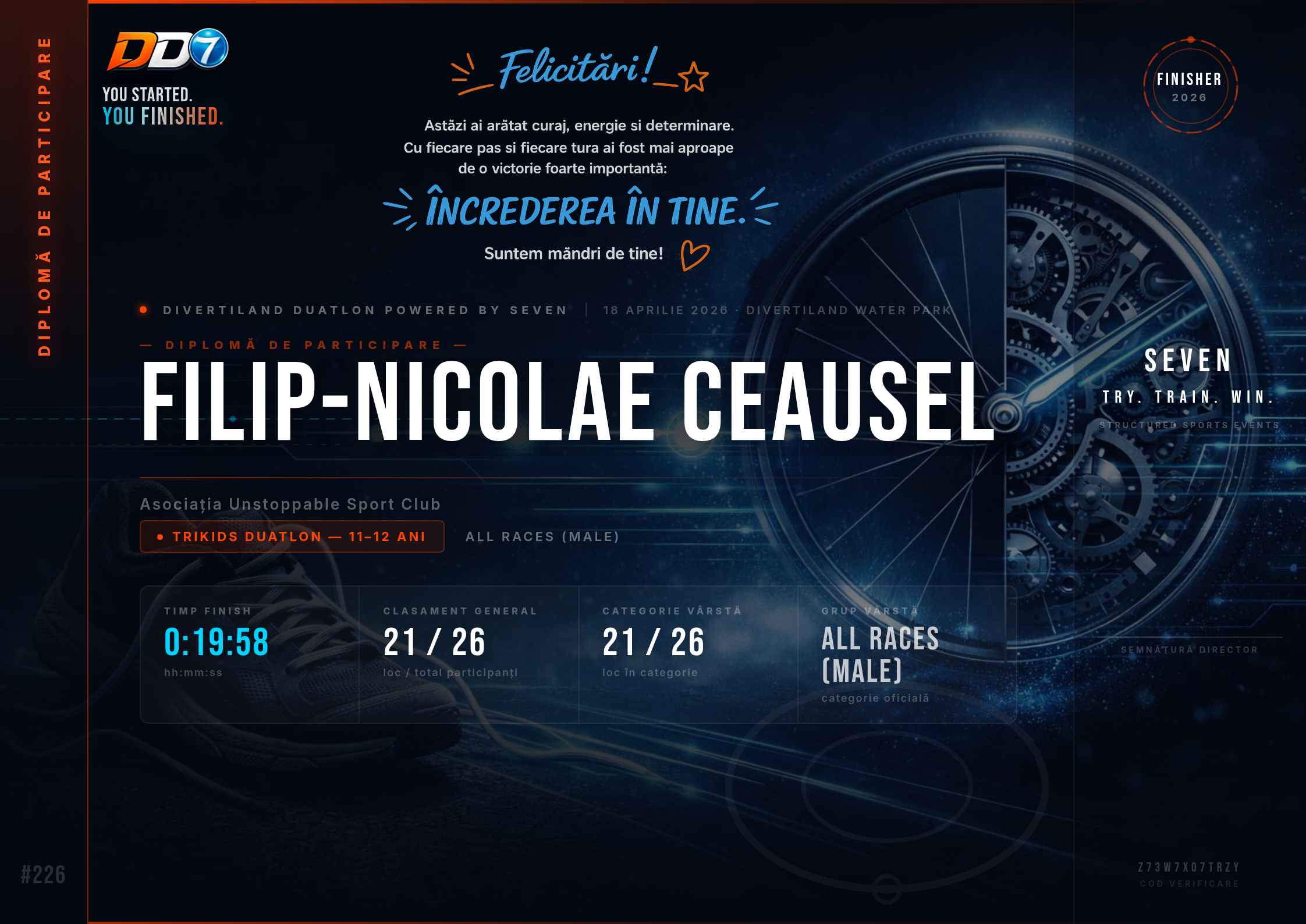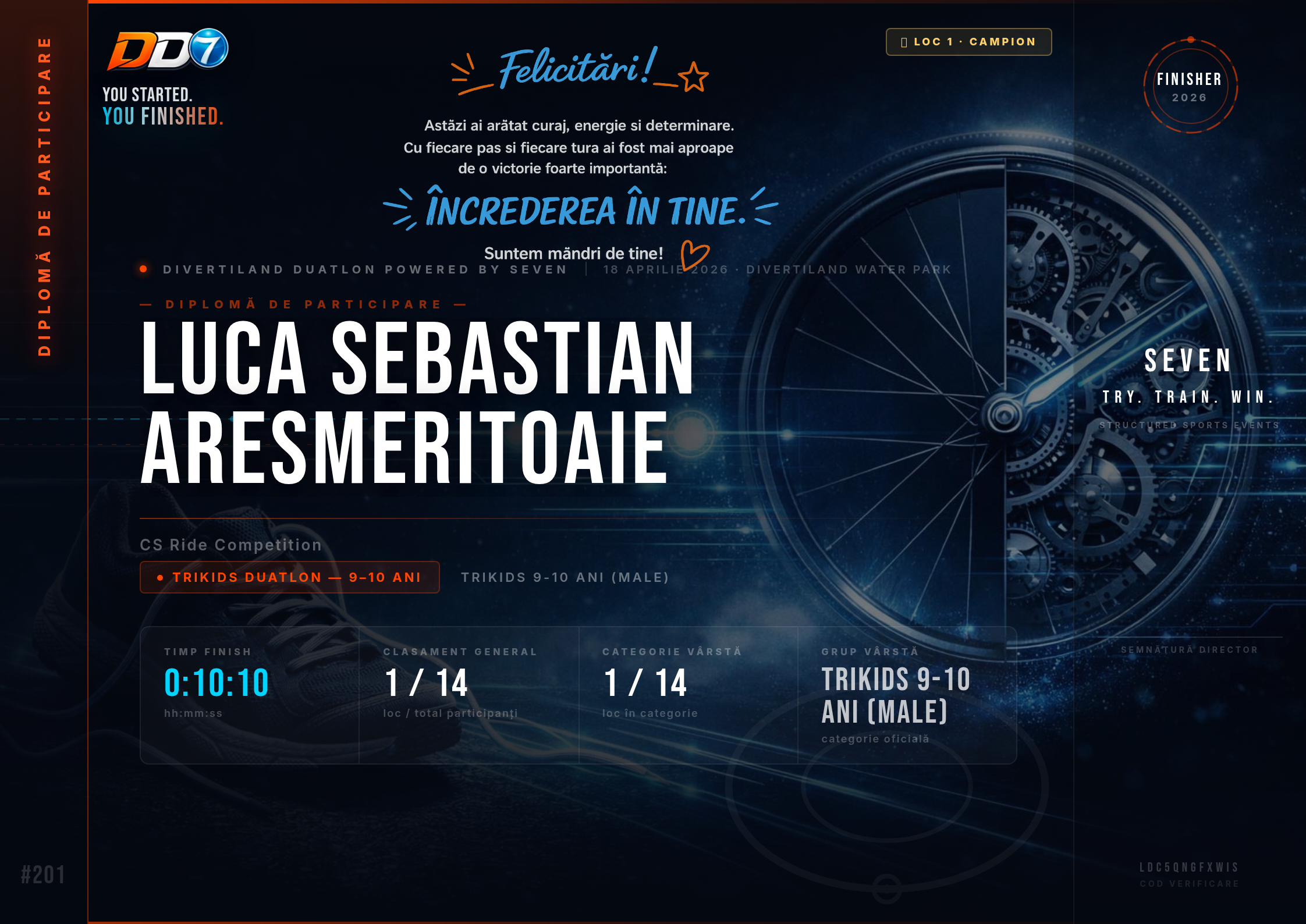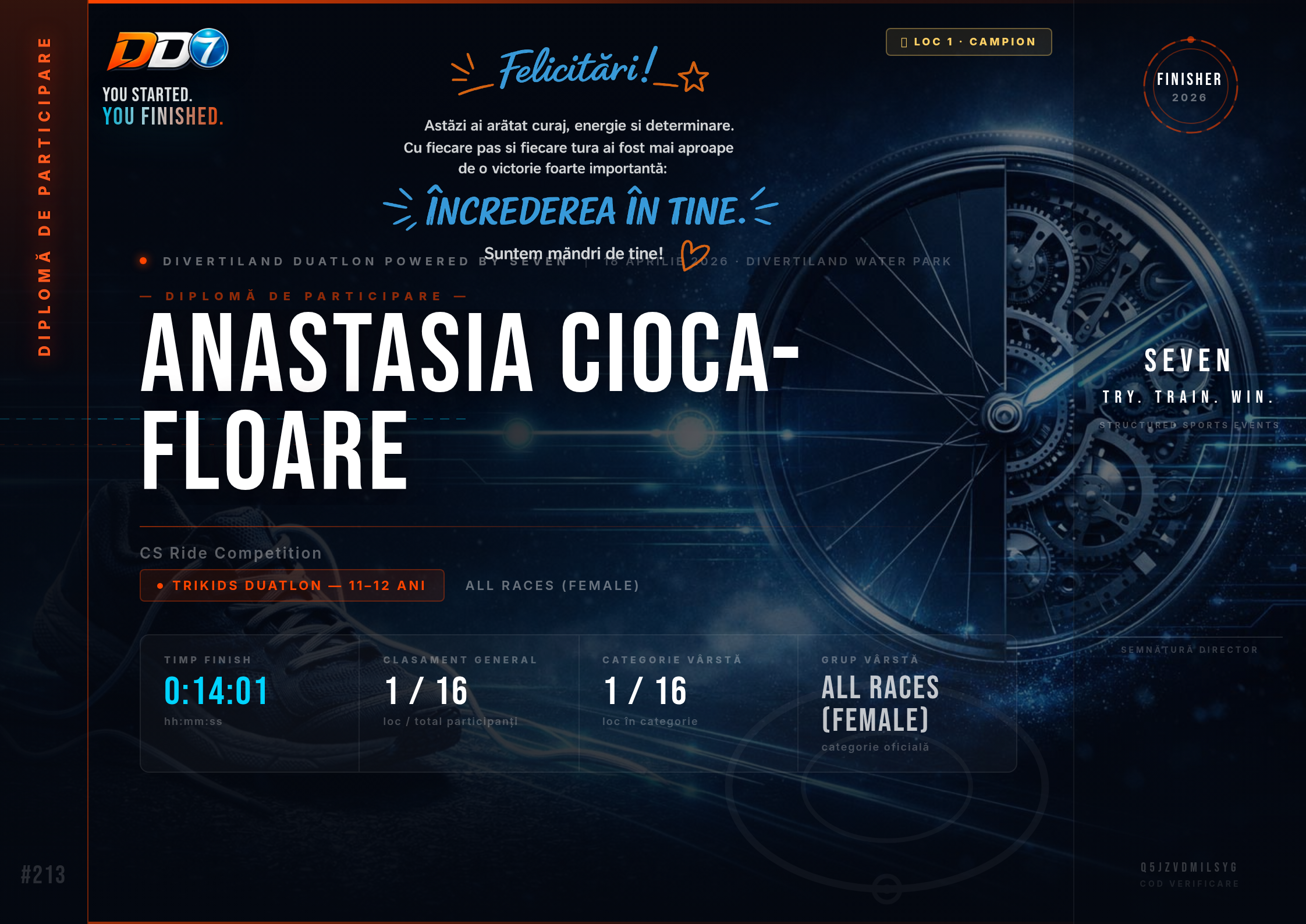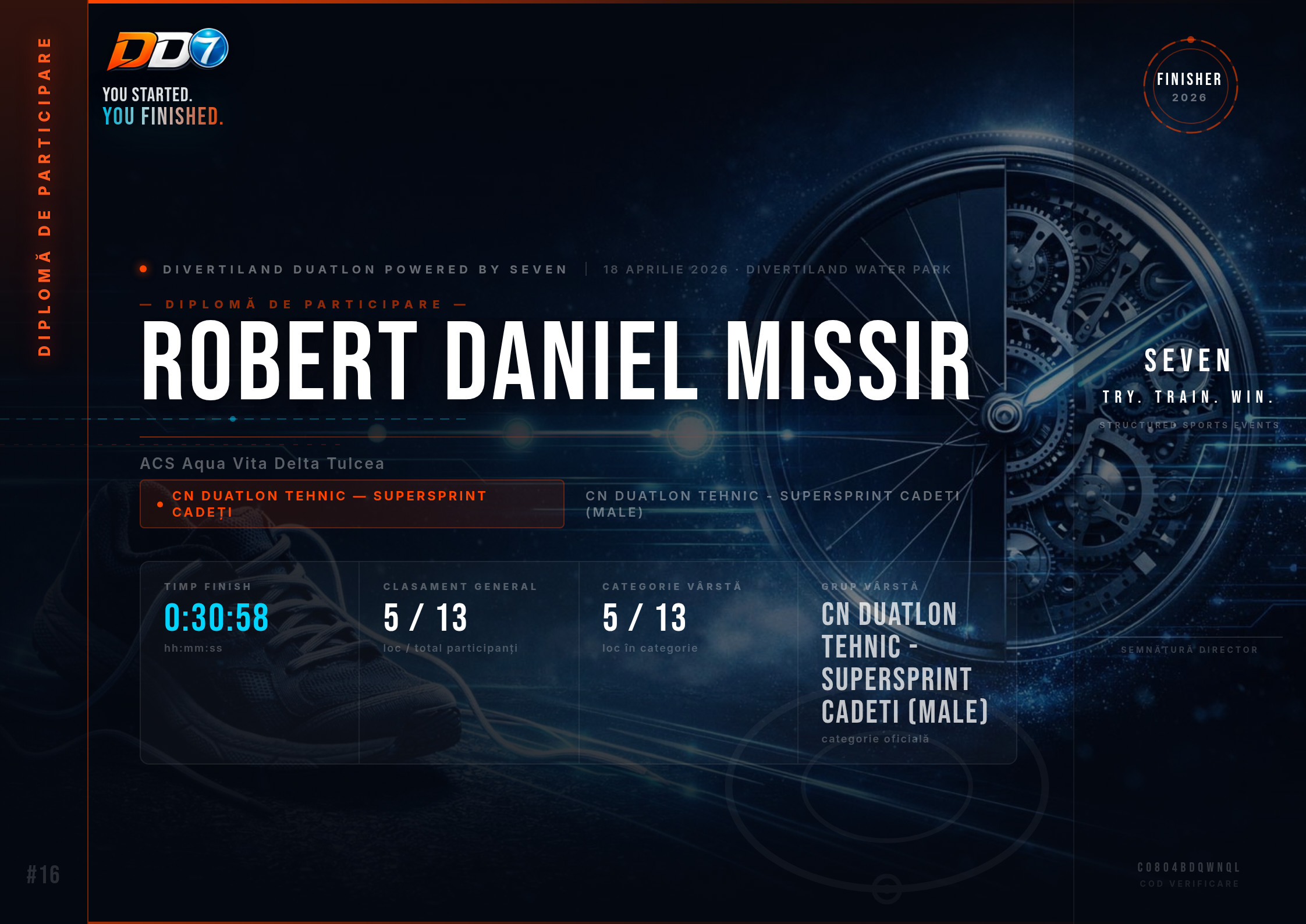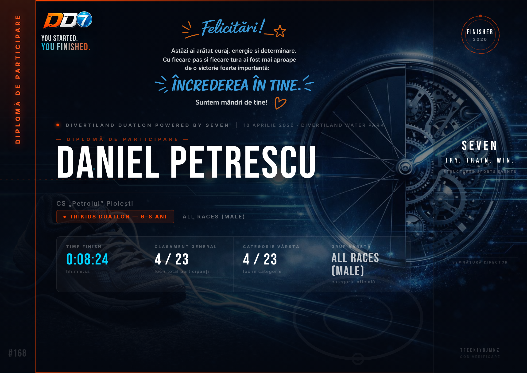 | 14 | Victor AdriaN Diaconescu | TRIKids 6-8 Ani | M | 162 | 0:01:07 | 0:00:59 | 0:05:36 | 0:01:38 | 0:09:19 | 📜 |