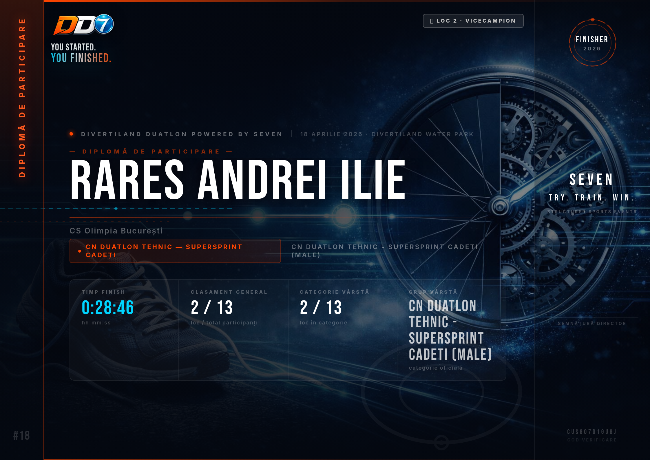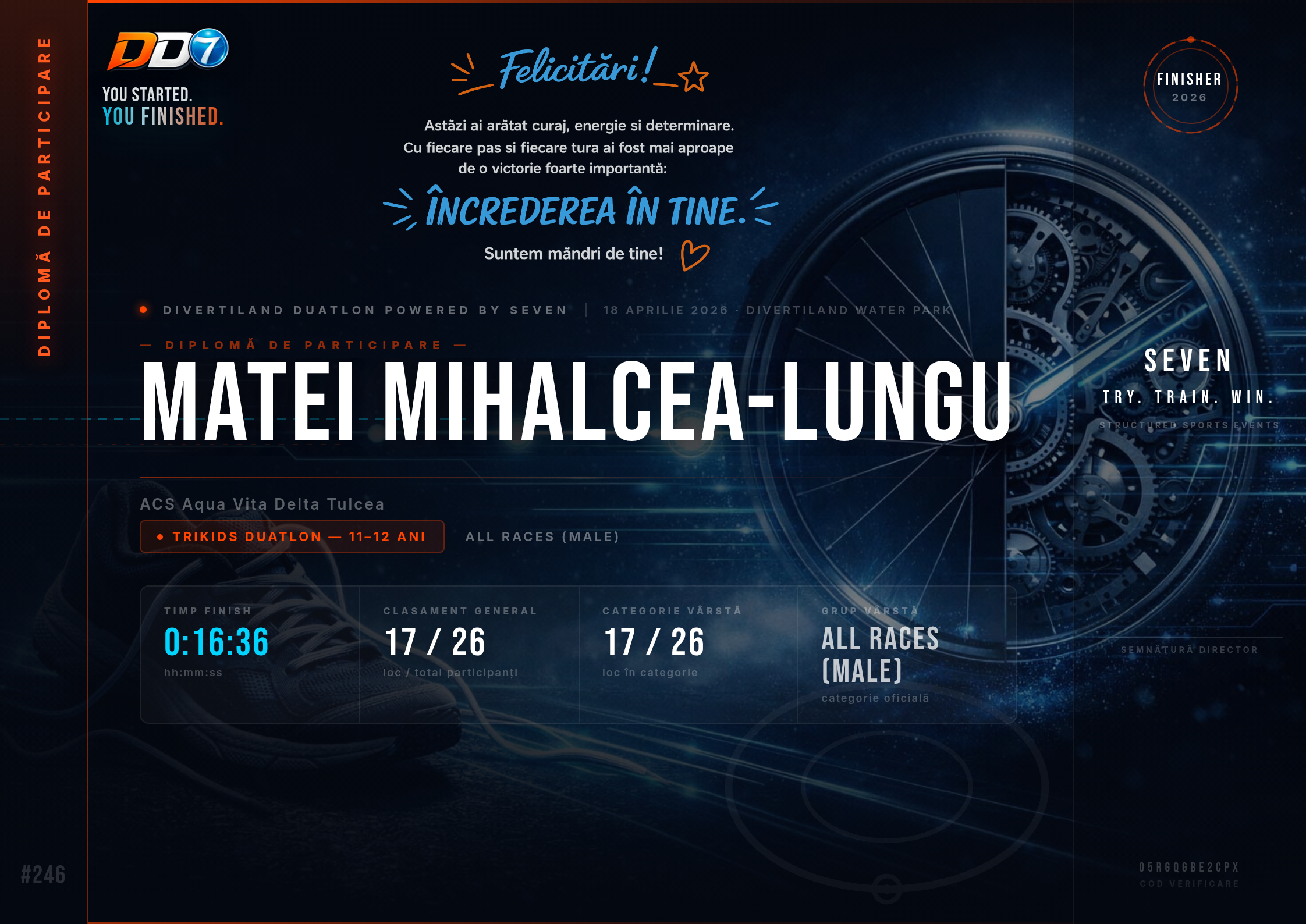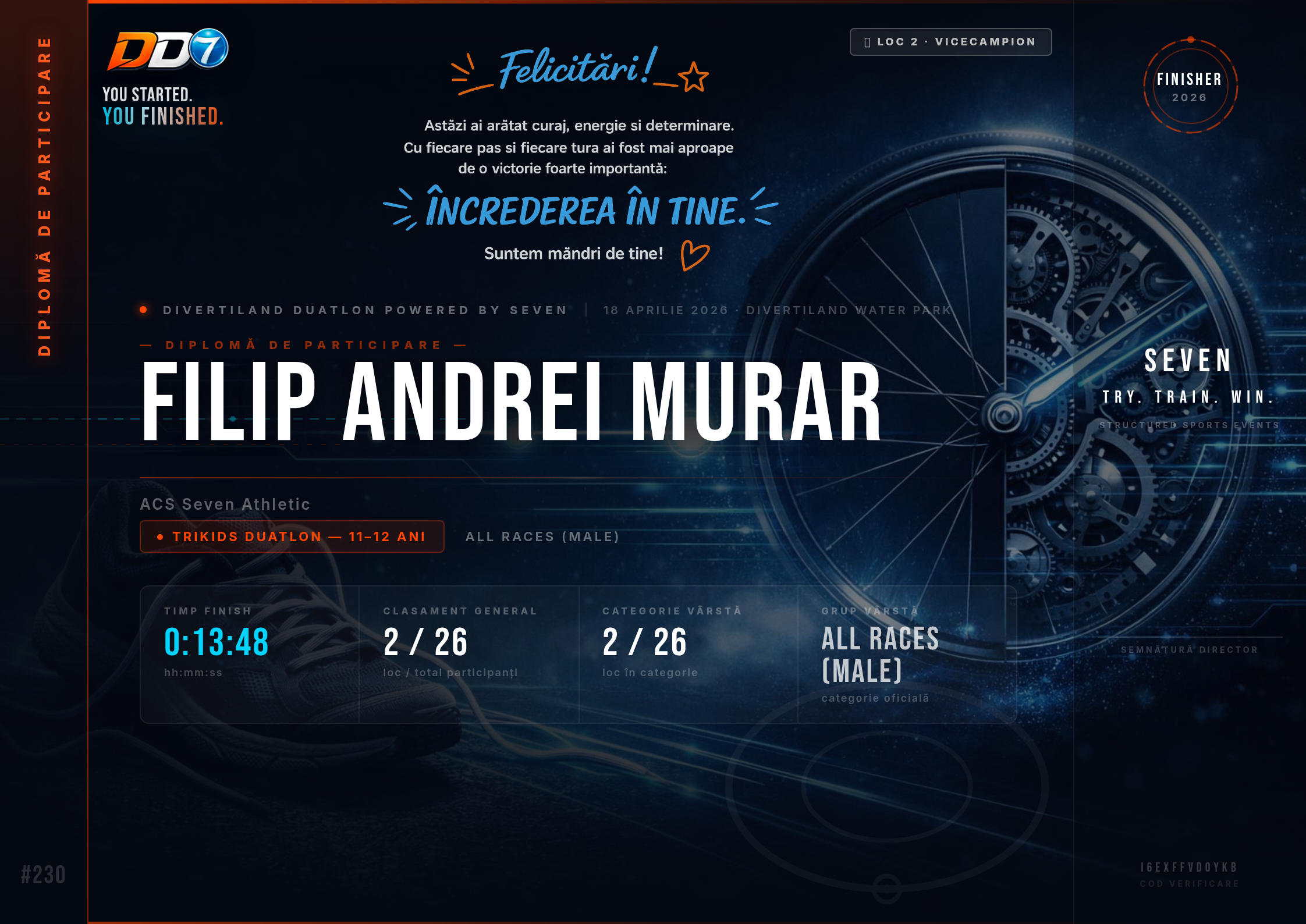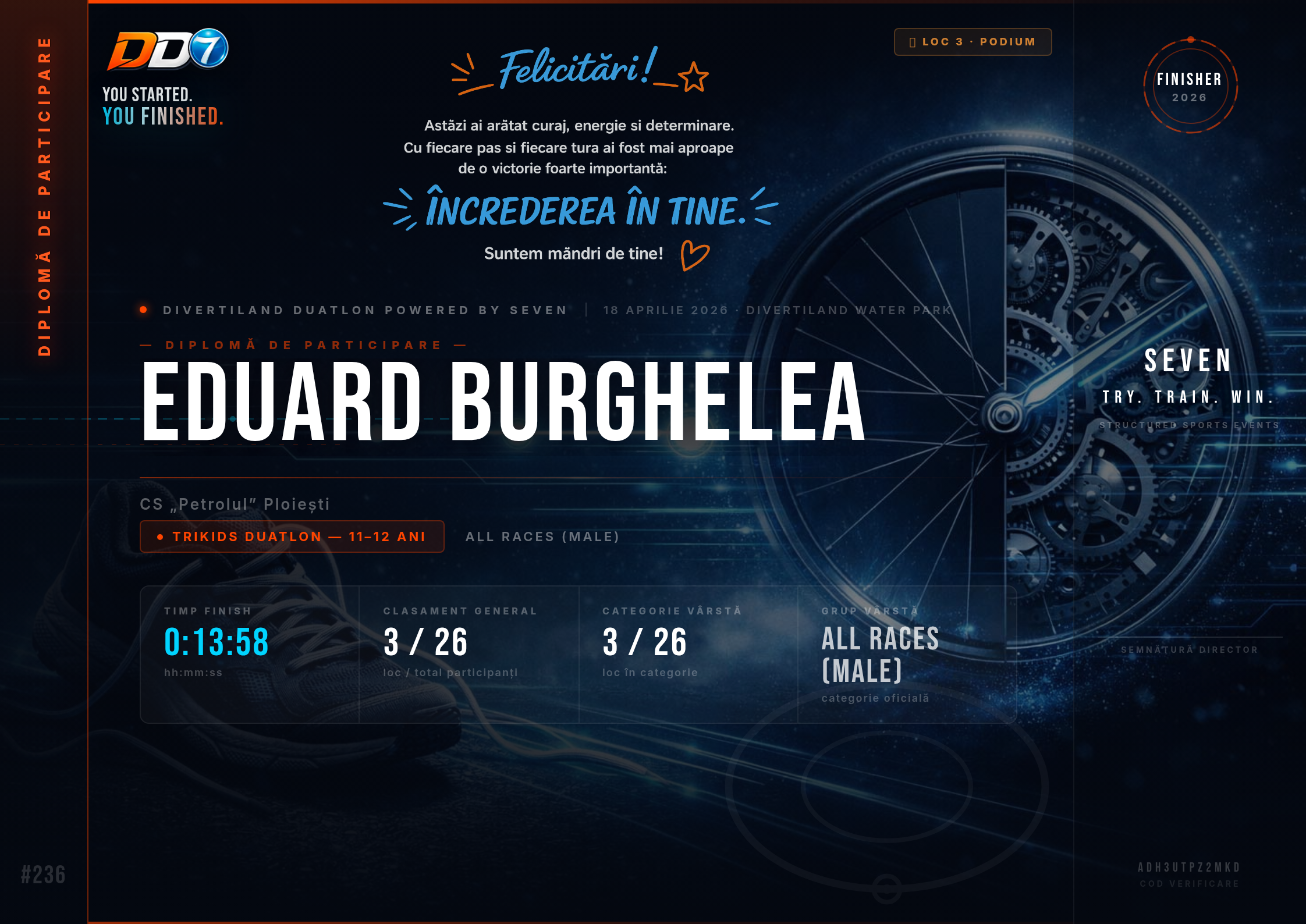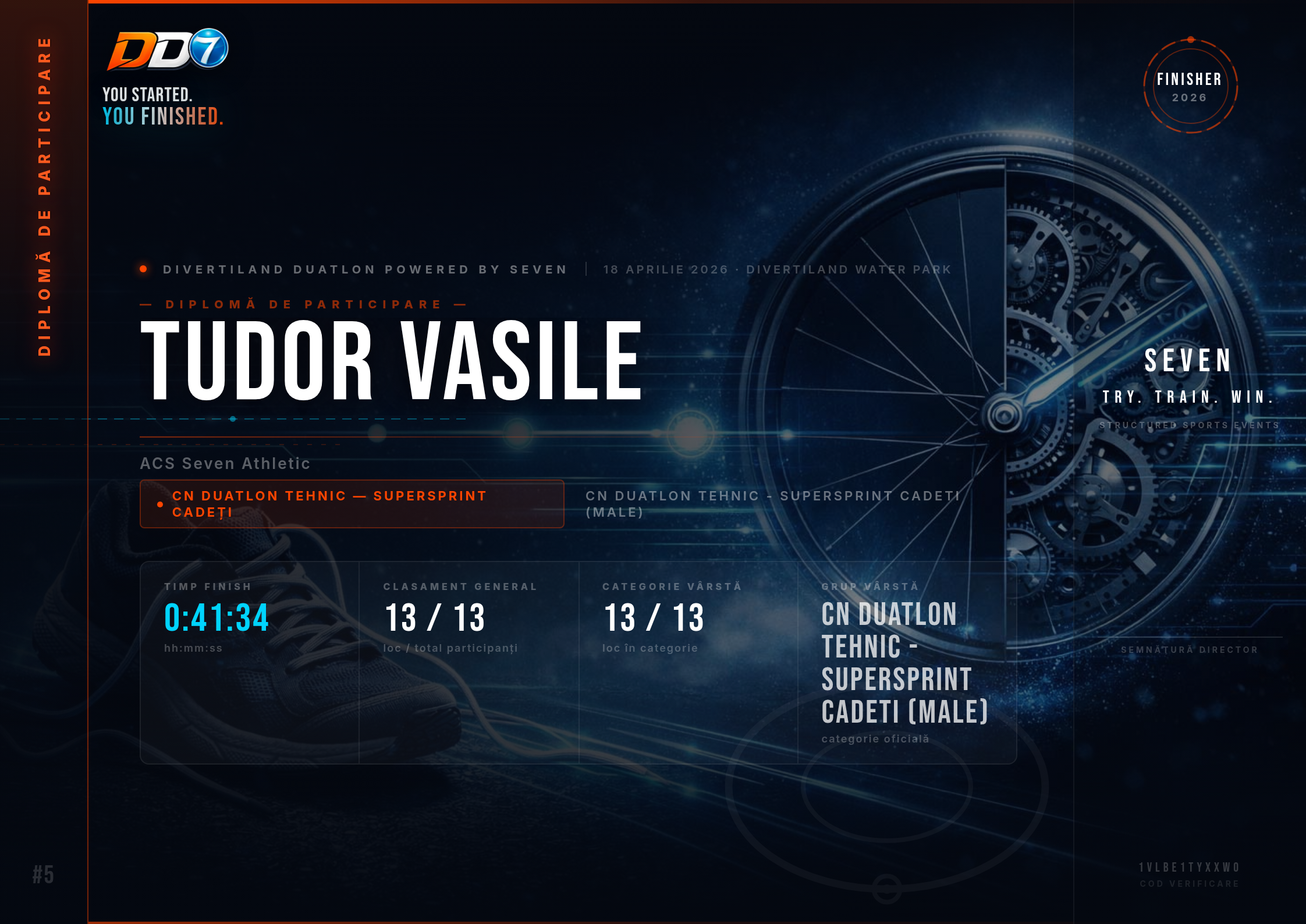 | 14 | Victor AdriaN Diaconescu | TRIKids 6-8 Ani | M | 162 | 0:01:07 | 0:00:59 | 0:05:36 | 0:01:38 | 0:09:19 | 📜 |