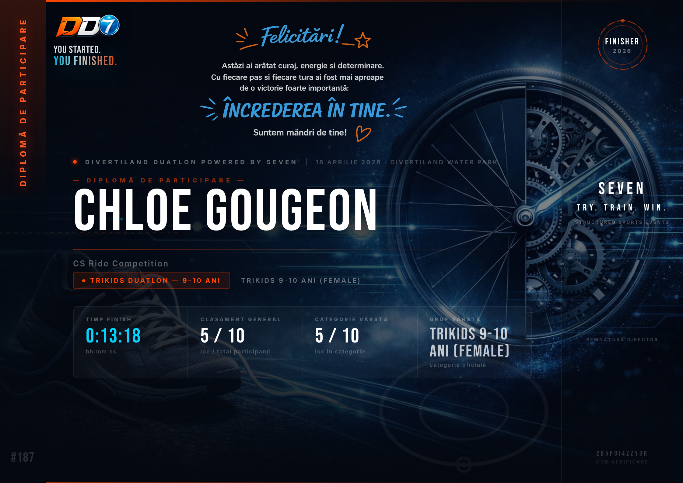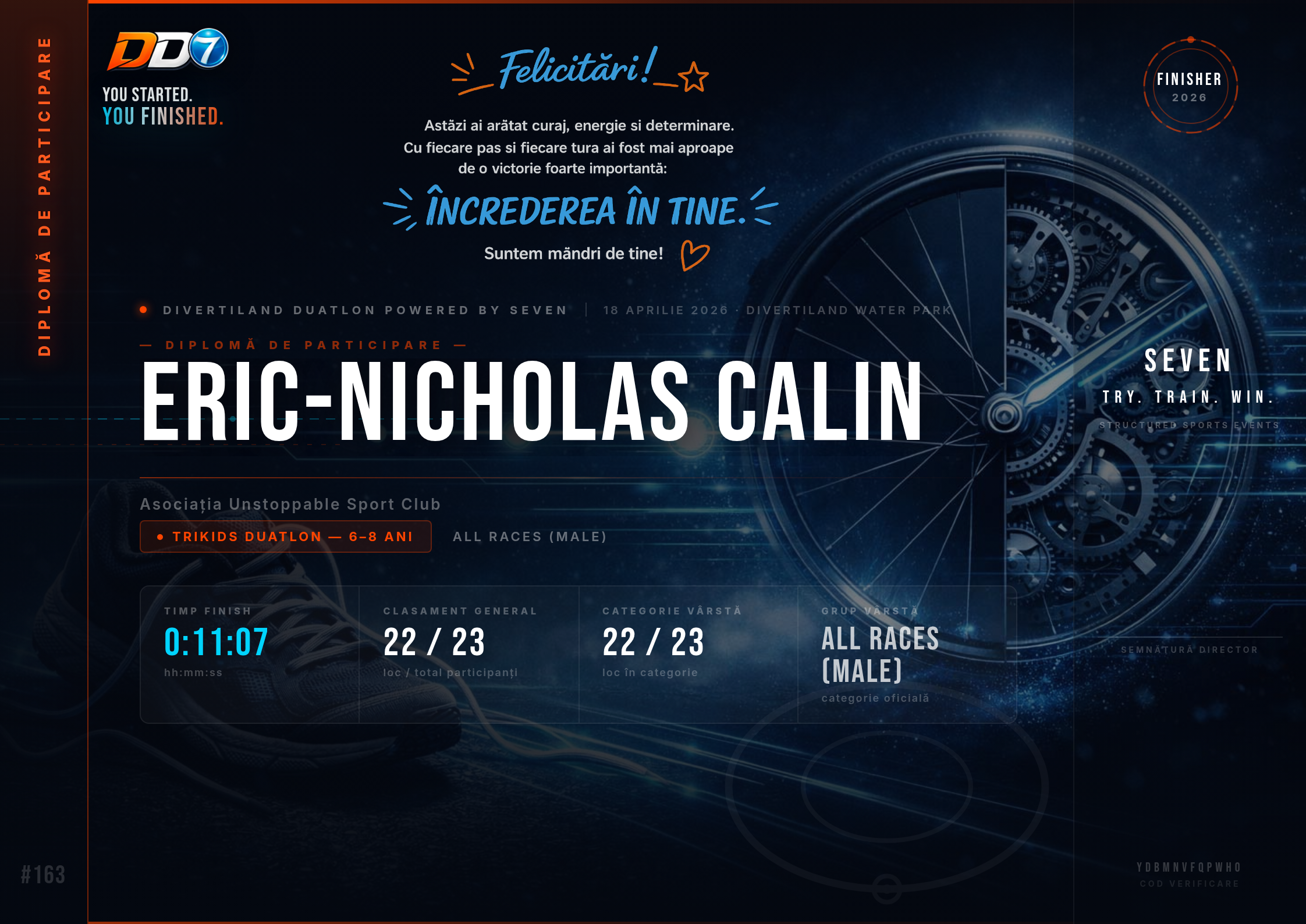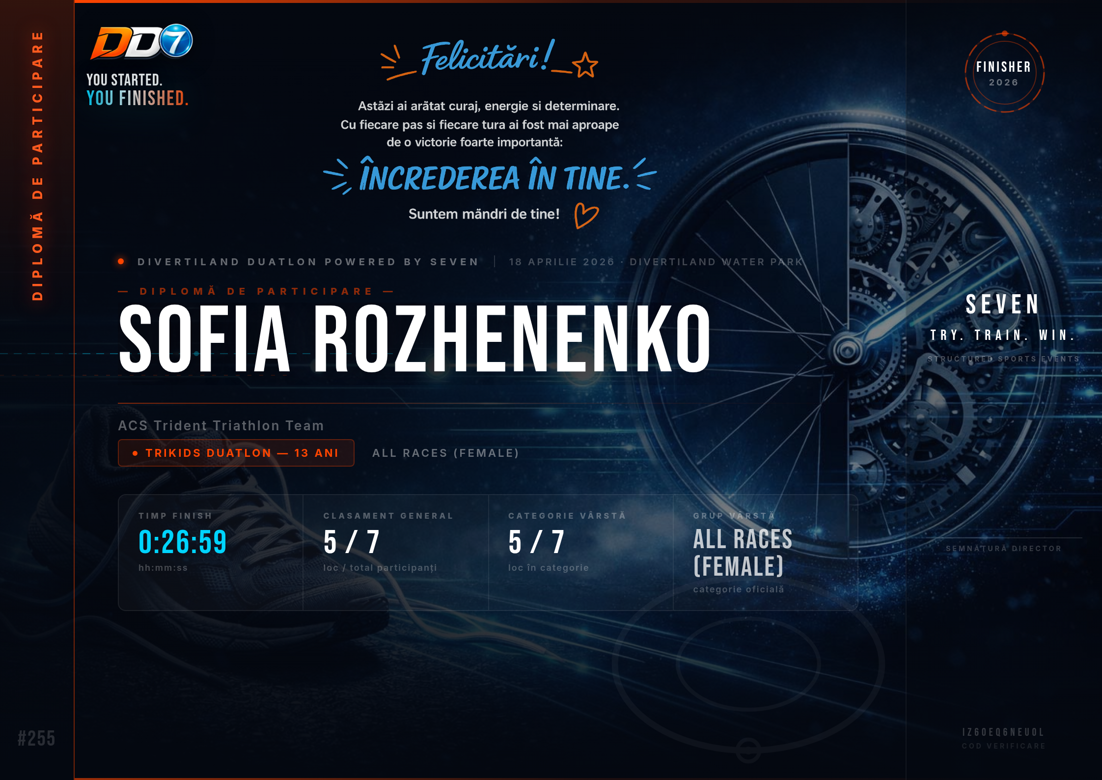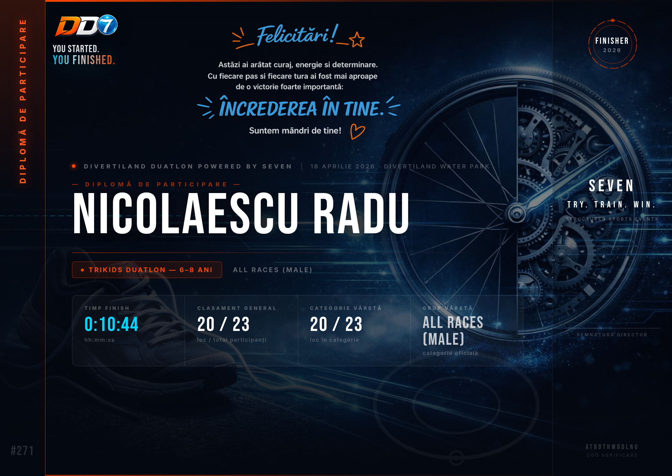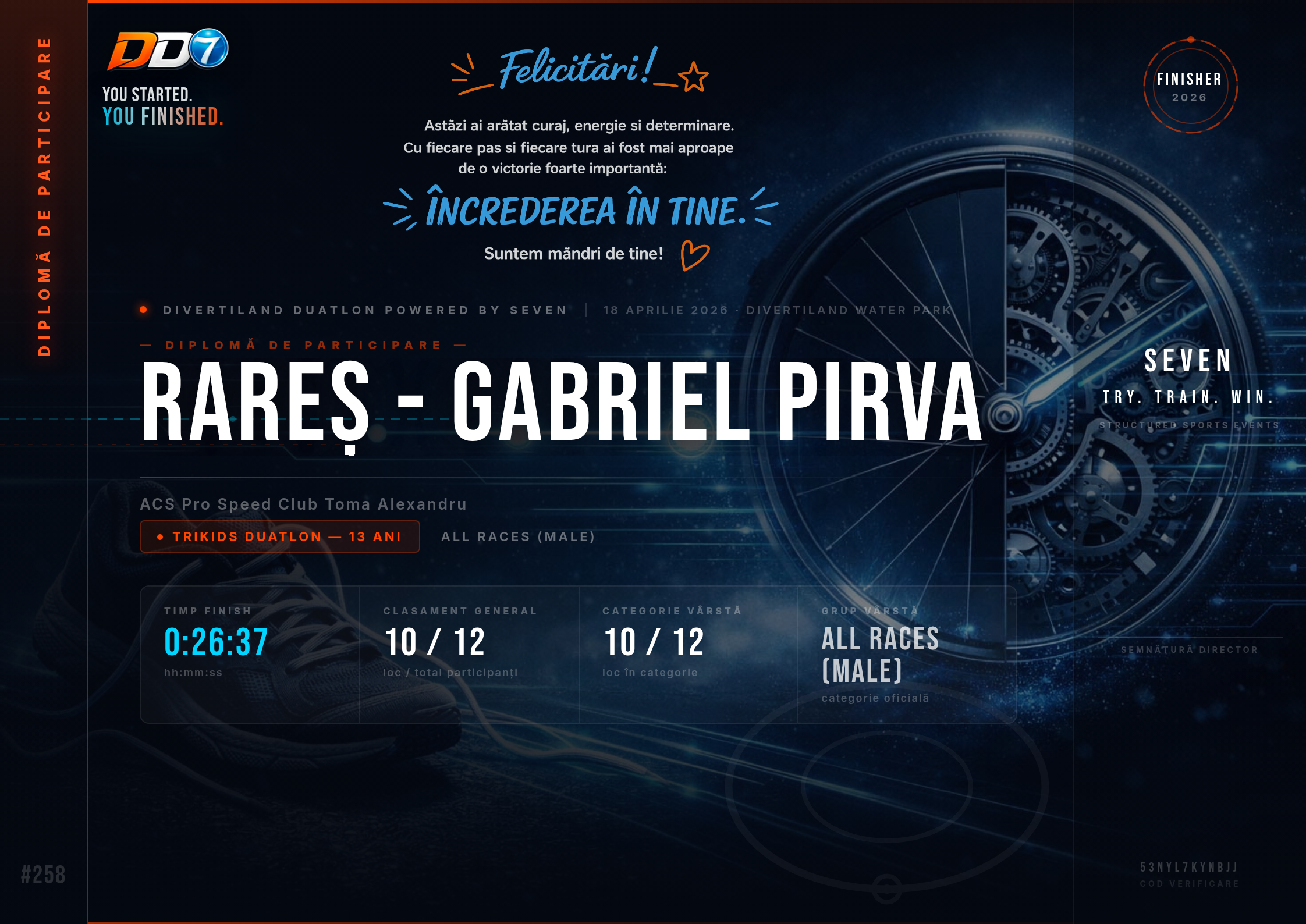 | 14 | Victor AdriaN Diaconescu | TRIKids 6-8 Ani | M | 162 | 0:01:07 | 0:00:59 | 0:05:36 | 0:01:38 | 0:09:19 | 📜 |