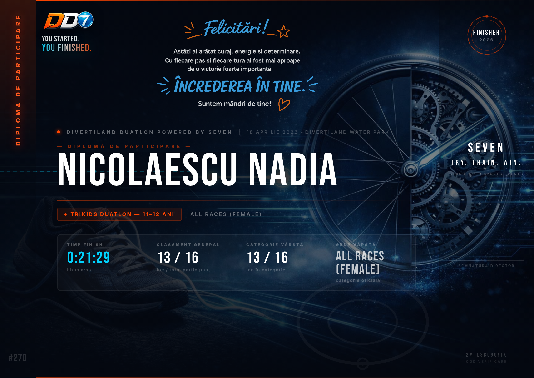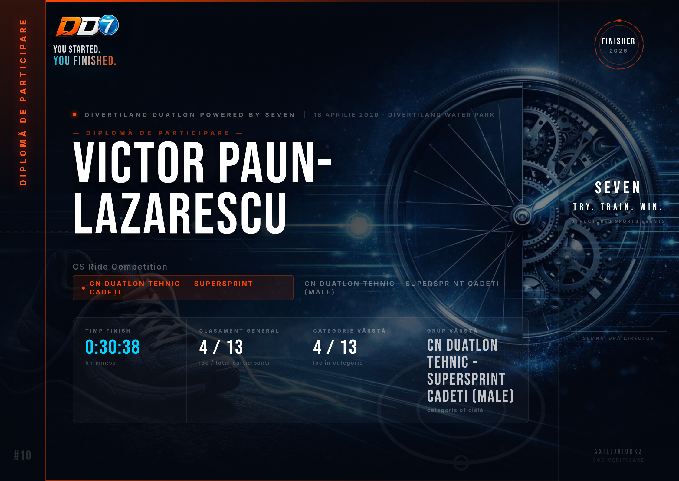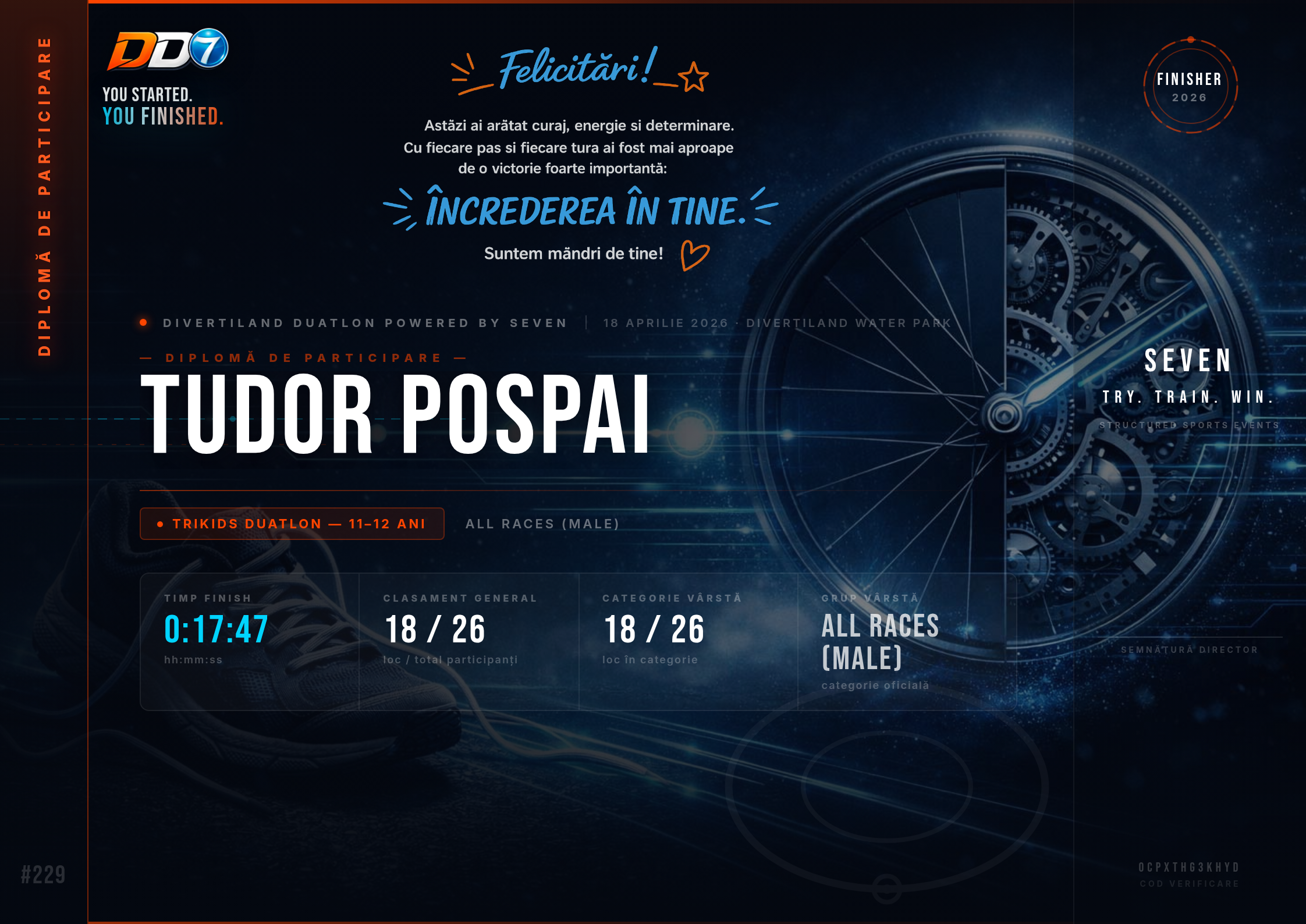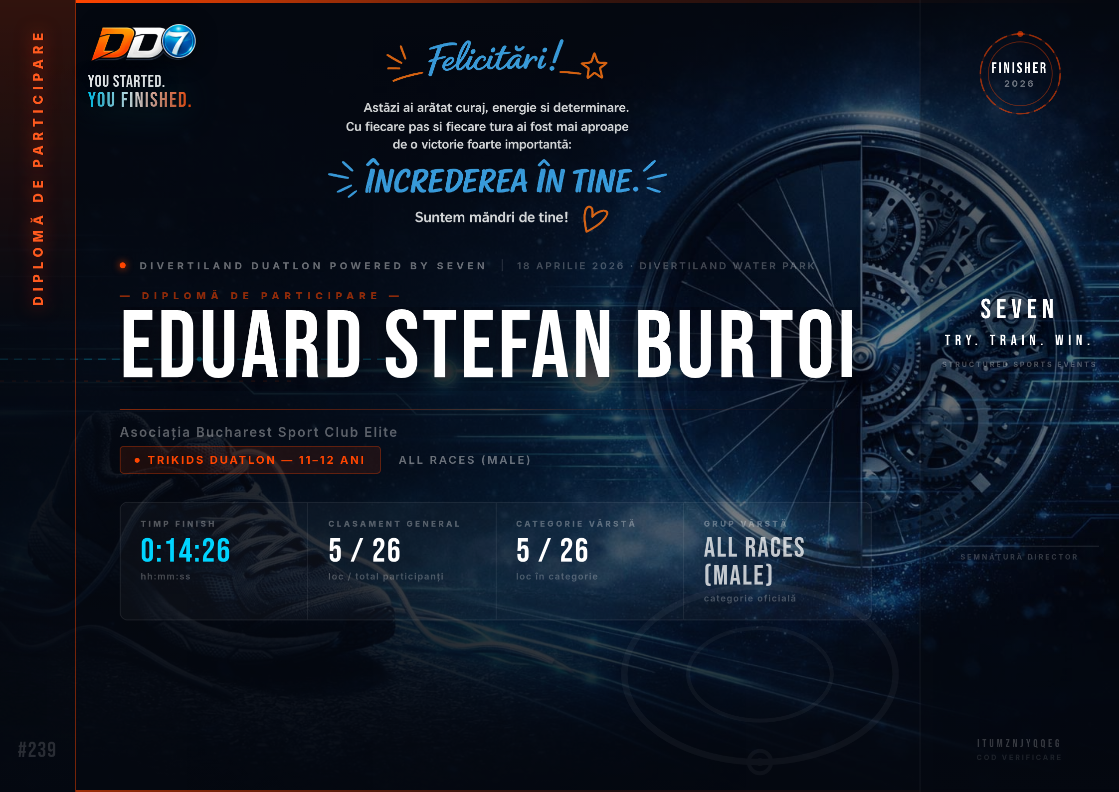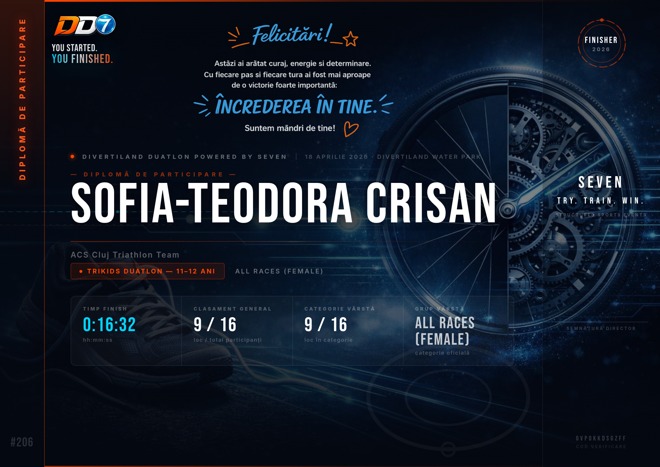 | 14 | Victor AdriaN Diaconescu | TRIKids 6-8 Ani | M | 162 | 0:01:07 | 0:00:59 | 0:05:36 | 0:01:38 | 0:09:19 | 📜 |
