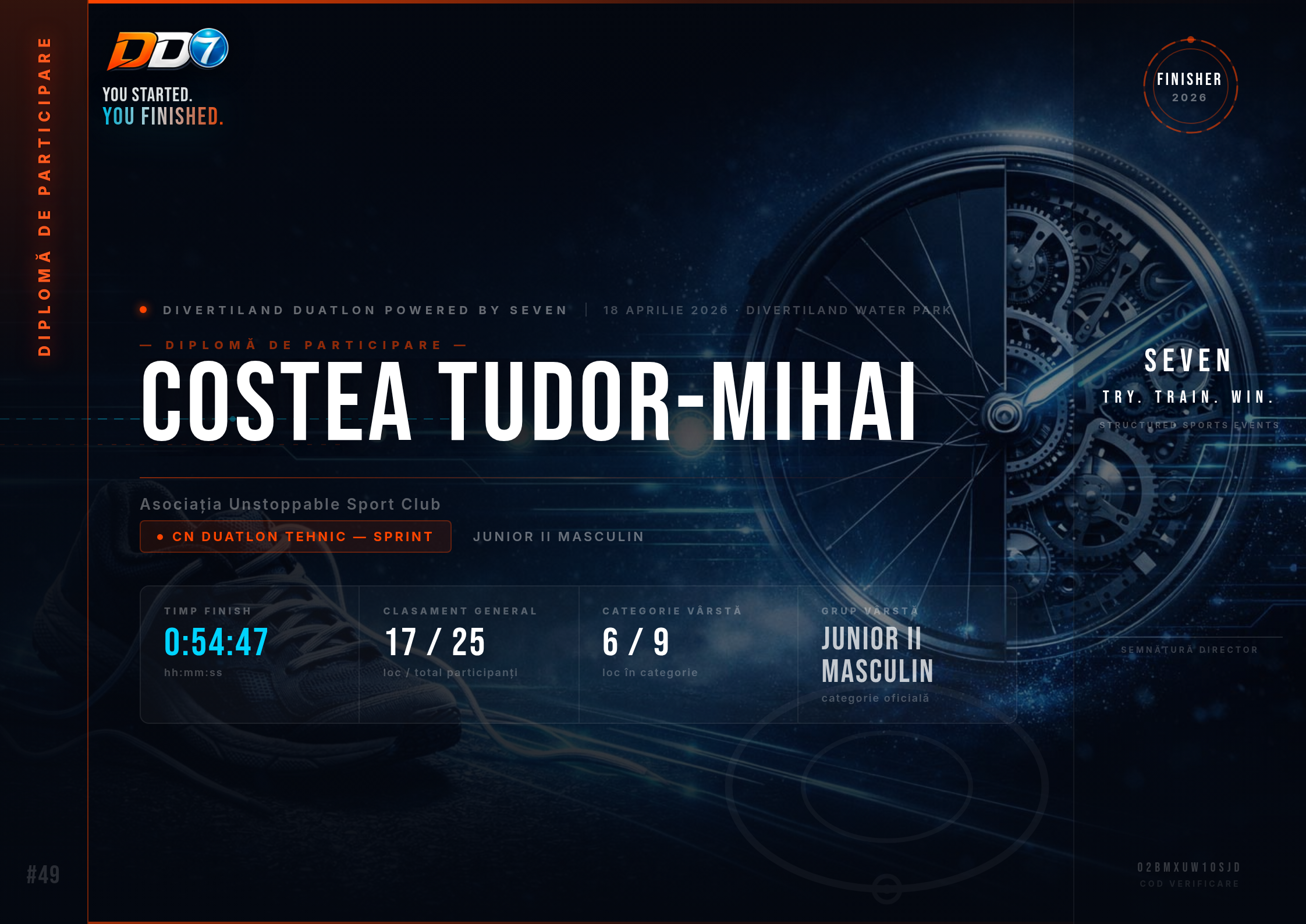 | 6 | 49 | Costea Tudor-Mihai | Junior II Masculin | CN Duatlon Tehnic - Sprint | M | 0:07:42 | 0:00:40 | 0:15:35 | 0:00:39 | 0:08:22 | 0:00:39 | 0:15:55 | 0:05:20 | 0:54:47 | 📜 |