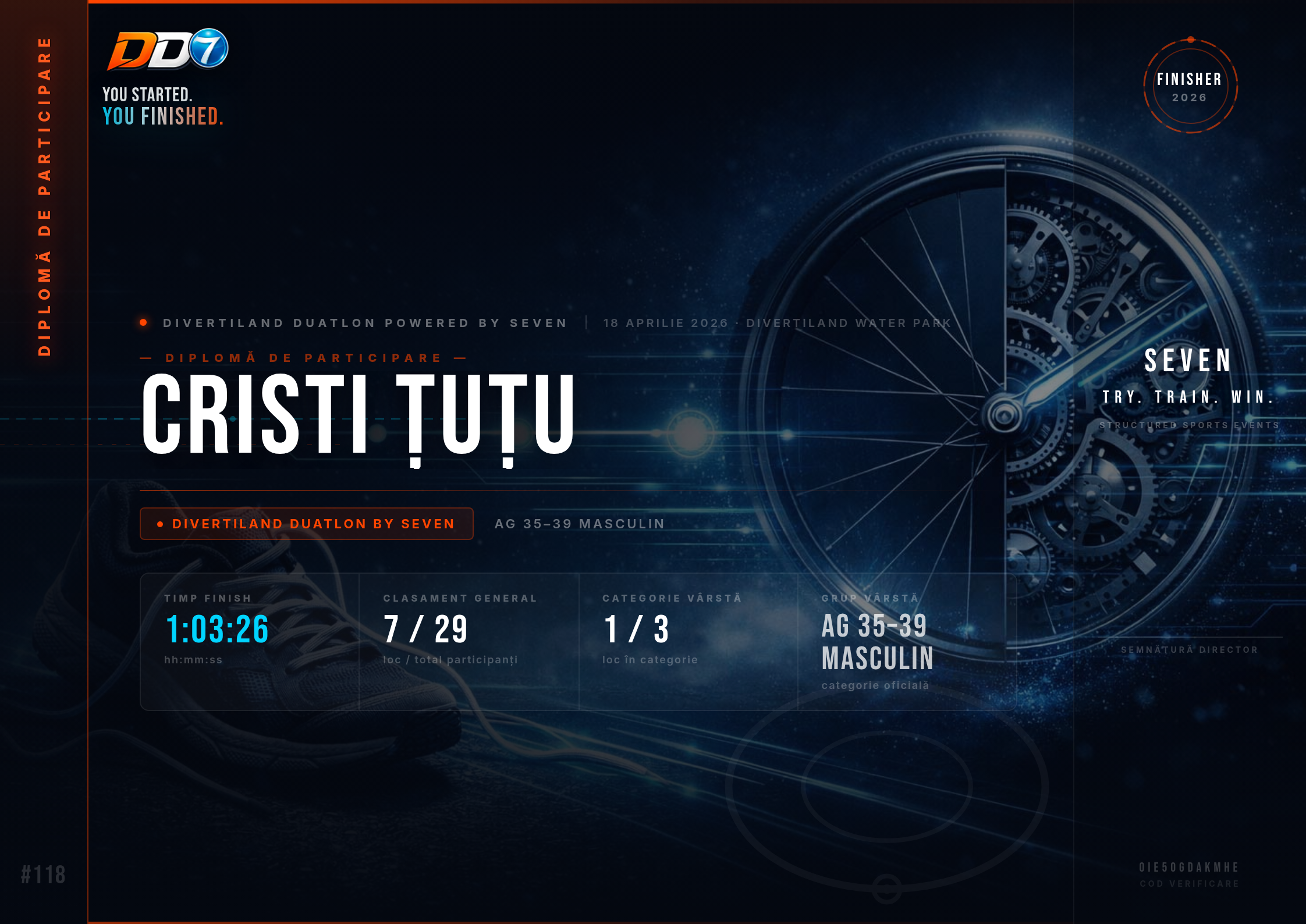 | 1 | 118 | Cristi Țuțu | AG 35–39 Masculin | M | 0:09:53 | 0:01:18 | 0:17:03 | 0:01:10 | 0:09:56 | 0:01:11 | 0:17:03 | 0:05:56 | 1:03:26 | 📜 |