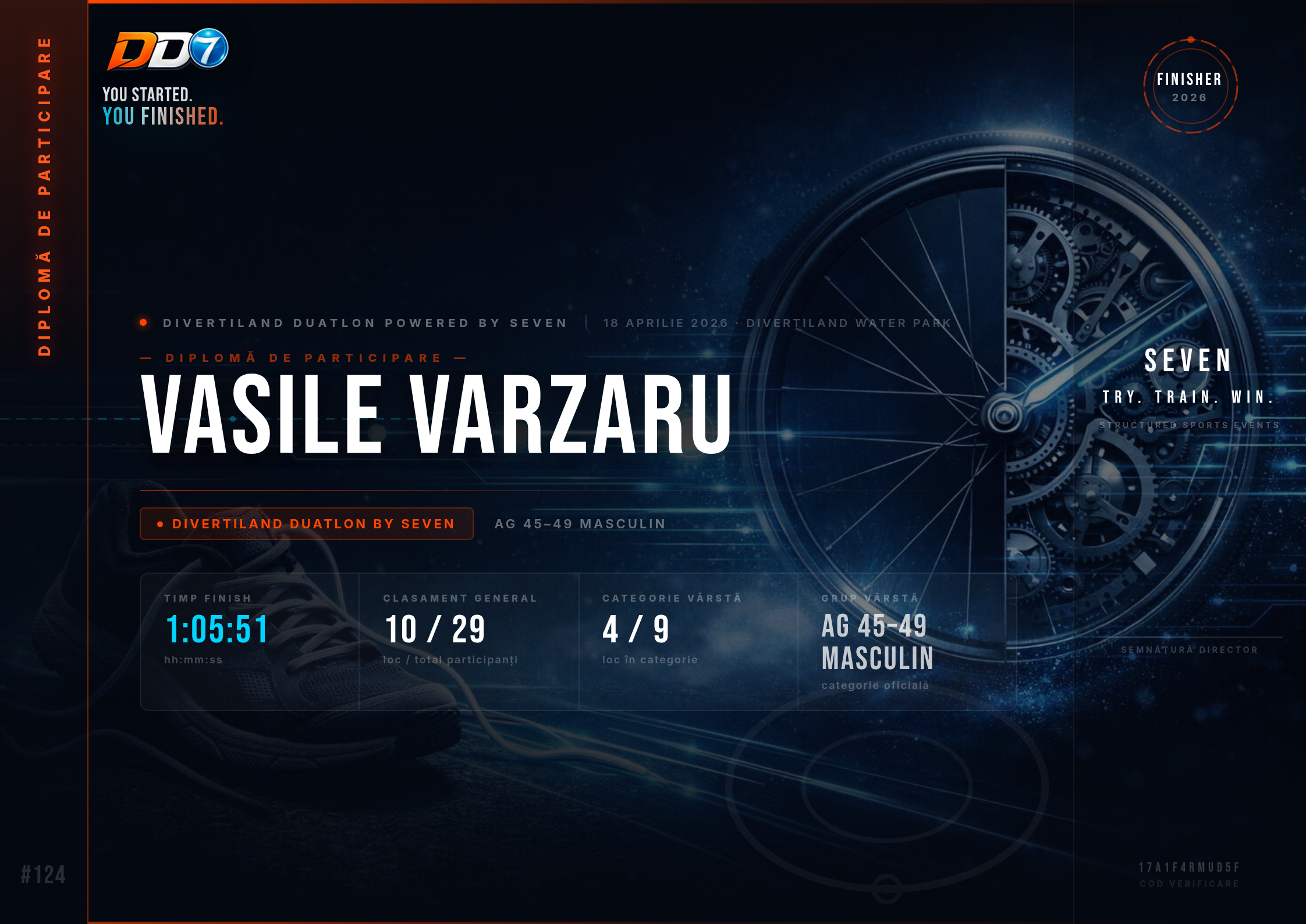 | 4 | 124 | VASILE VARZARU | AG 45–49 Masculin | M | 0:10:27 | 0:00:52 | 0:18:28 | 0:00:58 | 0:11:19 | 0:01:01 | 0:18:46 | 0:04:03 | 1:05:51 | 📜 |