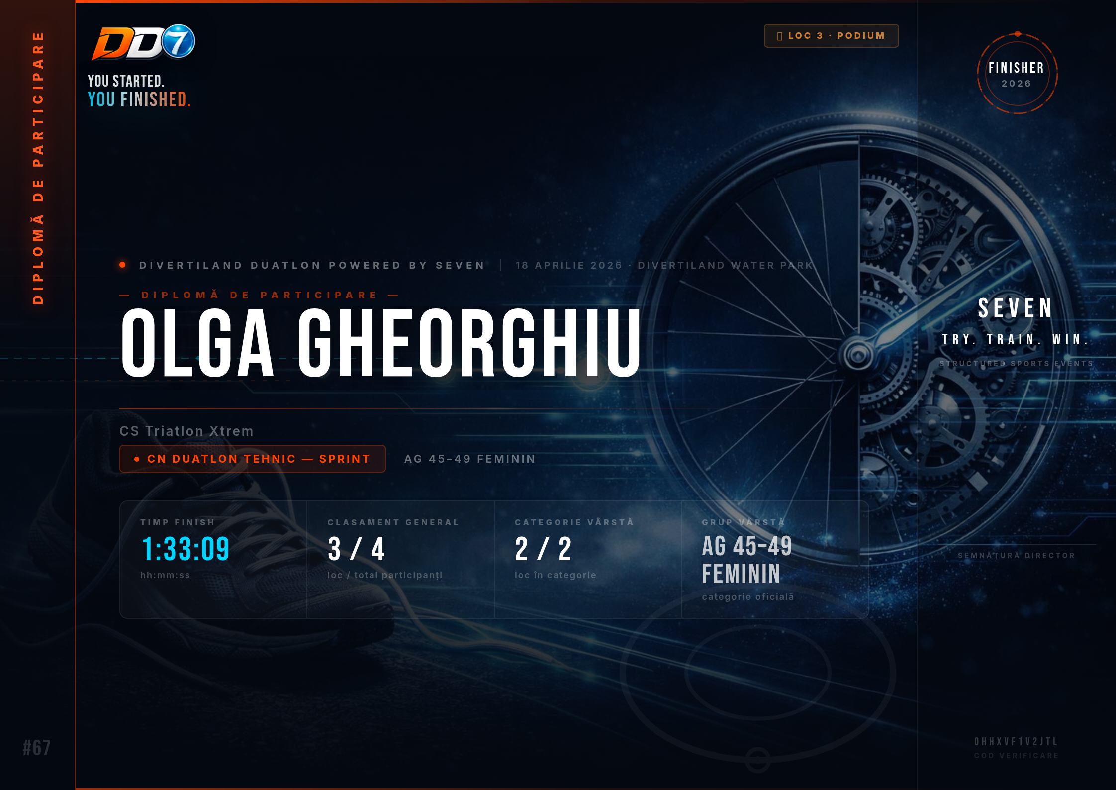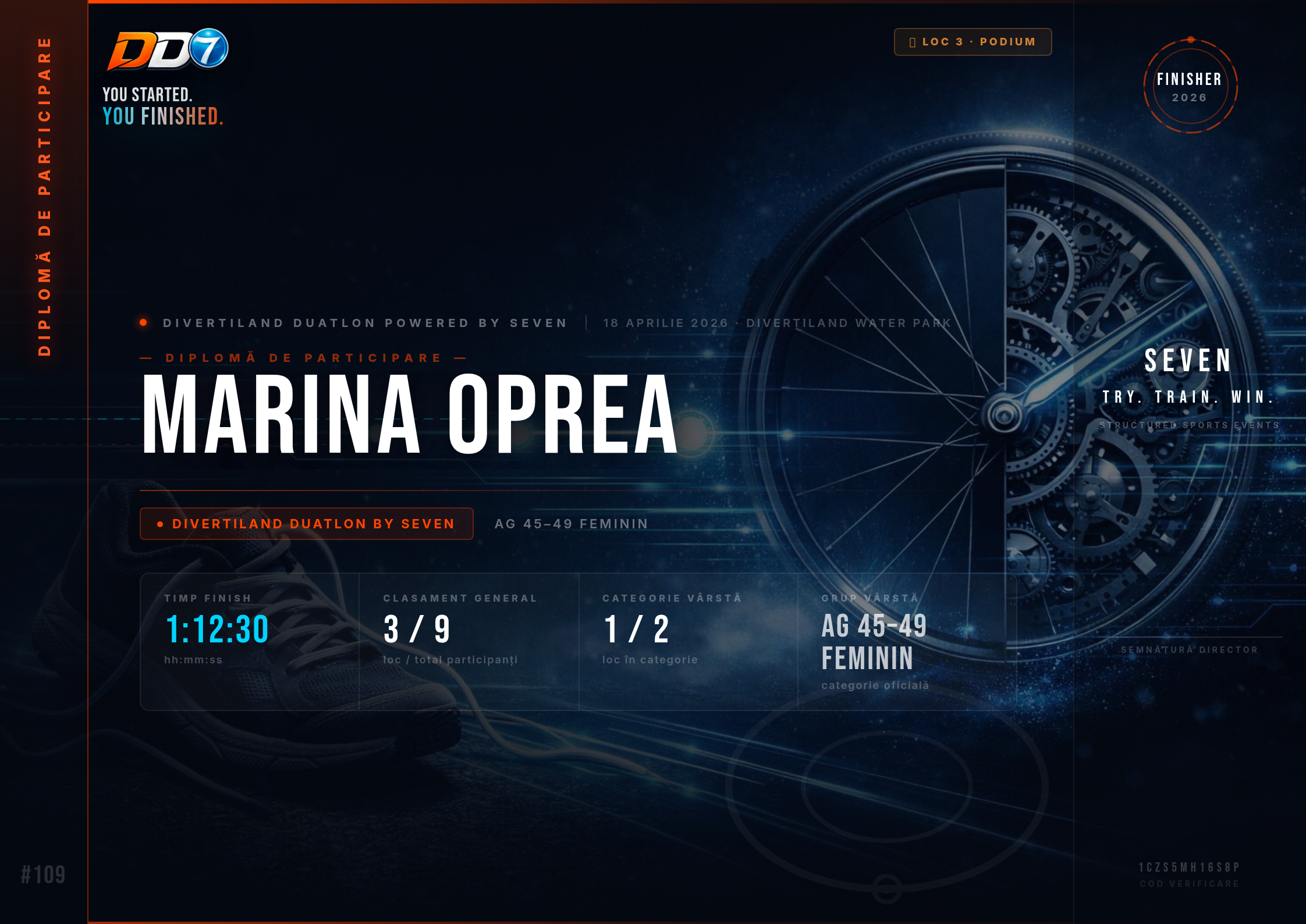 | 1 | 109 | Marina Oprea | AG 45–49 Feminin | F | 0:09:42 | 0:00:50 | 0:20:49 | 0:00:46 | 0:11:09 | 0:00:55 | 0:21:26 | 0:06:57 | 1:12:30 | 📜 |