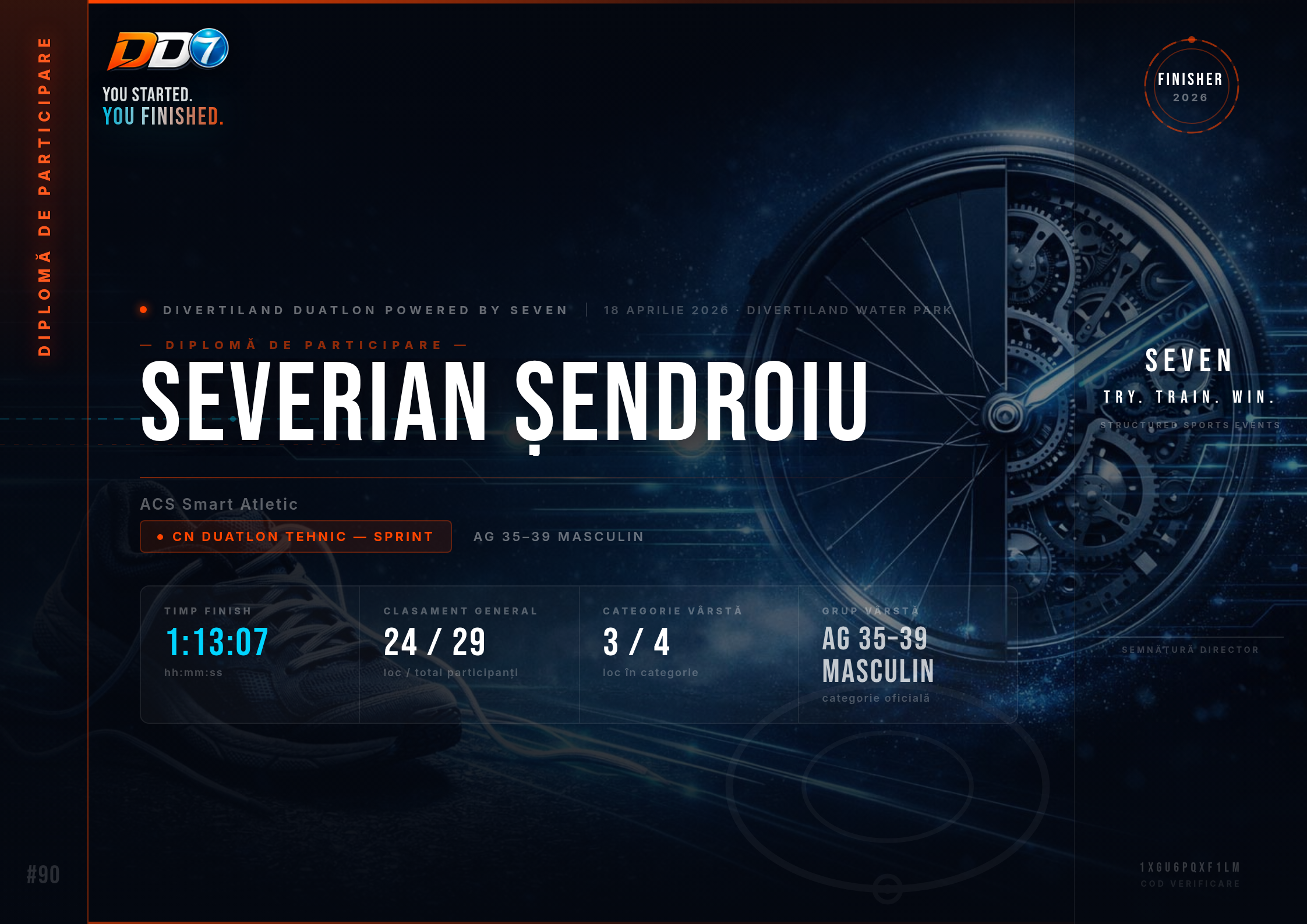 | 3 | 90 | Severian Șendroiu | AG 35–39 Masculin | CN de Duatlon Tehnic - Sprint AG | M | 0:11:02 | 0:00:49 | 0:18:15 | 0:00:53 | 0:14:02 | 0:00:49 | 0:19:24 | 0:07:56 | 1:13:07 | 📜 |