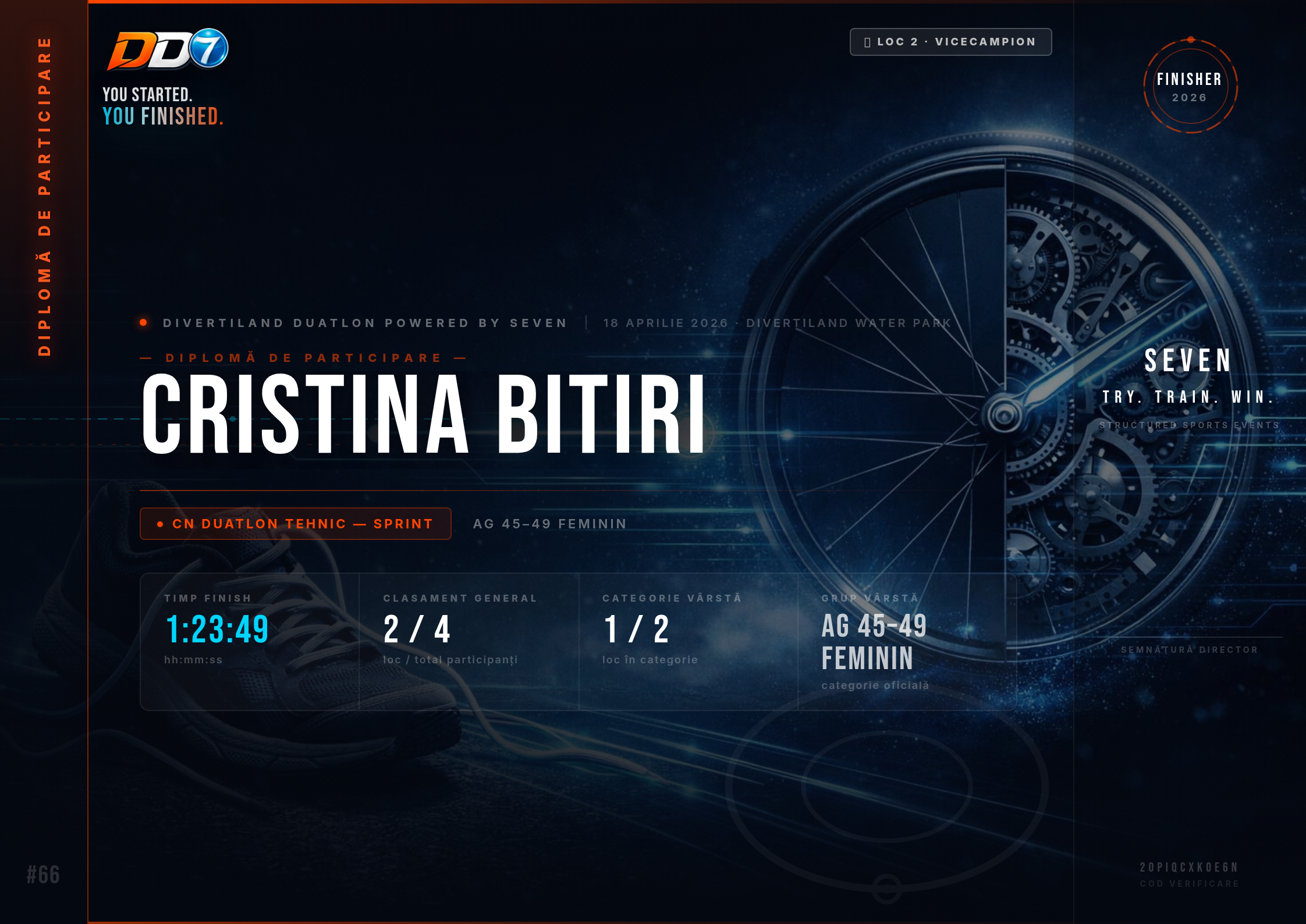 | 1 | 66 | Cristina Bitiri | AG 45–49 Feminin | CN de Duatlon Tehnic - Sprint AG | F | 0:13:57 | 0:01:02 | 0:20:26 | 0:01:04 | 0:15:57 | 0:01:04 | 0:20:41 | 0:09:41 | 1:23:49 | 📜 |