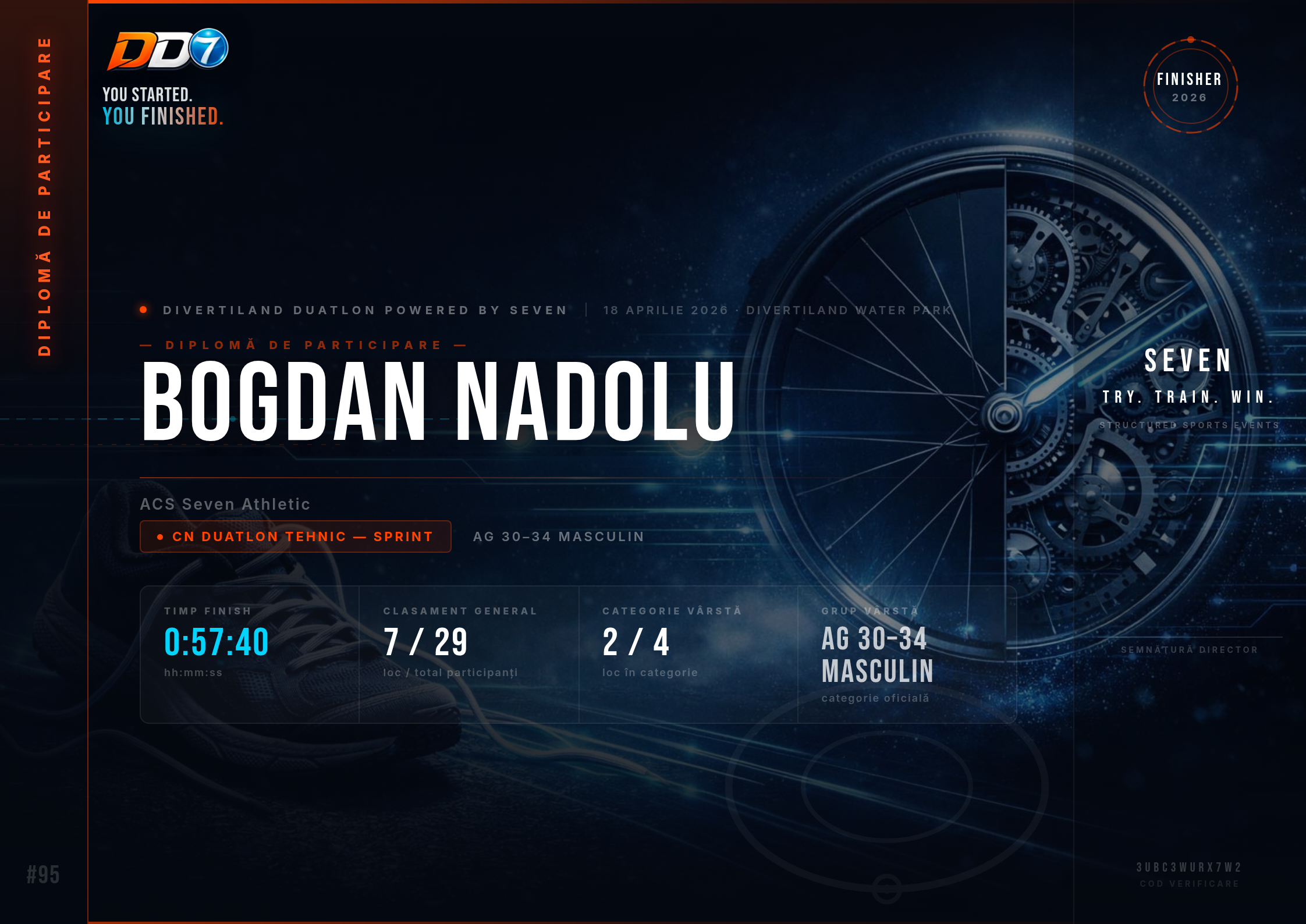 | 2 | 95 | Bogdan Nadolu | AG 30–34 Masculin | CN de Duatlon Tehnic - Sprint AG | M | 0:08:47 | 0:00:42 | 0:15:48 | 0:00:58 | 0:09:13 | 0:00:45 | 0:16:16 | 0:05:15 | 0:57:40 | 📜 |