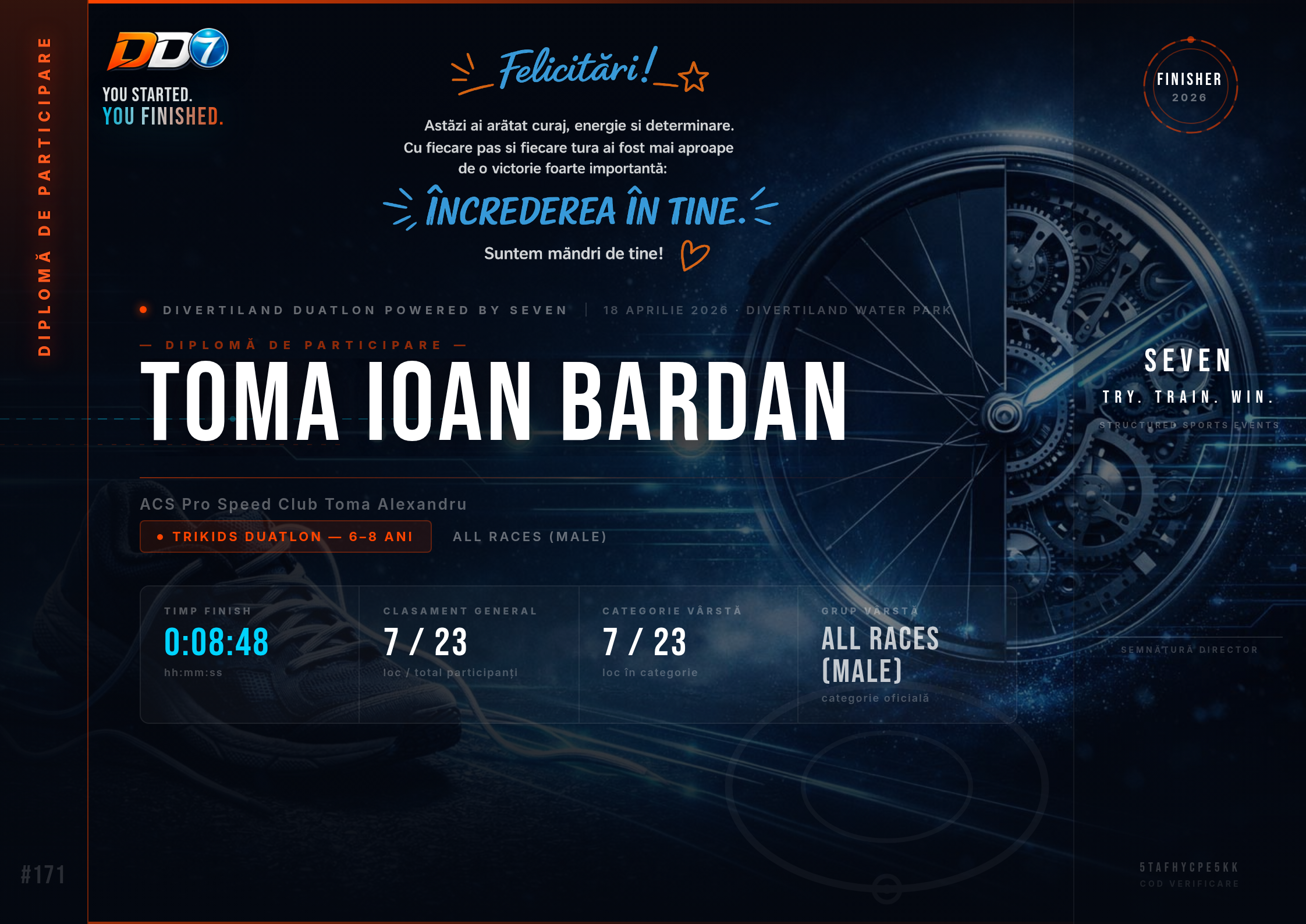 | 7 | Toma Ioan Bardan | TRIKids 6-8 Ani | M | 171 | 0:01:17 | 0:00:52 | 0:05:05 | 0:01:35 | 0:08:48 | 📜 |
