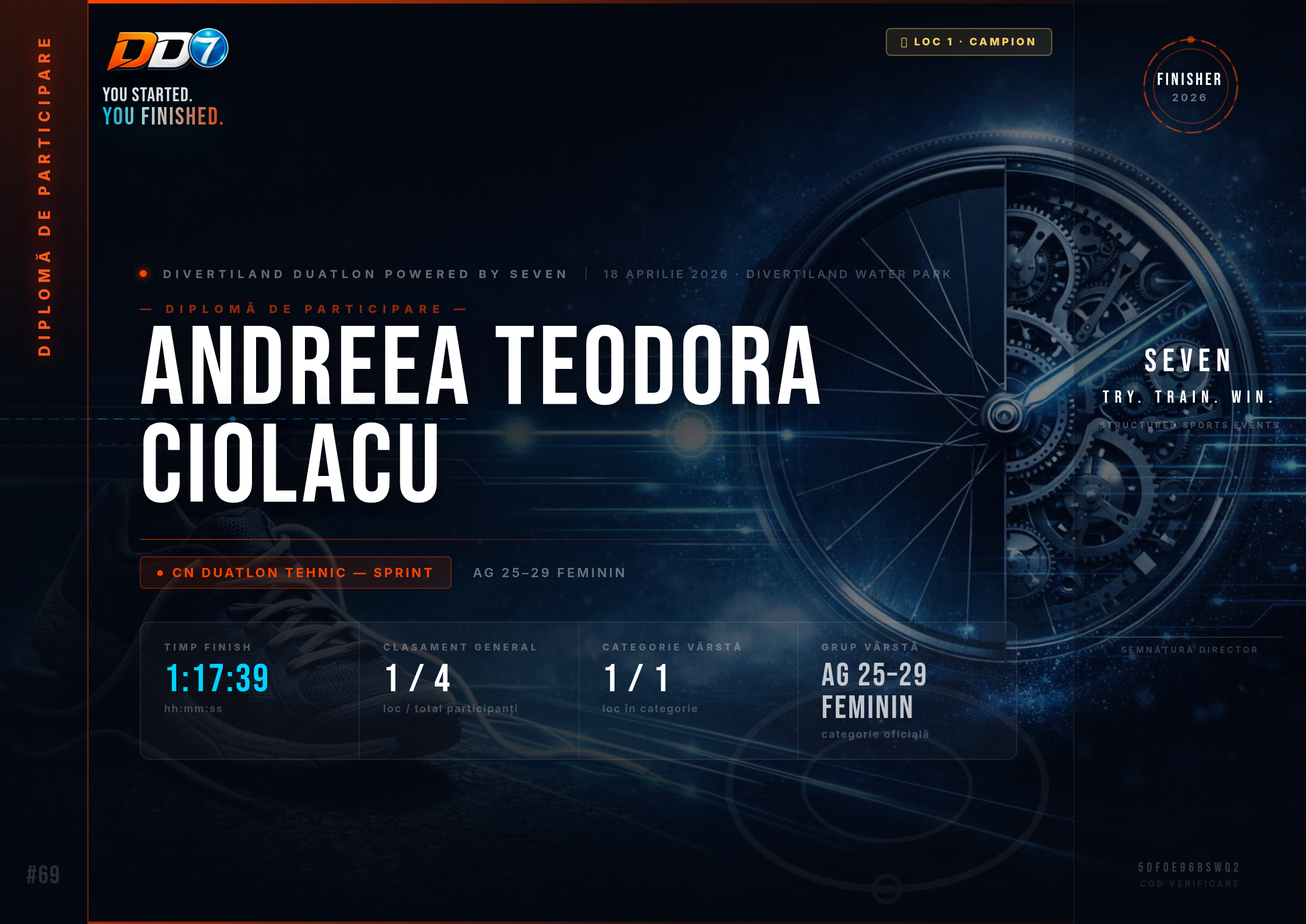 | 1 | 69 | Andreea Teodora Ciolacu | AG 25–29 Feminin | CN de Duatlon Tehnic - Sprint AG | F | 0:11:33 | 0:00:45 | 0:19:18 | 0:00:51 | 0:14:00 | 0:00:52 | 0:21:50 | 0:08:34 | 1:17:39 | 📜 |