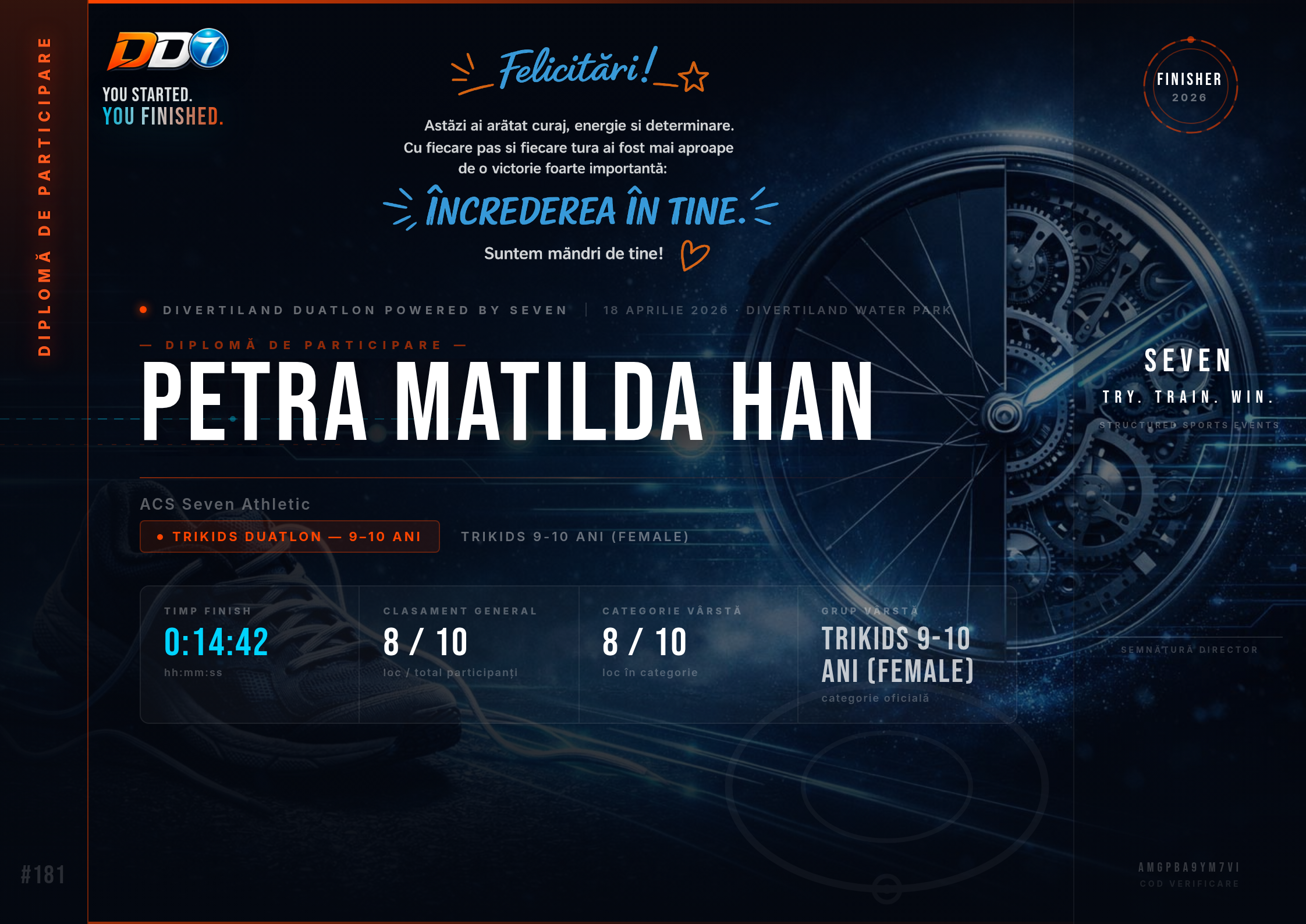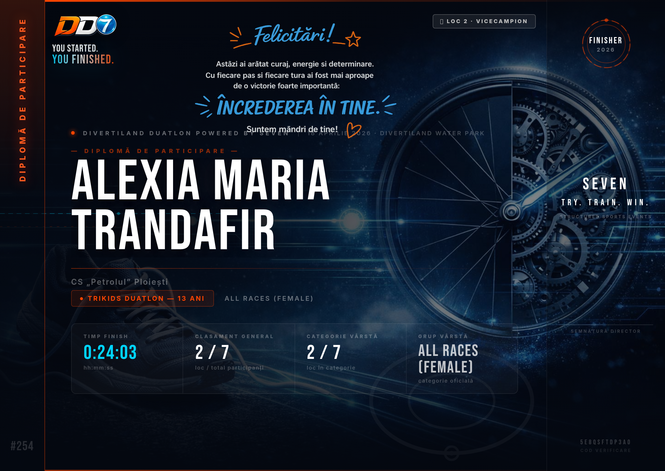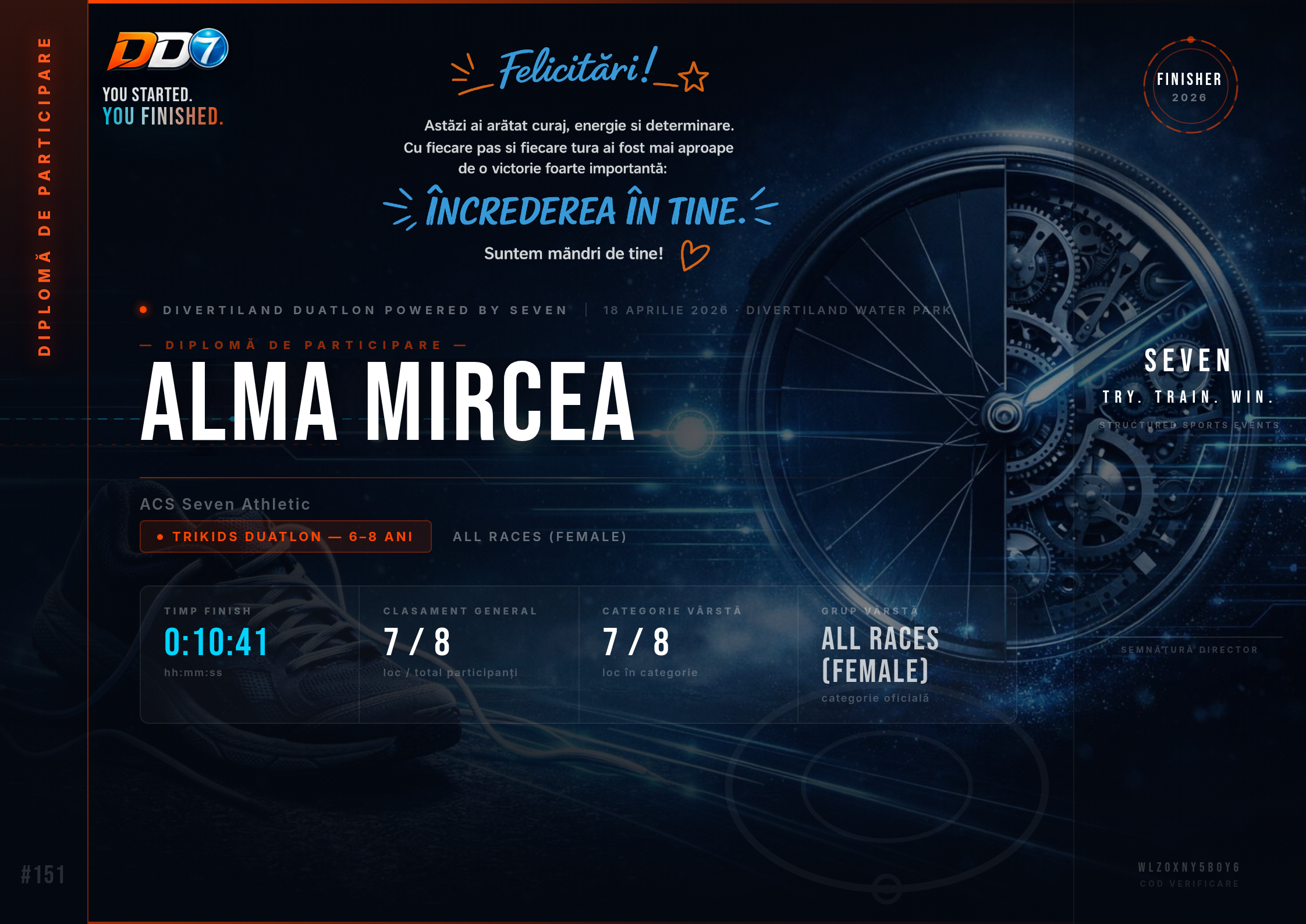 | 7 | Alma Mircea | TRIKids 6-8 Ani | F | 151 | 0:01:25 | 0:01:06 | 0:06:15 | 0:01:57 | 0:10:41 | 📜 |