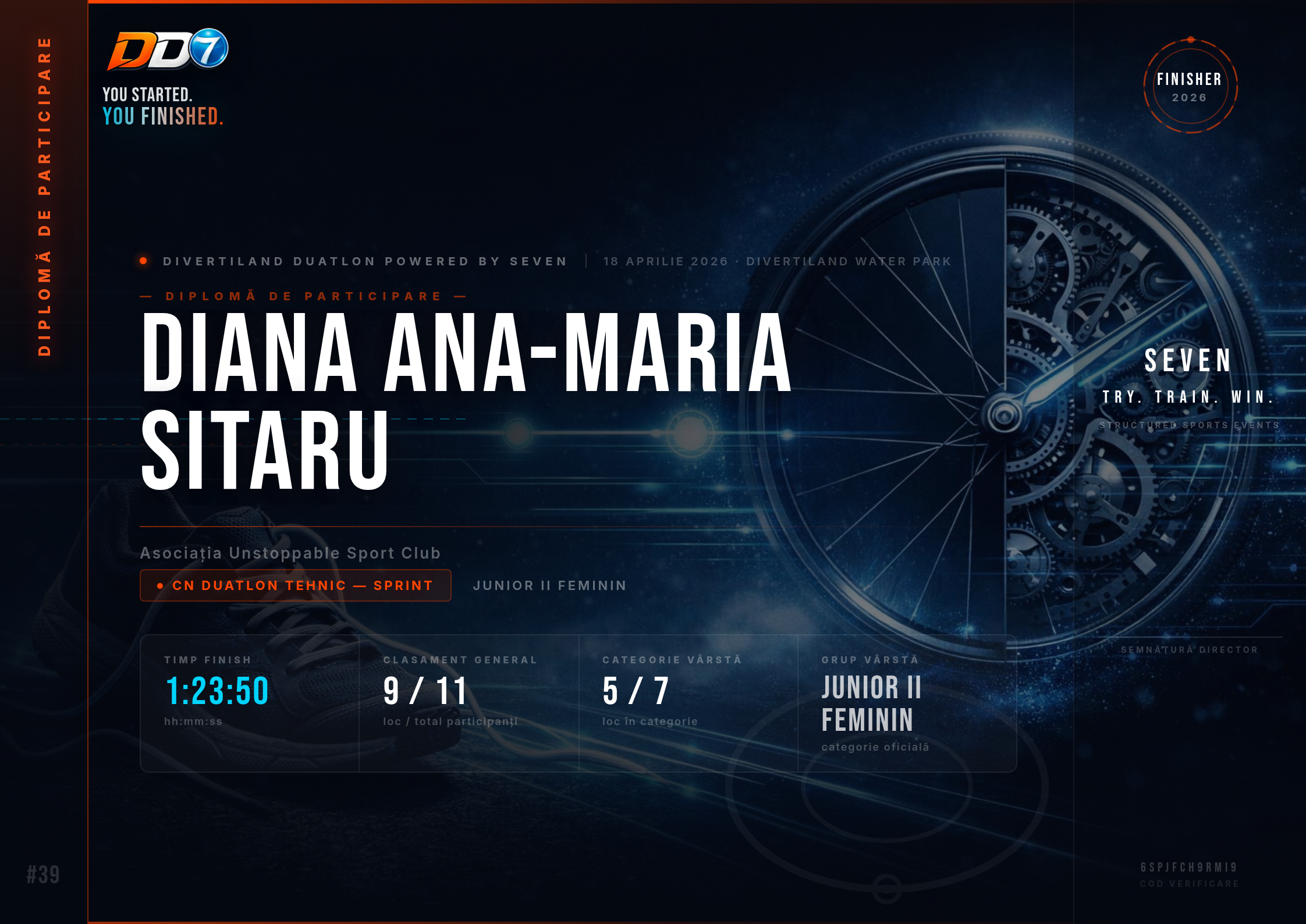 | 5 | 39 | Diana Ana-Maria Sitaru | Junior II Feminin | CN Duatlon Tehnic - Sprint | F | 0:12:01 | 0:00:50 | 0:22:07 | 0:00:48 | 0:14:41 | 0:00:57 | 0:23:08 | 0:09:20 | 1:23:50 | 📜 |