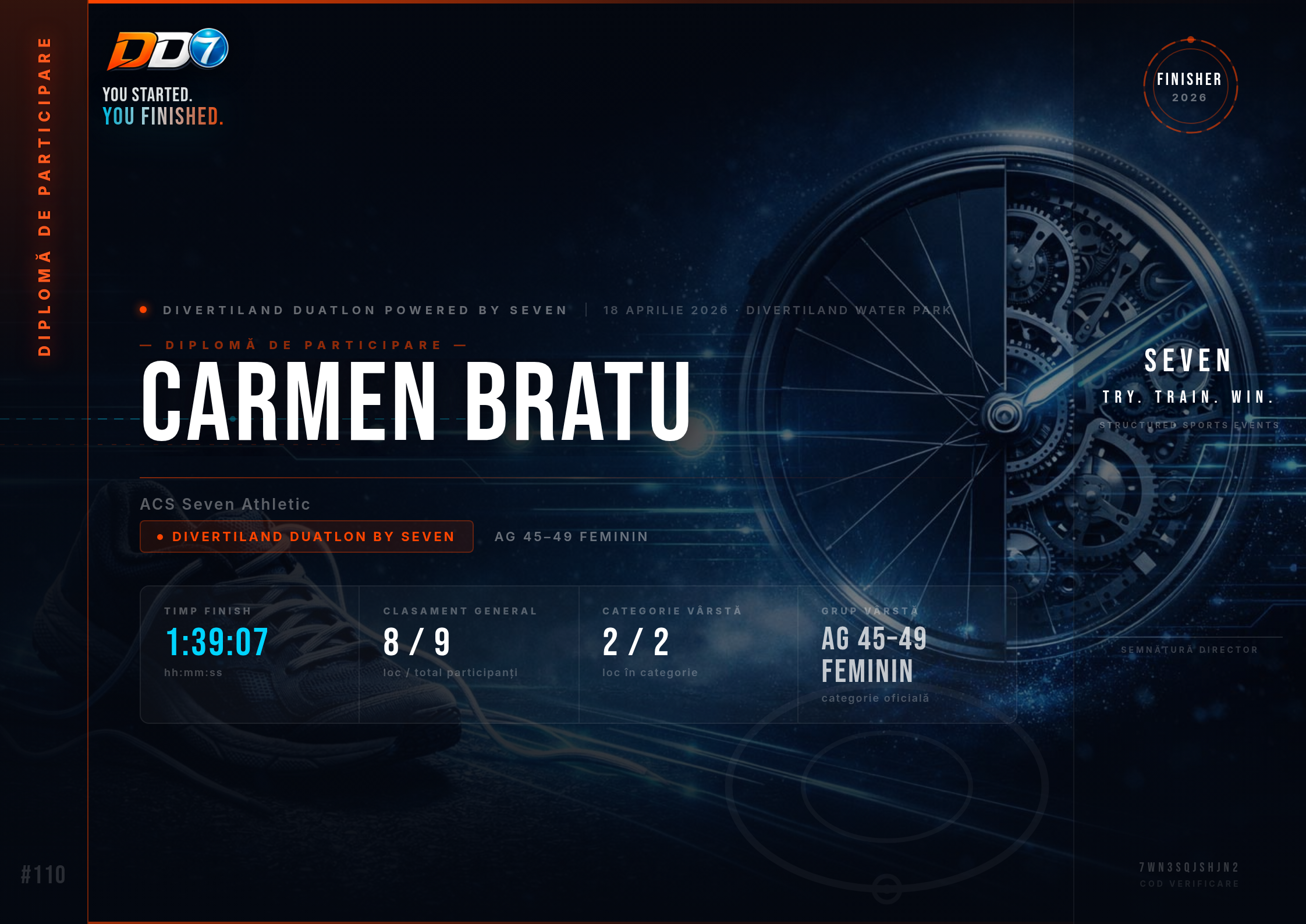 | 2 | 110 | Carmen Bratu | AG 45–49 Feminin | F | 0:13:33 | 0:01:41 | 0:24:20 | 0:02:20 | 0:18:25 | 0:02:03 | 0:25:27 | 0:11:22 | 1:39:07 | 📜 |