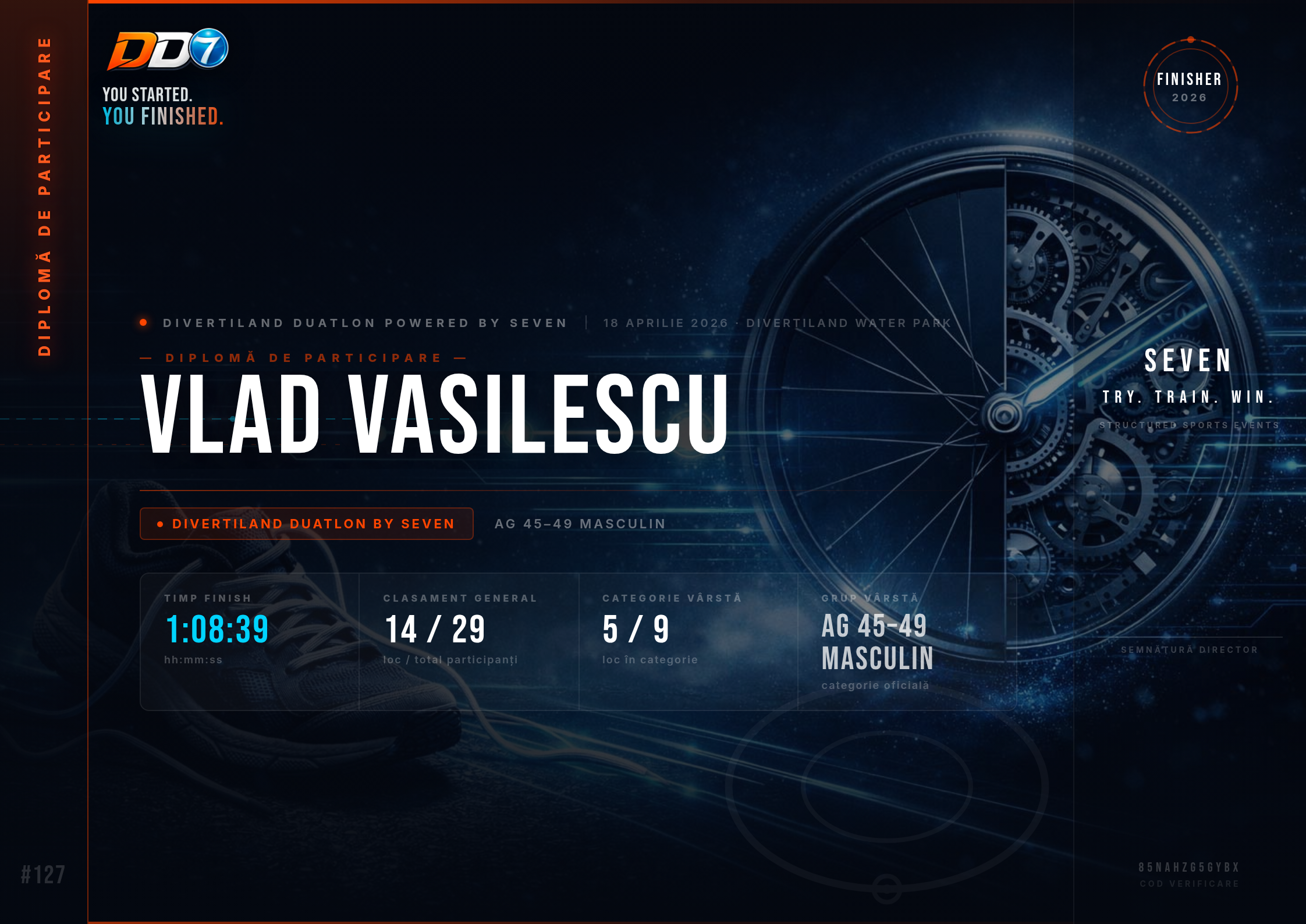 | 5 | 127 | Vlad Vasilescu | AG 45–49 Masculin | M | 0:10:36 | 0:01:32 | 0:17:40 | 0:01:35 | 0:10:45 | 0:01:30 | 0:18:15 | 0:06:50 | 1:08:39 | 📜 |