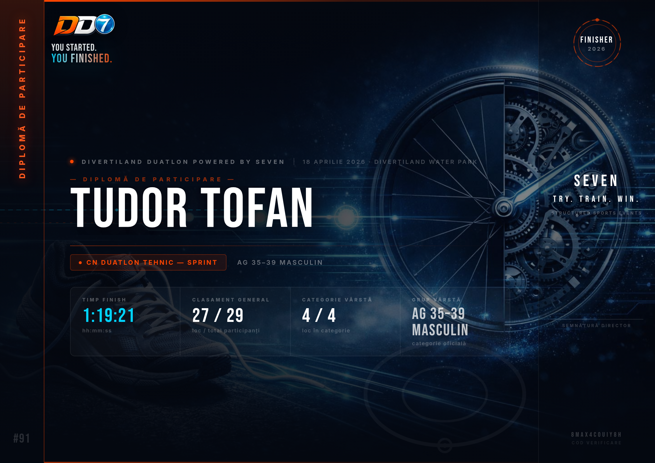 | 4 | 91 | Tudor Tofan | AG 35–39 Masculin | CN de Duatlon Tehnic - Sprint AG | M | 0:13:31 | 0:01:03 | 0:18:49 | 0:01:08 | 0:14:51 | 0:01:23 | 0:19:56 | 0:08:45 | 1:19:21 | 📜 |