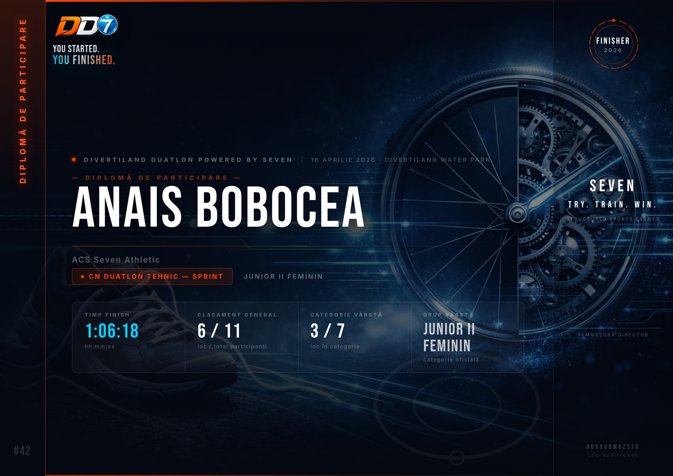 | 3 | 42 | Anais BOBOCEA | Junior II Feminin | CN Duatlon Tehnic - Sprint | F | 0:09:26 | 0:01:15 | 0:18:21 | 0:01:04 | 0:10:25 | 0:01:10 | 0:18:16 | 0:06:25 | 1:06:18 | 📜 |