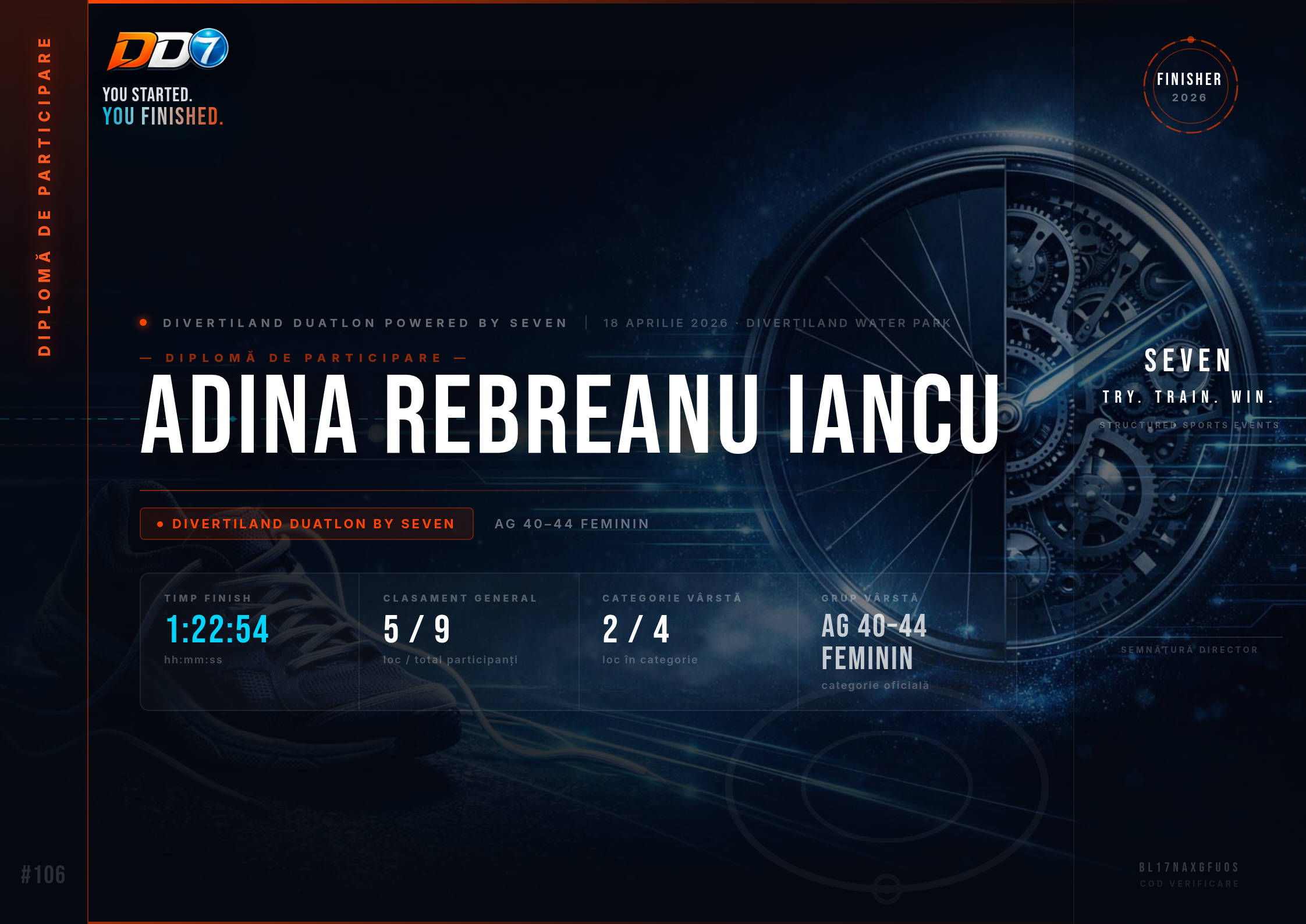 | 2 | 106 | Adina Rebreanu Iancu | AG 40–44 Feminin | F | 0:13:09 | 0:01:38 | 0:21:27 | 0:01:43 | 0:13:35 | 0:01:35 | 0:21:48 | 0:08:02 | 1:22:54 | 📜 |