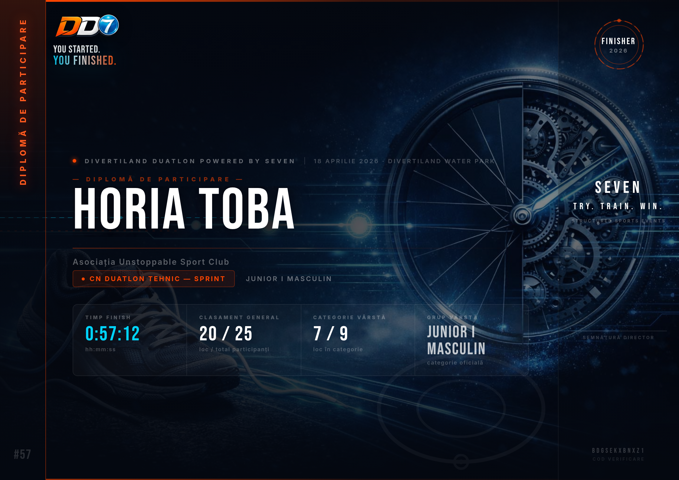 | 7 | 57 | Horia Toba | Junior I Masculin | CN Duatlon Tehnic - Sprint | M | 0:08:09 | 0:00:39 | 0:17:46 | 0:00:40 | 0:08:45 | 0:00:42 | 0:57:12 | 📜 | ||