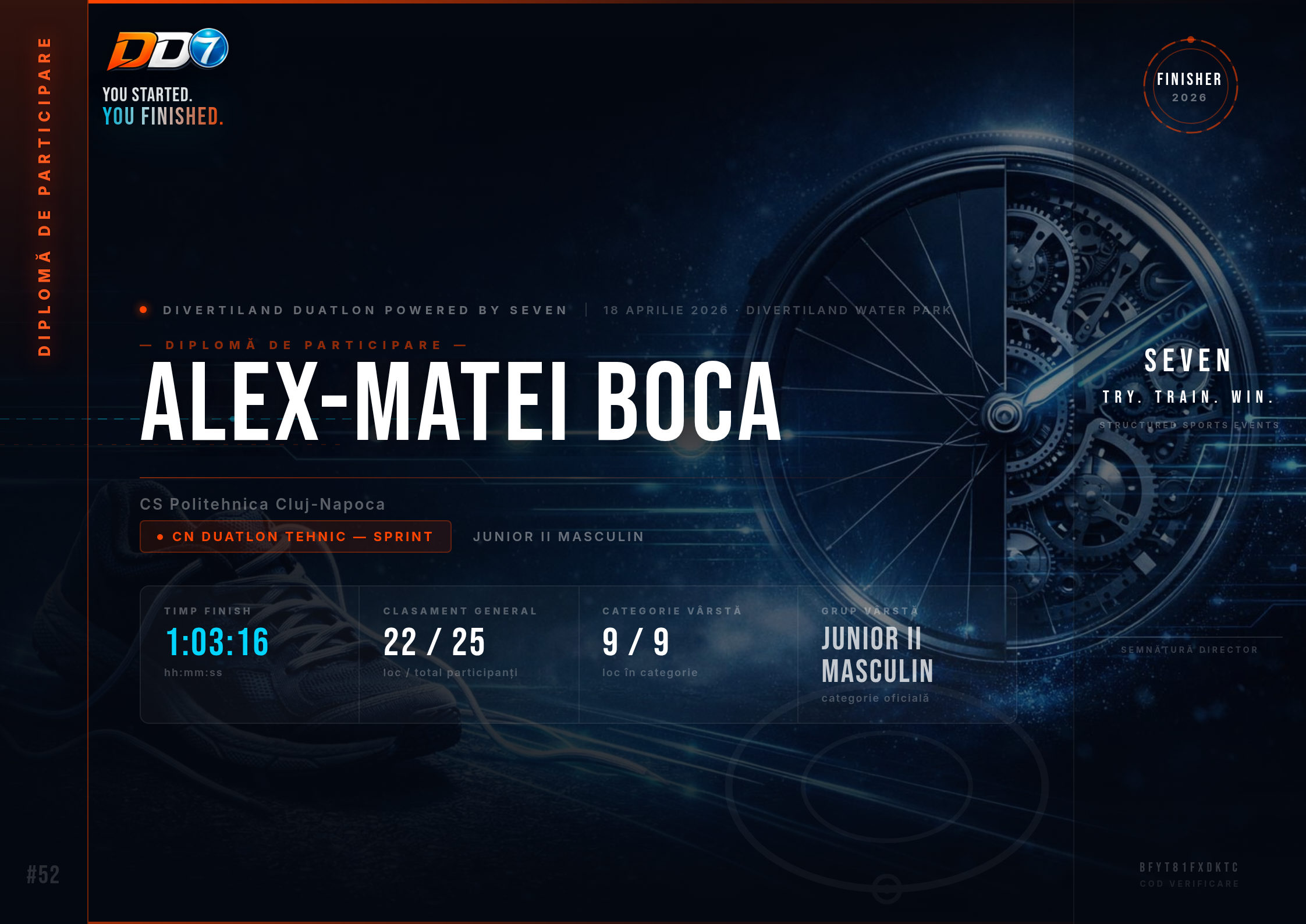 | 9 | 52 | ALEX-MATEI BOCA | Junior II Masculin | CN Duatlon Tehnic - Sprint | M | 0:09:03 | 0:00:40 | 0:17:41 | 0:00:44 | 0:10:21 | 0:00:44 | 0:18:17 | 0:05:50 | 1:03:16 | 📜 |