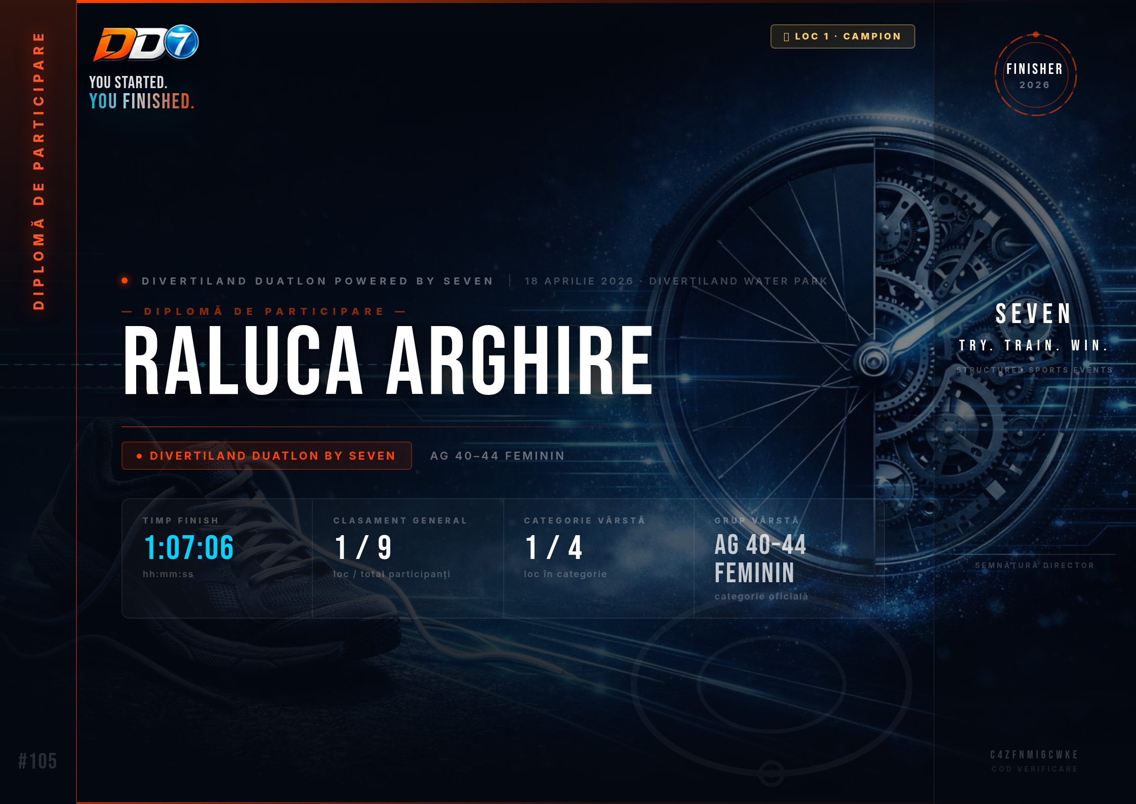 | 1 | 105 | Raluca Arghire | AG 40–44 Feminin | F | 0:10:17 | 0:01:15 | 0:17:47 | 0:01:12 | 0:10:36 | 0:01:12 | 0:18:01 | 0:06:50 | 1:07:06 | 📜 |