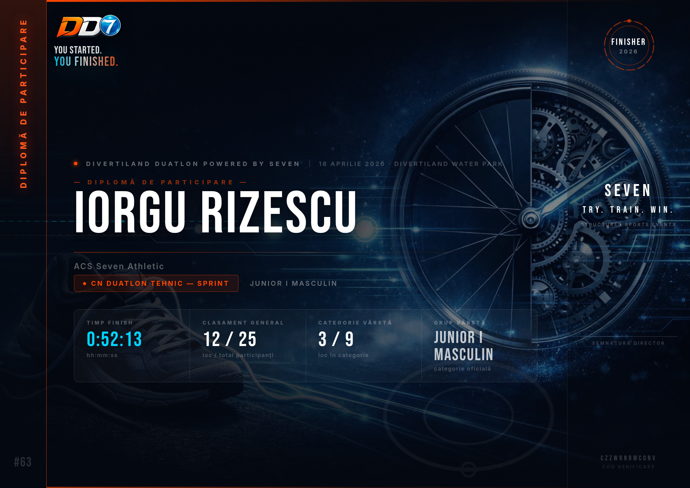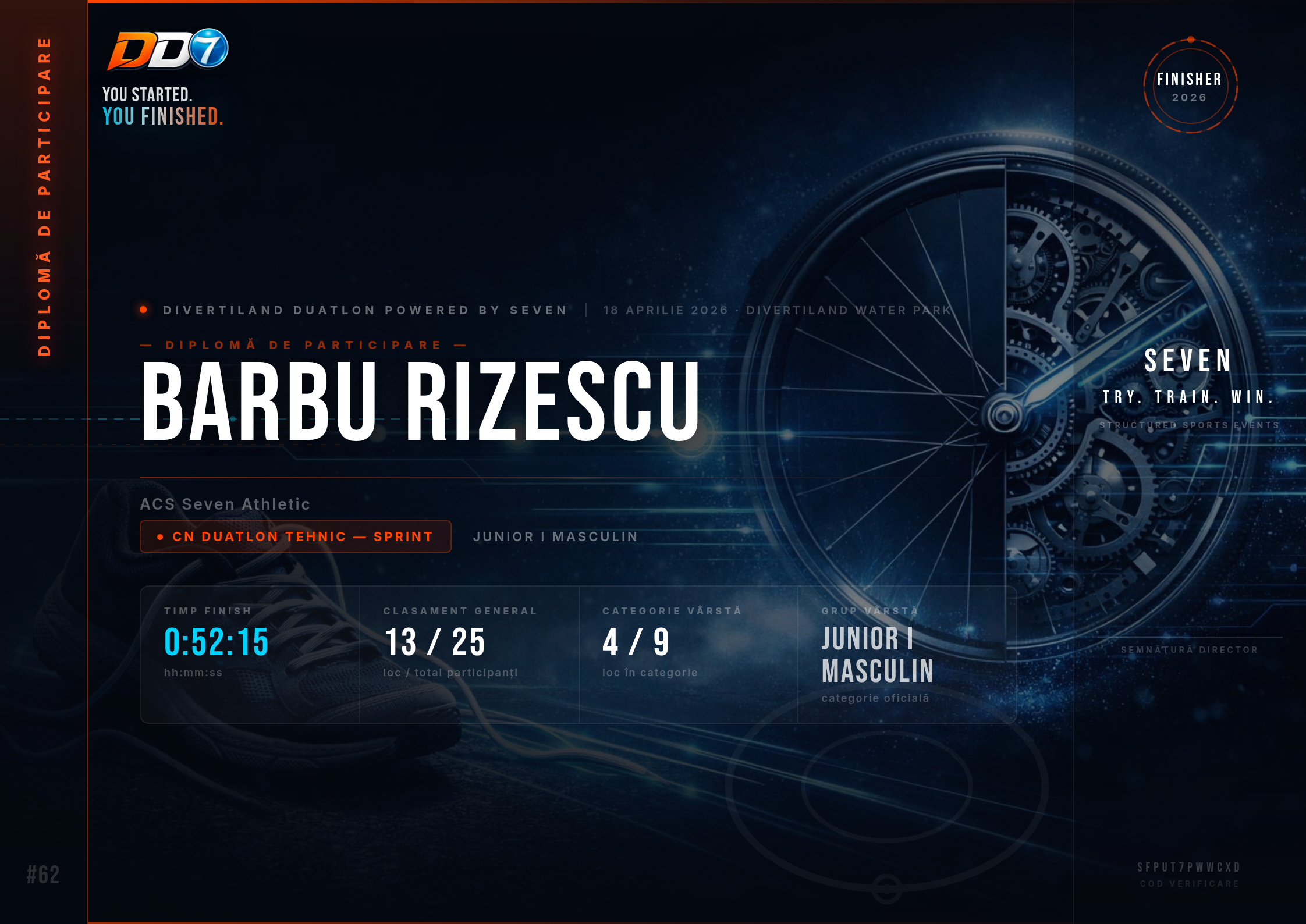 | 3 | 63 | Iorgu Rizescu | Junior I Masculin | CN Duatlon Tehnic - Sprint | M | 0:07:17 | 0:00:35 | 0:19:25 | 0:00:26 | 0:12:09 | 0:00:13 | 0:07:22 | 0:04:51 | 0:52:13 | 📜 |