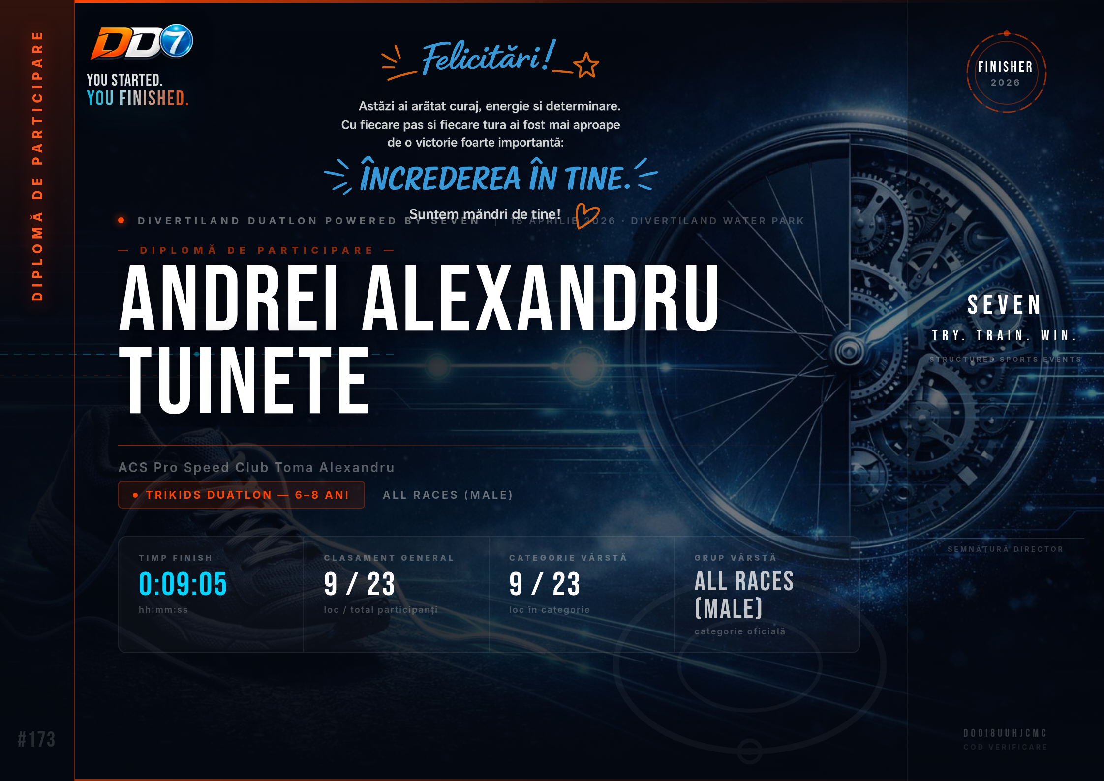 | 9 | Andrei Alexandru Tuinete | TRIKids 6-8 Ani | M | 173 | 0:01:14 | 0:00:59 | 0:05:14 | 0:01:39 | 0:09:05 | 📜 |