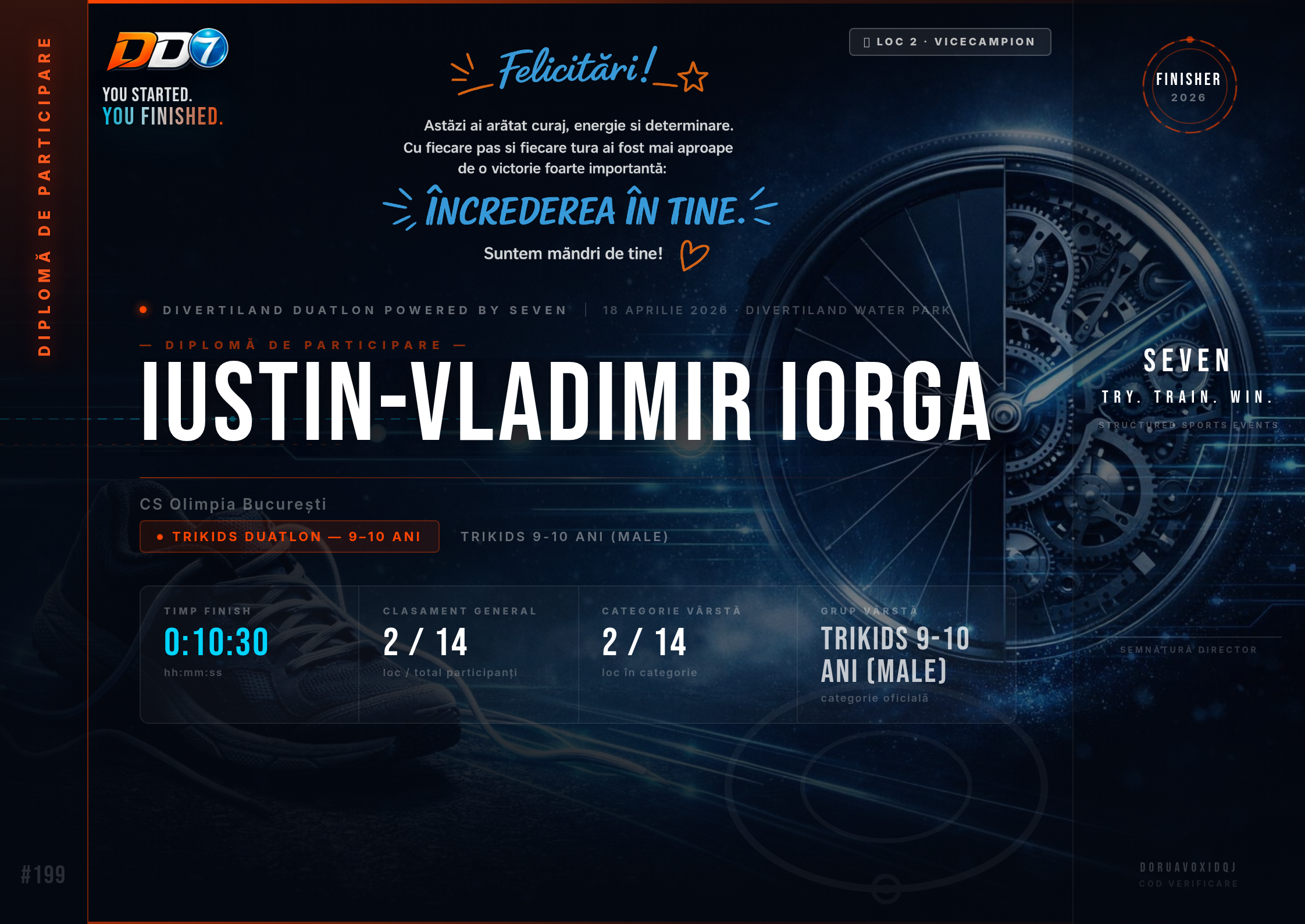 | 2 | Iustin-Vladimir Iorga | M | TRIKids 9-10 Ani | 199 | 0:01:29 | 0:00:42 | 0:06:32 | 0:01:48 | 0:10:30 | 📜 |