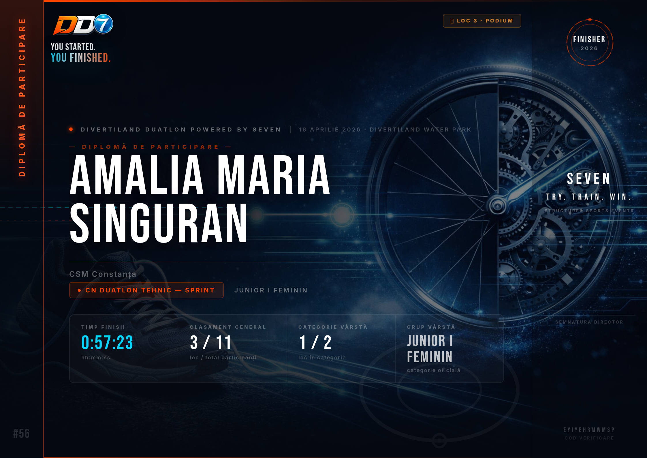 | 1 | 56 | Amalia Maria Singuran | Junior I Feminin | CN Duatlon Tehnic - Sprint | F | 0:08:09 | 0:00:37 | 0:15:39 | 0:00:39 | 0:09:42 | 0:00:41 | 0:16:02 | 0:05:58 | 0:57:23 | 📜 |