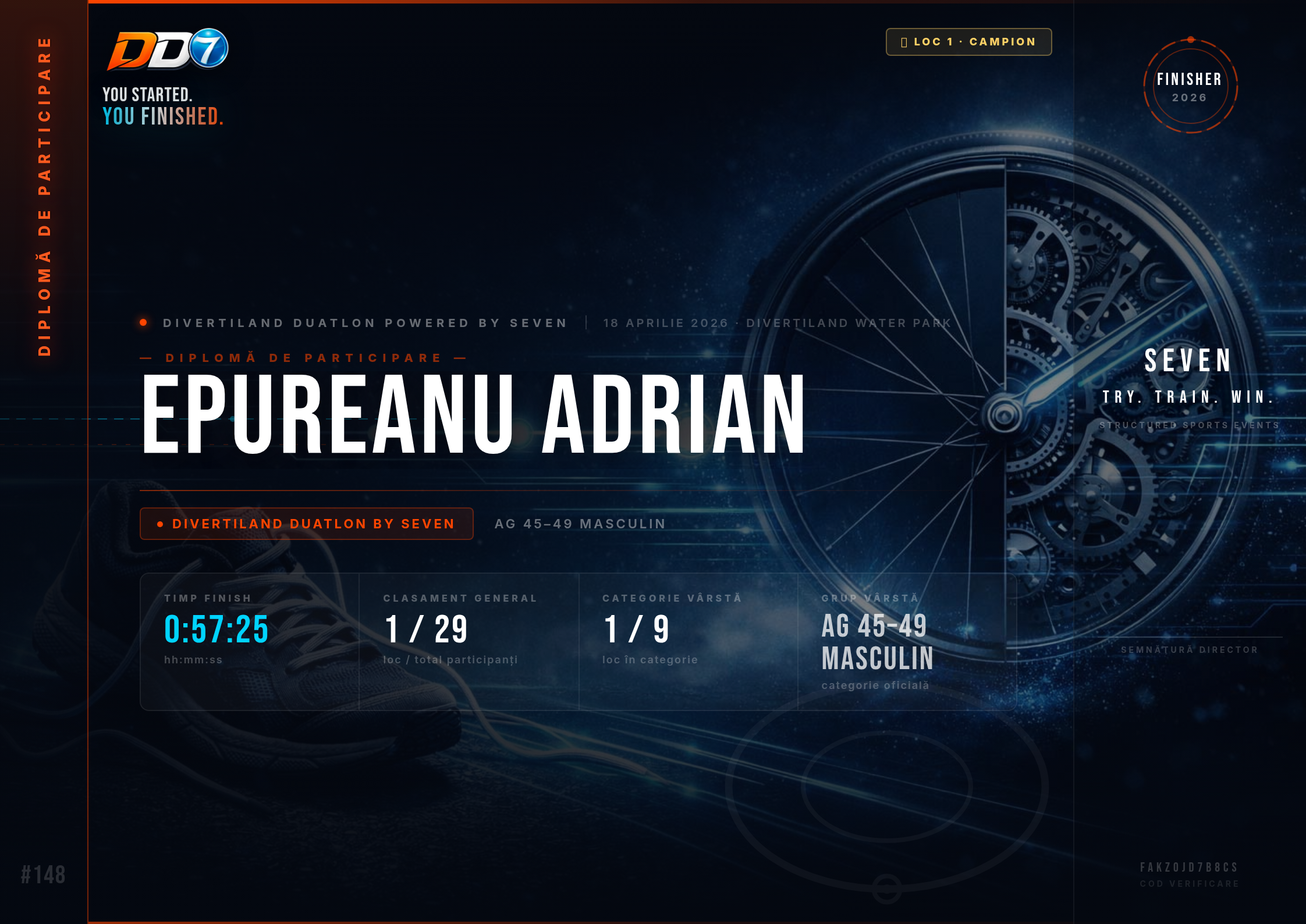 | 1 | 148 | Epureanu Adrian | AG 45–49 Masculin | M | 0:08:25 | 0:00:54 | 0:15:27 | 0:00:51 | 0:09:16 | 0:00:52 | 0:16:02 | 0:05:40 | 0:57:25 | 📜 |
