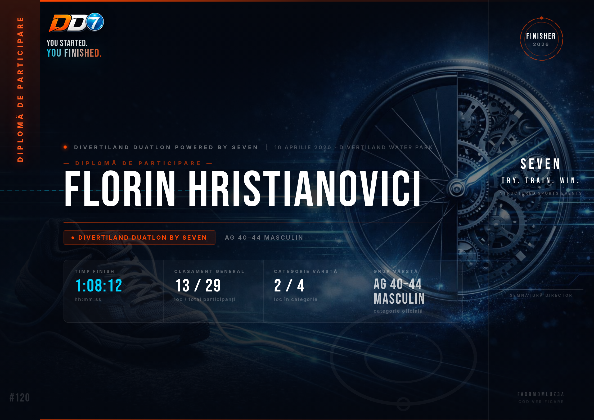 | 2 | 120 | FLORIN HRISTIANOVICI | AG 40–44 Masculin | M | 0:09:50 | 0:01:44 | 0:18:01 | 0:01:25 | 0:10:17 | 0:01:47 | 0:18:38 | 0:06:34 | 1:08:12 | 📜 |