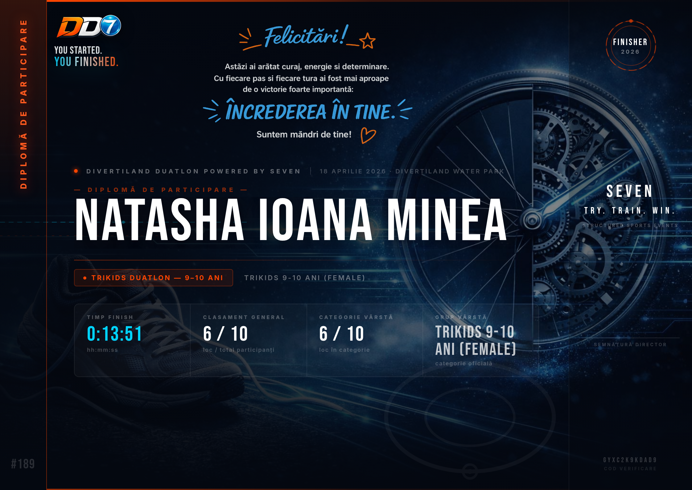 | 6 | Natasha Ioana Minea | F | TRIKids 9-10 Ani | 189 | 0:01:47 | 0:00:56 | 0:09:01 | 0:02:08 | 0:13:51 | 📜 |
