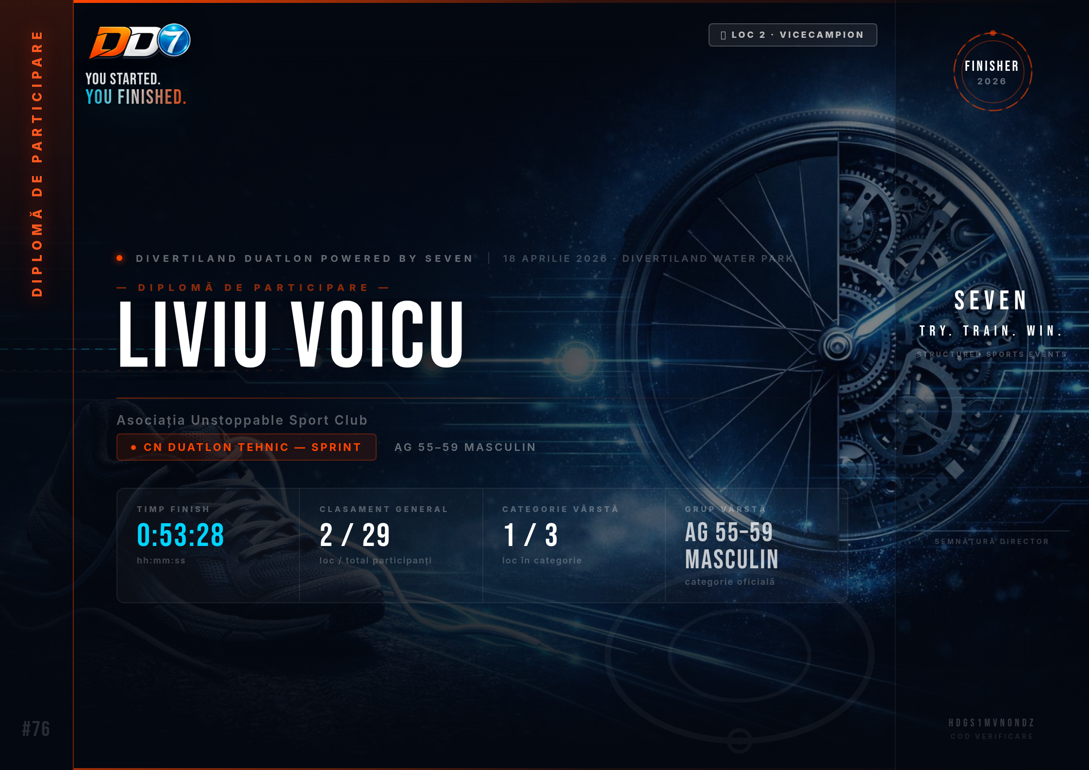| 1 | 76 | Liviu Voicu | AG 55–59 Masculin | CN de Duatlon Tehnic - Sprint AG | M | 0:07:49 | 0:00:56 | 0:14:41 | 0:00:53 | 0:08:03 | 0:00:48 | 0:14:58 | 0:05:23 | 0:53:28 | 📜 |