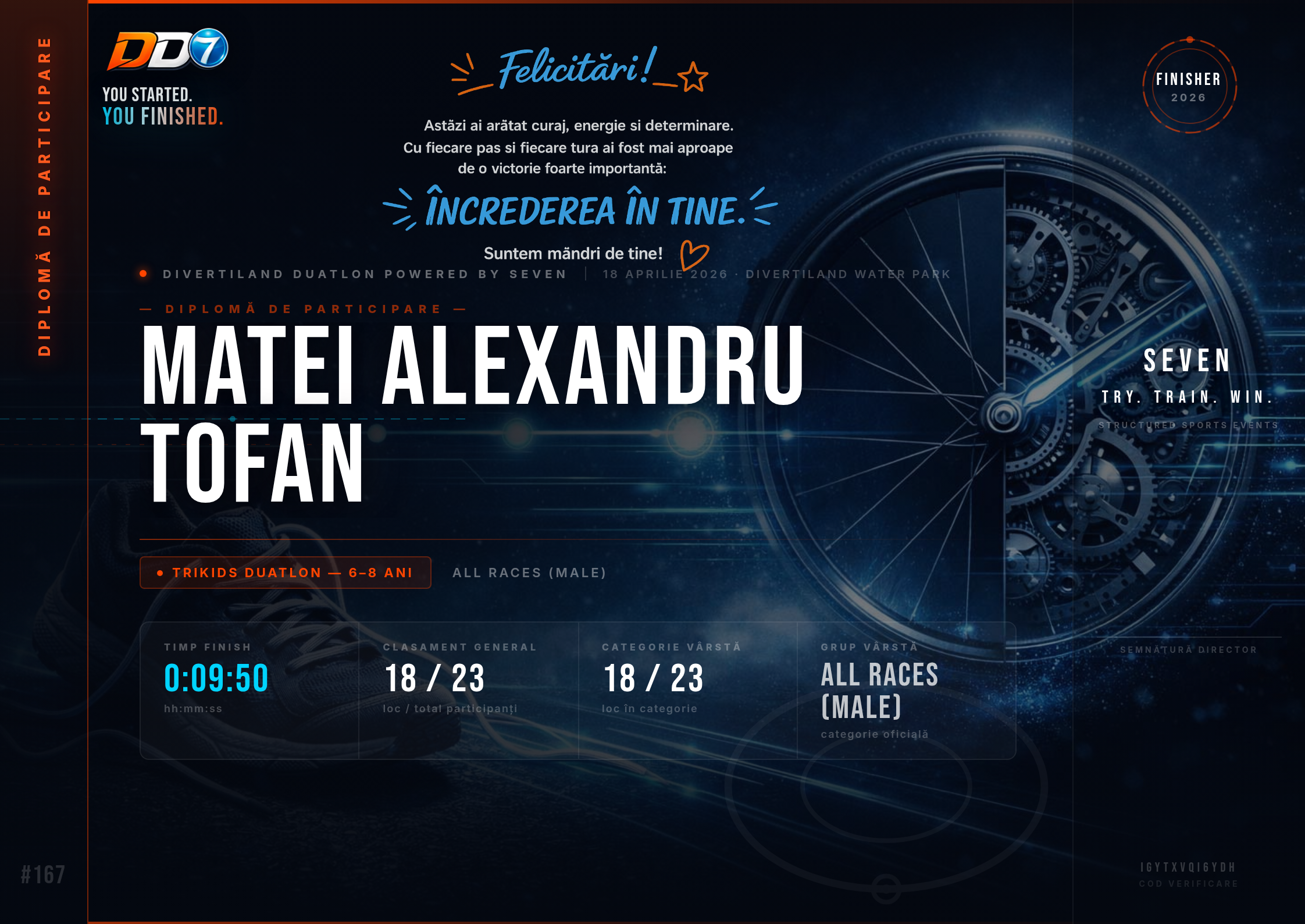 | 18 | Matei Alexandru Tofan | TRIKids 6-8 Ani | M | 167 | 0:01:22 | 0:00:55 | 0:05:32 | 0:02:03 | 0:09:50 | 📜 |
