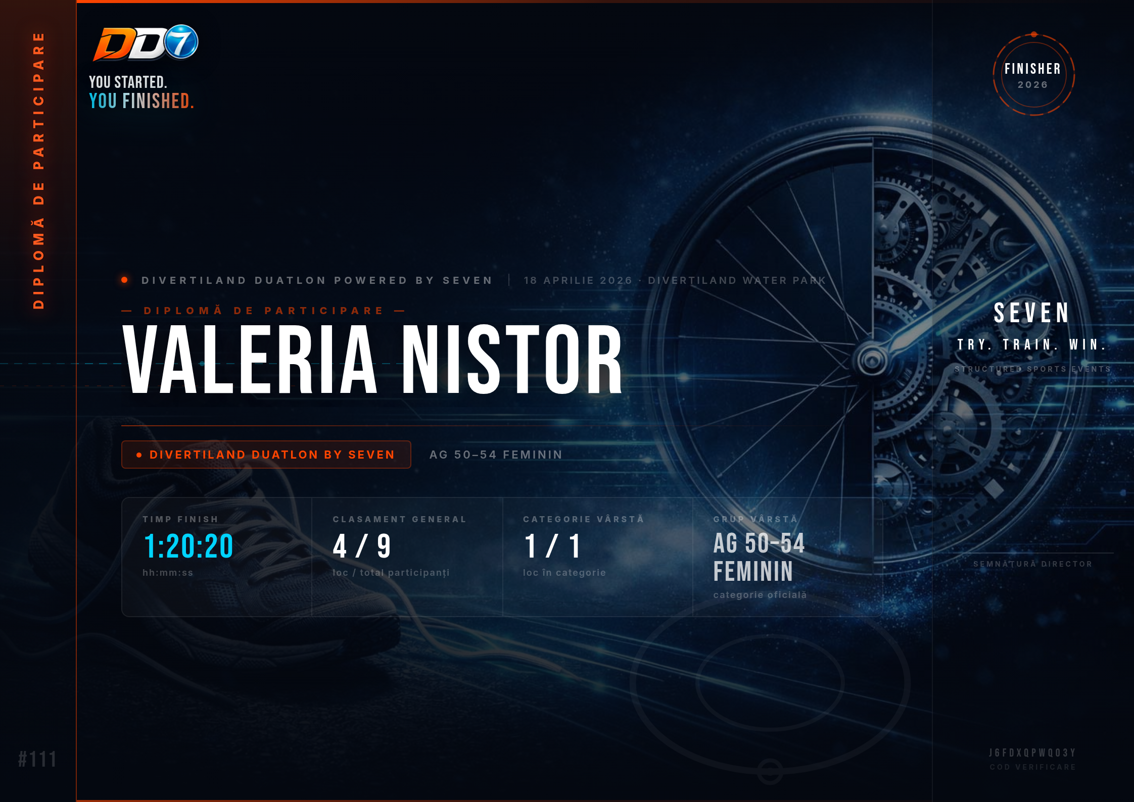 | 1 | 111 | Valeria Nistor | AG 50–54 Feminin | F | 0:13:20 | 0:01:05 | 0:20:21 | 0:01:05 | 0:13:55 | 0:01:10 | 0:21:10 | 0:08:18 | 1:20:20 | 📜 |