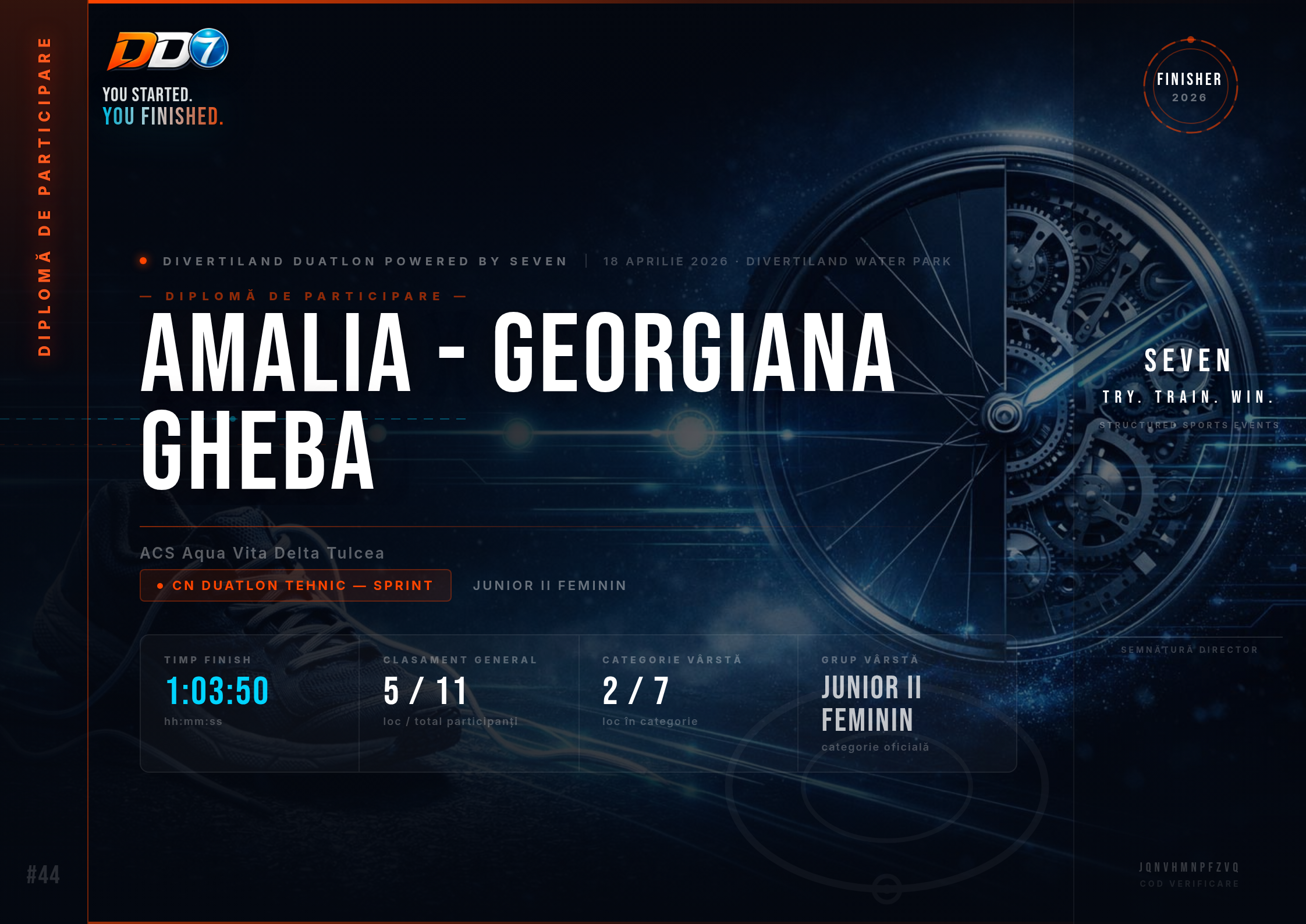 | 2 | 44 | Amalia - Georgiana Gheba | Junior II Feminin | CN Duatlon Tehnic - Sprint | F | 0:09:06 | 0:01:03 | 0:18:13 | 0:00:46 | 0:09:58 | 0:00:49 | 0:18:01 | 0:05:58 | 1:03:50 | 📜 |