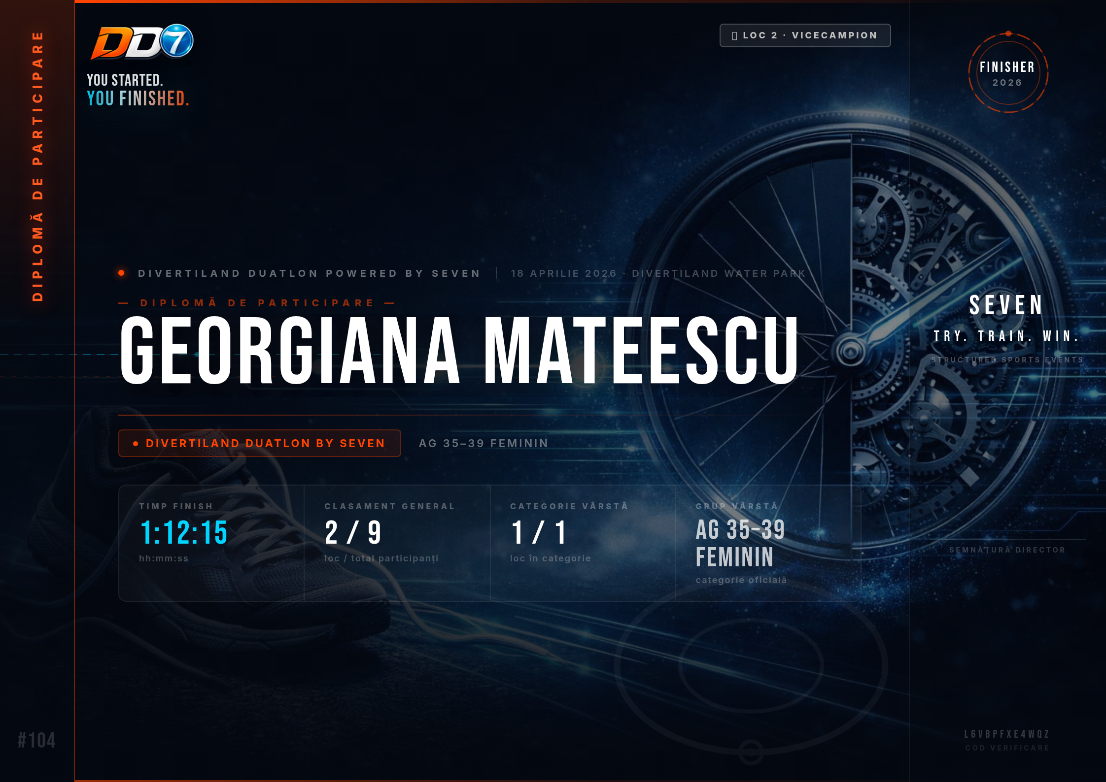 | 1 | 104 | Georgiana Mateescu | AG 35–39 Feminin | F | 0:09:50 | 0:00:47 | 0:21:03 | 0:00:44 | 0:11:10 | 0:00:47 | 0:21:45 | 0:06:12 | 1:12:15 | 📜 |