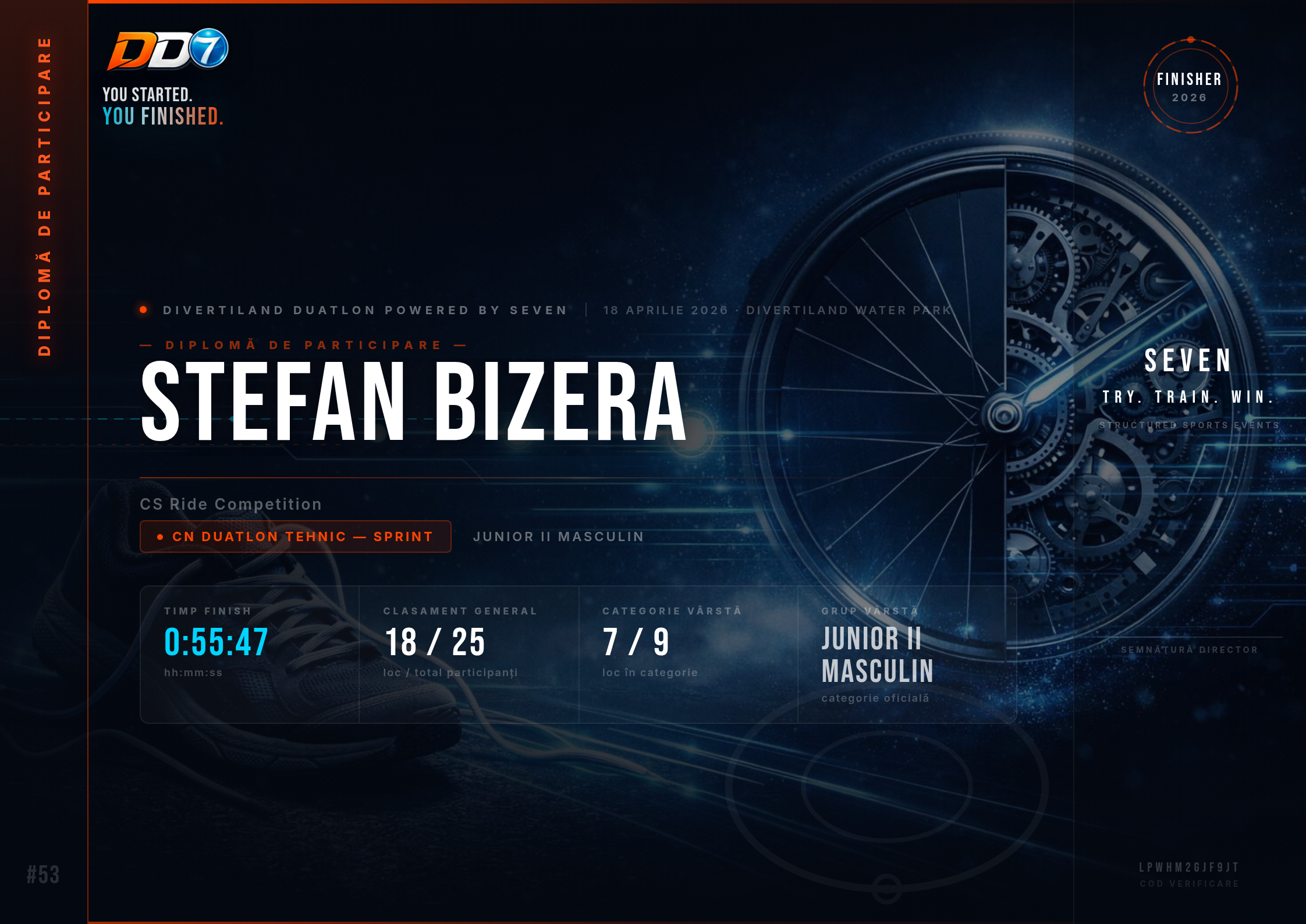 | 7 | 53 | Stefan Bizera | Junior II Masculin | CN Duatlon Tehnic - Sprint | M | 0:08:10 | 0:00:38 | 0:16:46 | 0:00:35 | 0:08:40 | 0:00:39 | 0:17:04 | 0:03:19 | 0:55:47 | 📜 |