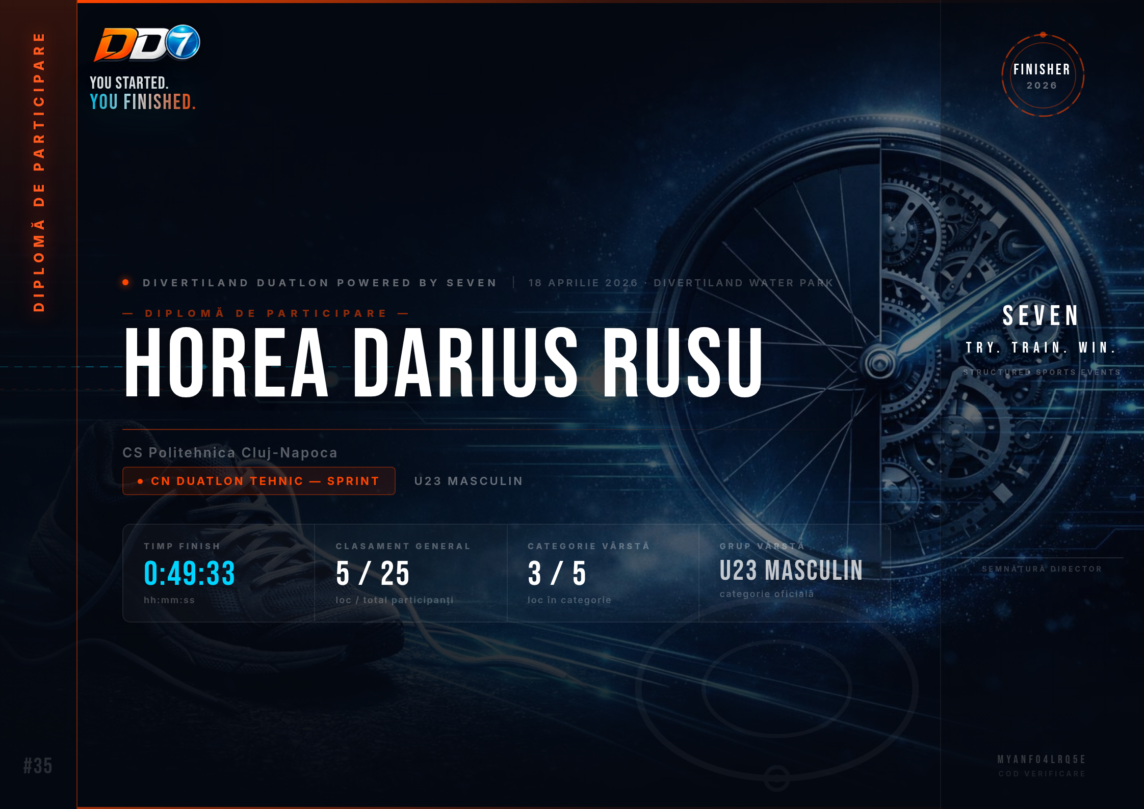 | 3 | 35 | HOREA DARIUS RUSU | U23 Masculin | CN Duatlon Tehnic - Sprint | M | 0:06:31 | 0:00:32 | 0:13:56 | 0:00:34 | 0:07:44 | 0:00:35 | 0:14:50 | 0:04:55 | 0:49:33 | 📜 |