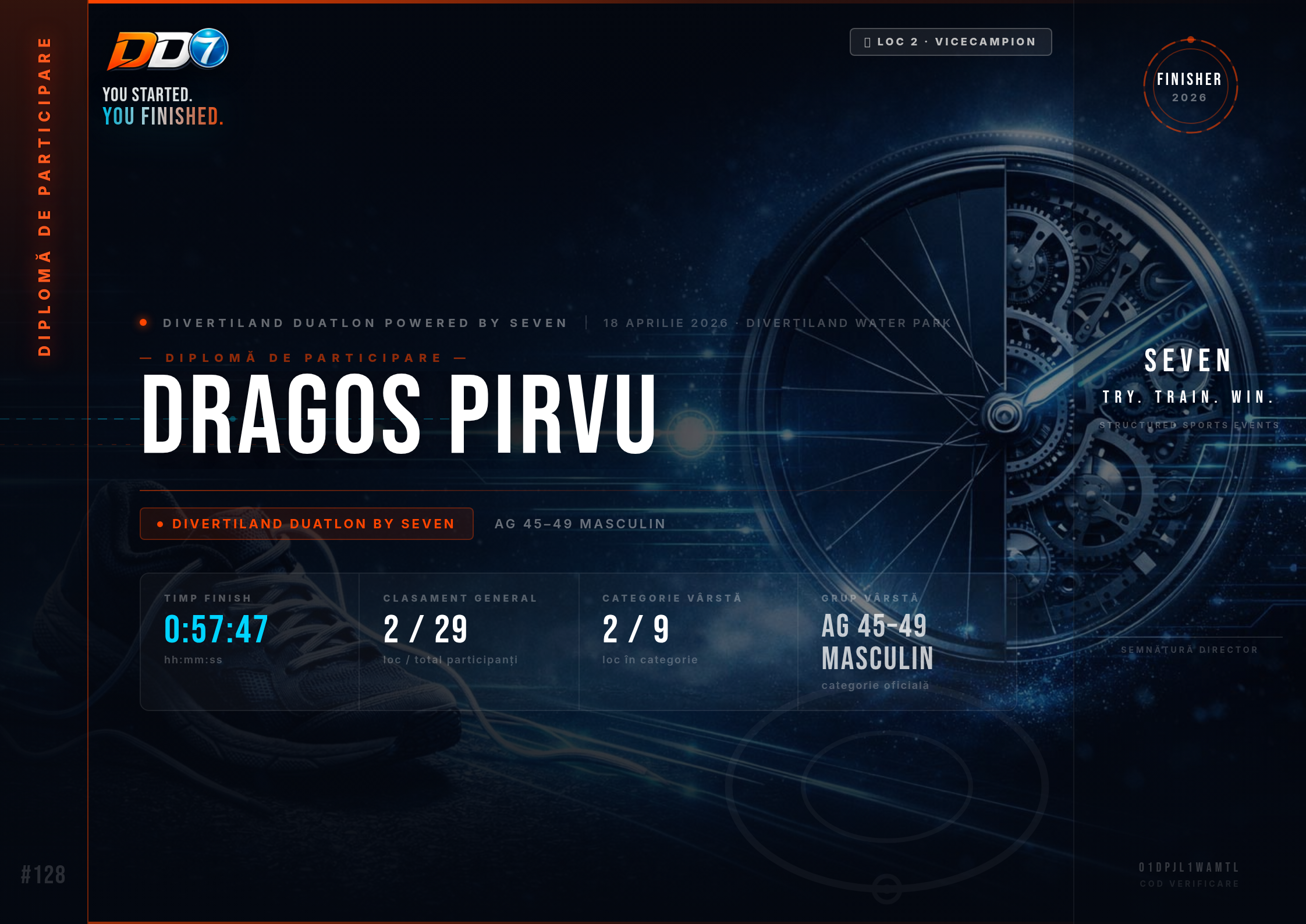 | 2 | 128 | Dragos Pirvu | AG 45–49 Masculin | M | 0:08:09 | 0:00:41 | 0:16:32 | 0:00:47 | 0:08:57 | 0:00:46 | 0:16:44 | 0:05:14 | 0:57:47 | 📜 |
