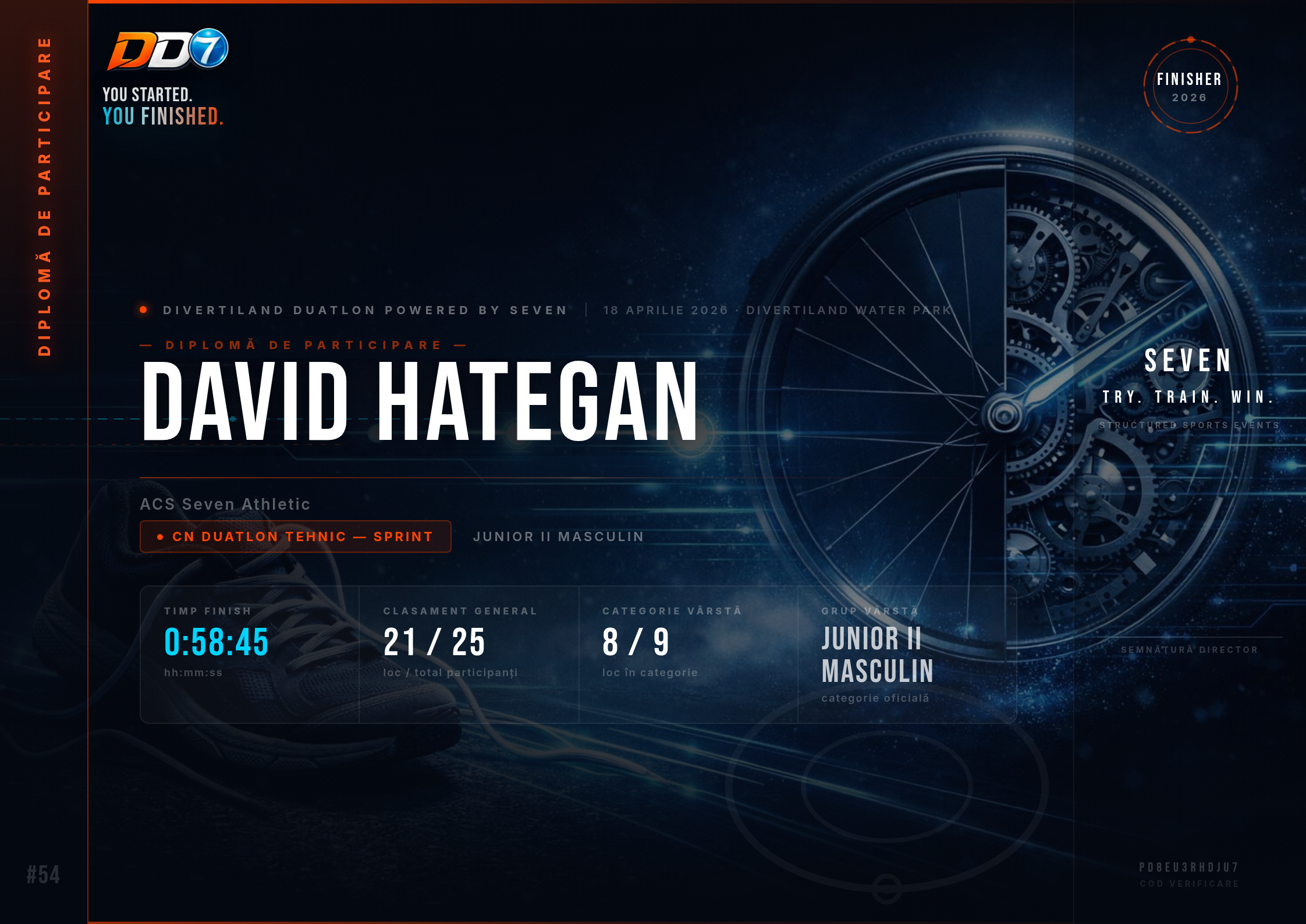 | 8 | 54 | David Hategan | Junior II Masculin | CN Duatlon Tehnic - Sprint | M | 0:08:32 | 0:00:36 | 0:17:27 | 0:00:34 | 0:08:51 | 0:00:38 | 0:17:19 | 0:04:52 | 0:58:45 | 📜 |