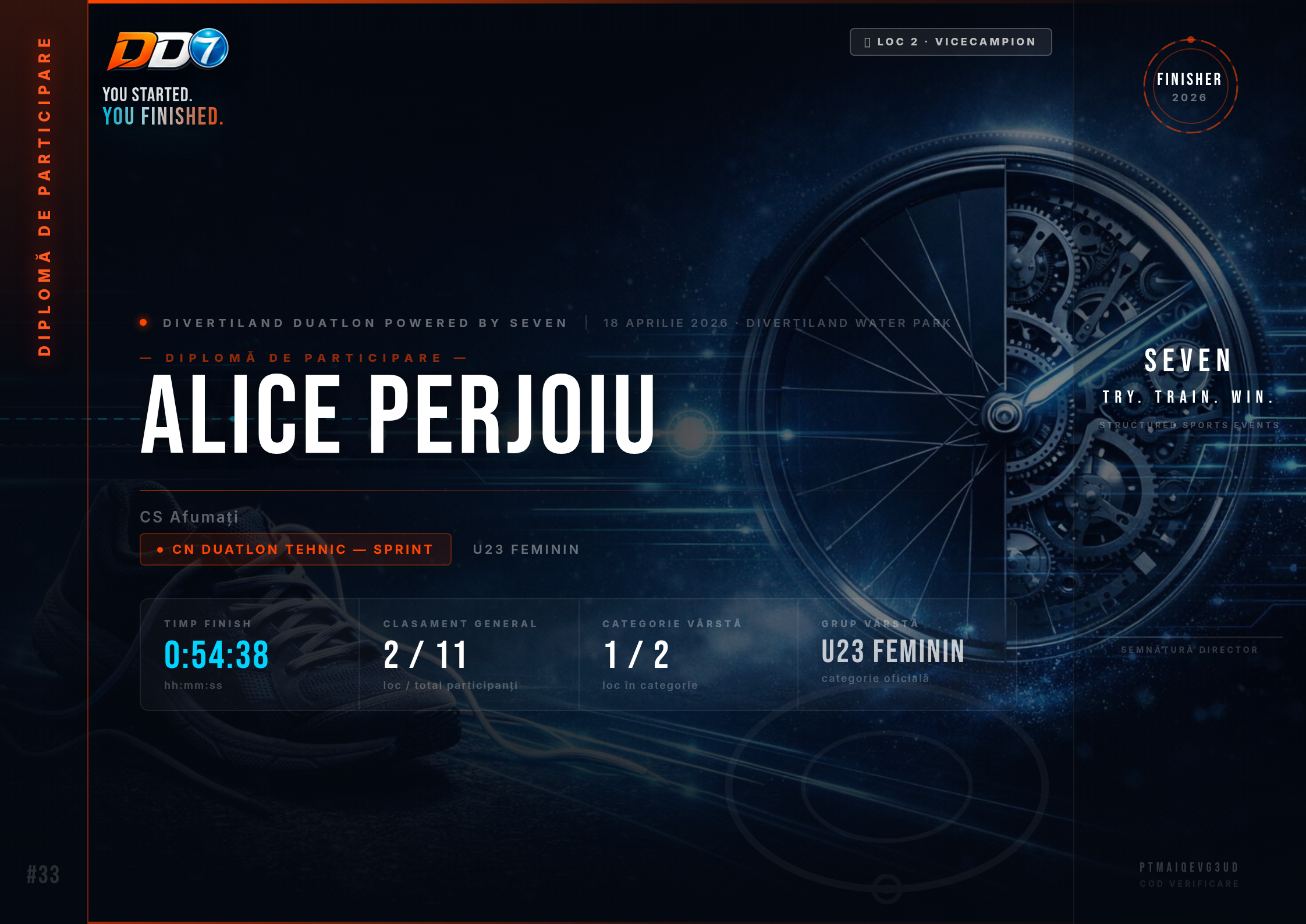 | 1 | 33 | Alice Perjoiu | U23 Feminin | CN Duatlon Tehnic - Sprint | F | 0:07:32 | 0:00:40 | 0:16:00 | 0:00:37 | 0:08:20 | 0:00:37 | 0:16:01 | 0:04:54 | 0:54:38 | 📜 |