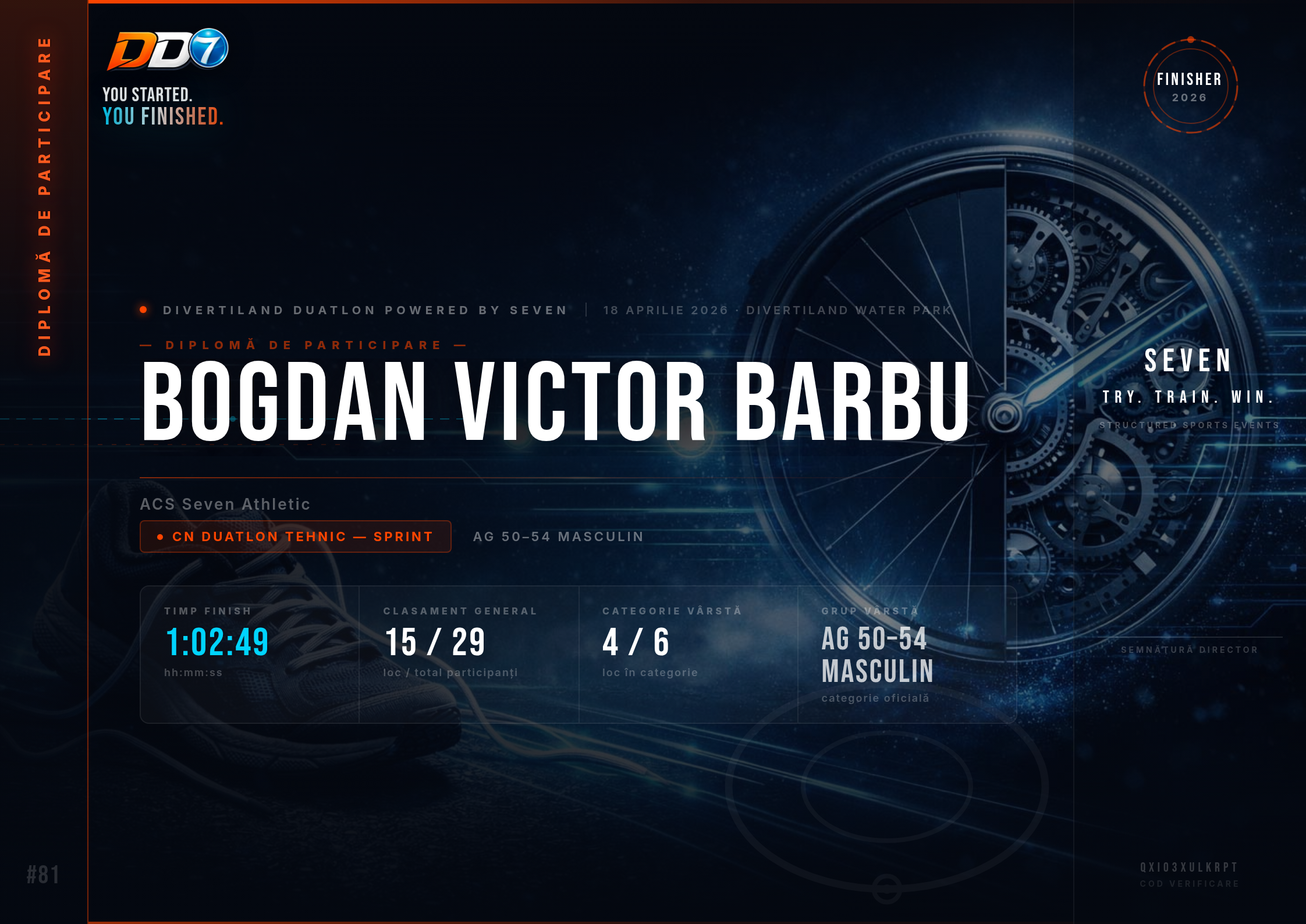 | 4 | 81 | Bogdan Victor Barbu | AG 50–54 Masculin | CN de Duatlon Tehnic - Sprint AG | M | 0:09:13 | 0:00:44 | 0:17:04 | 0:00:45 | 0:10:10 | 0:01:01 | 0:17:47 | 0:06:08 | 1:02:49 | 📜 |