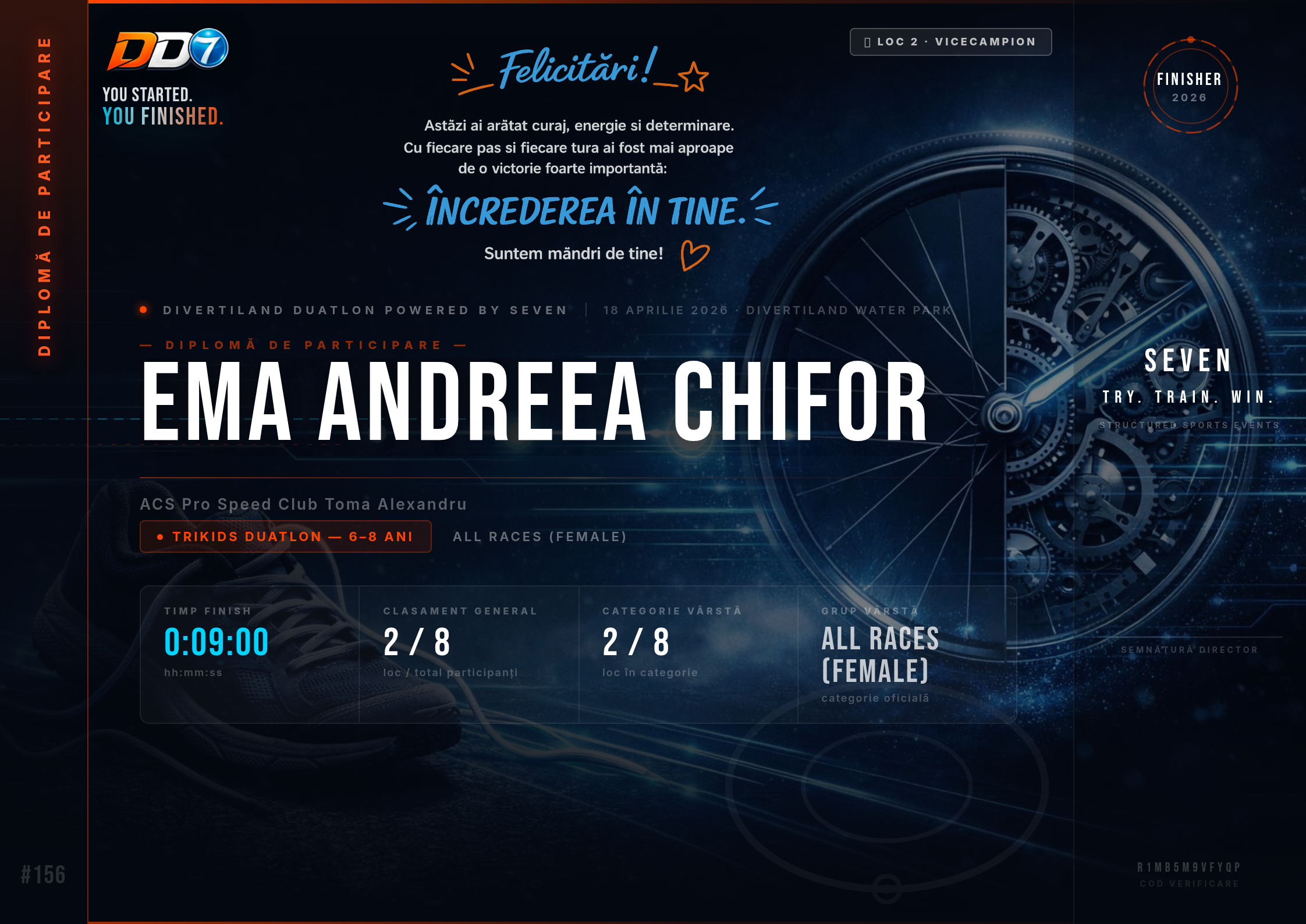 | 2 | Ema Andreea Chifor | TRIKids 6-8 Ani | F | 156 | 0:01:16 | 0:00:50 | 0:05:18 | 0:01:37 | 0:09:00 | 📜 |