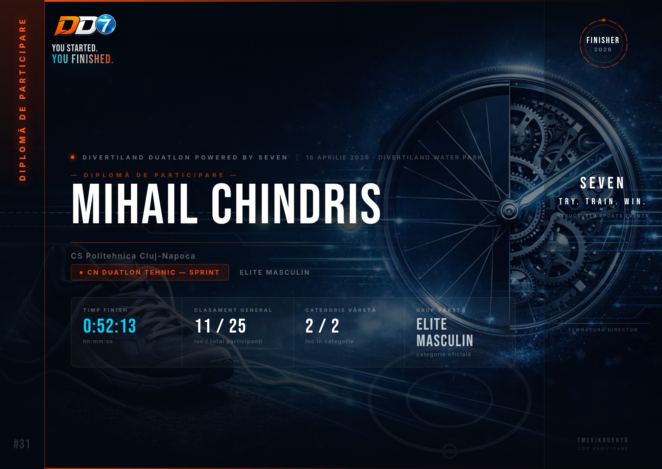 | 2 | 31 | MIHAIL CHINDRIS | Elite Masculin | CN Duatlon Tehnic - Sprint | M | 0:07:17 | 0:00:34 | 0:15:33 | 0:00:41 | 0:07:54 | 0:00:36 | 0:14:49 | 0:04:52 | 0:52:13 | 📜 |