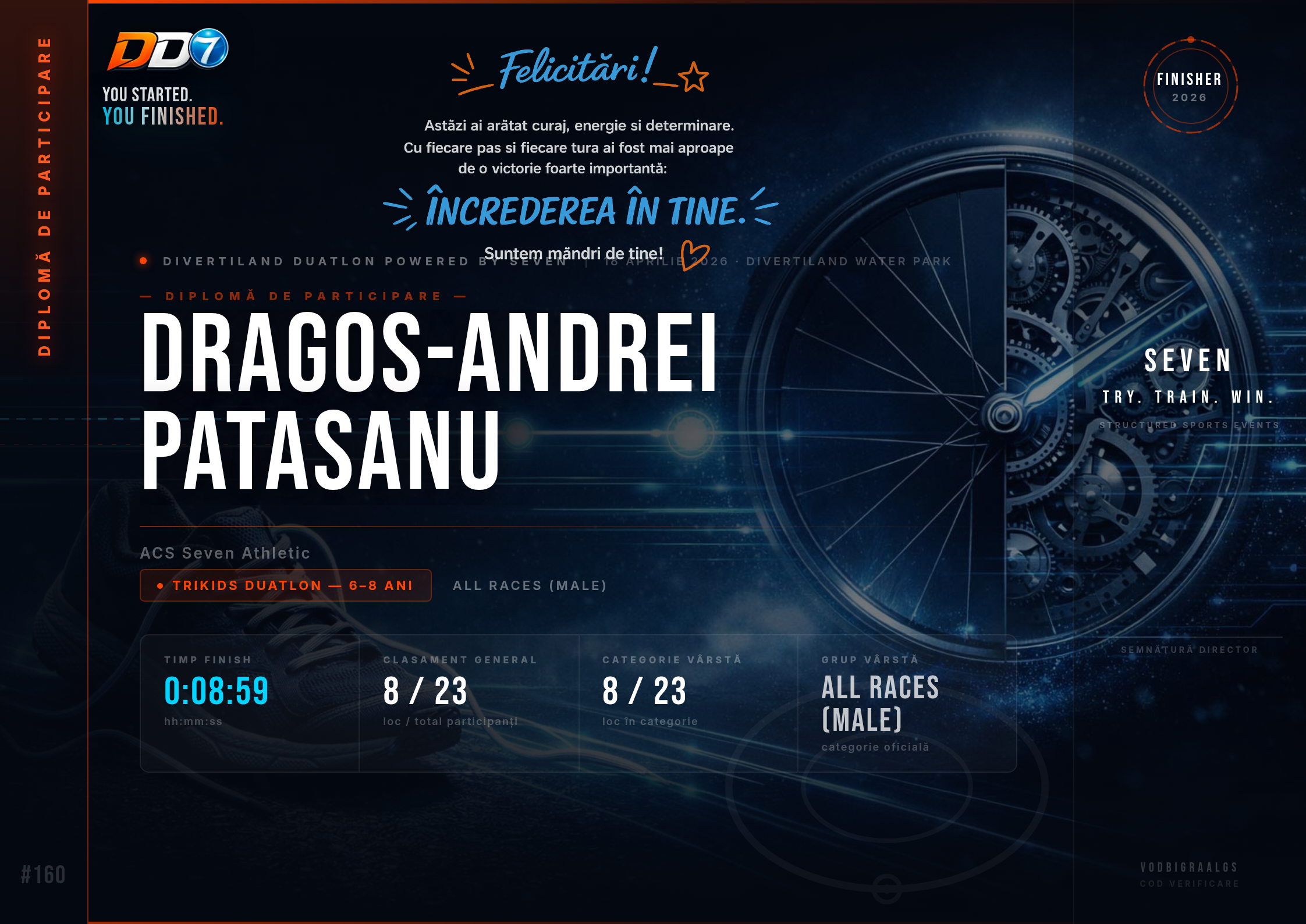 | 8 | Dragos-Andrei Patasanu | TRIKids 6-8 Ani | M | 160 | 0:01:15 | 0:00:53 | 0:05:14 | 0:01:38 | 0:08:59 | 📜 |