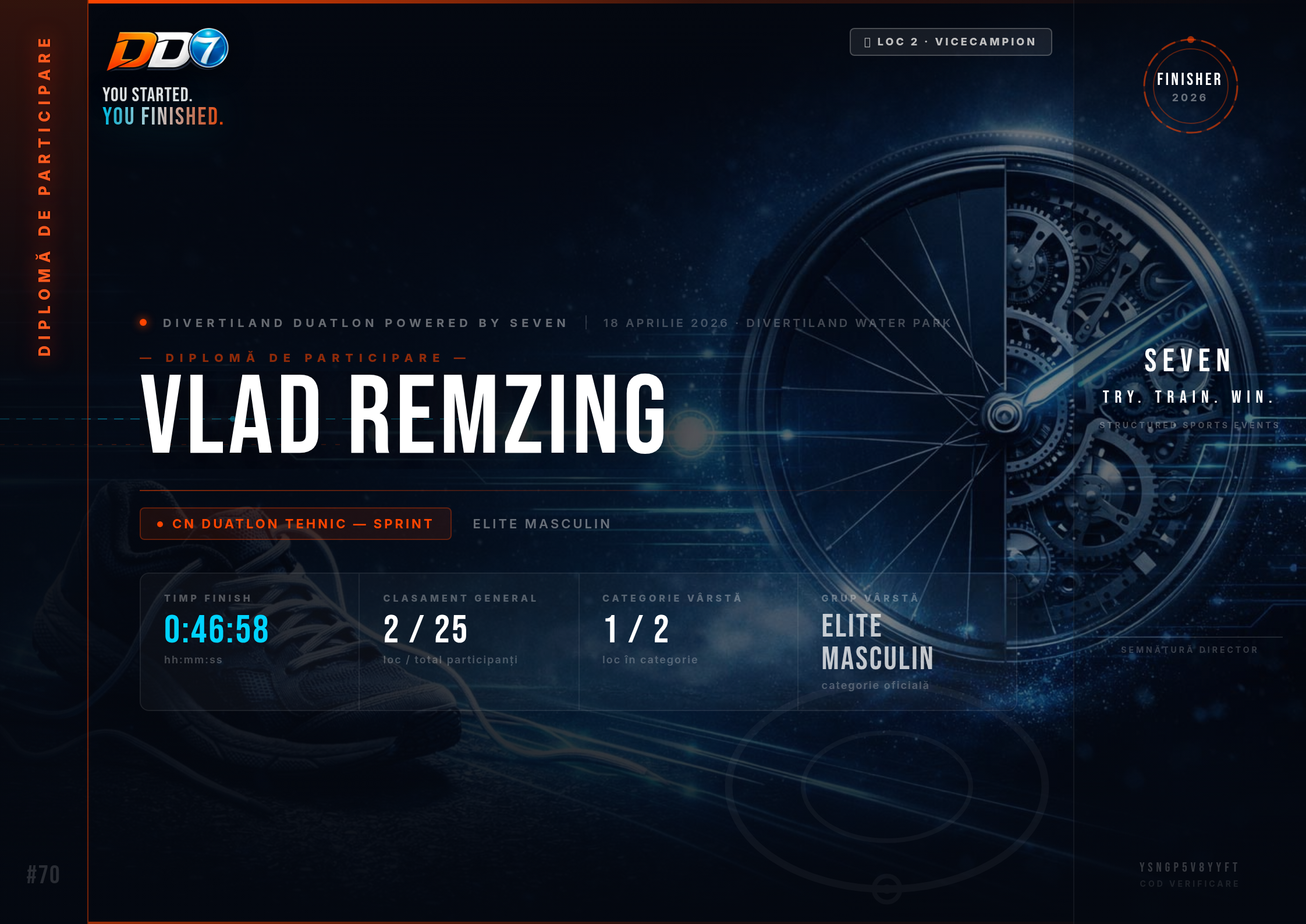 | 1 | 70 | Vlad Remzing | Elite Masculin | CN Duatlon Tehnic - Sprint | M | 0:06:30 | 0:00:29 | 0:13:58 | 0:00:34 | 0:06:51 | 0:00:31 | 0:13:48 | 0:04:21 | 0:46:58 | 📜 |
