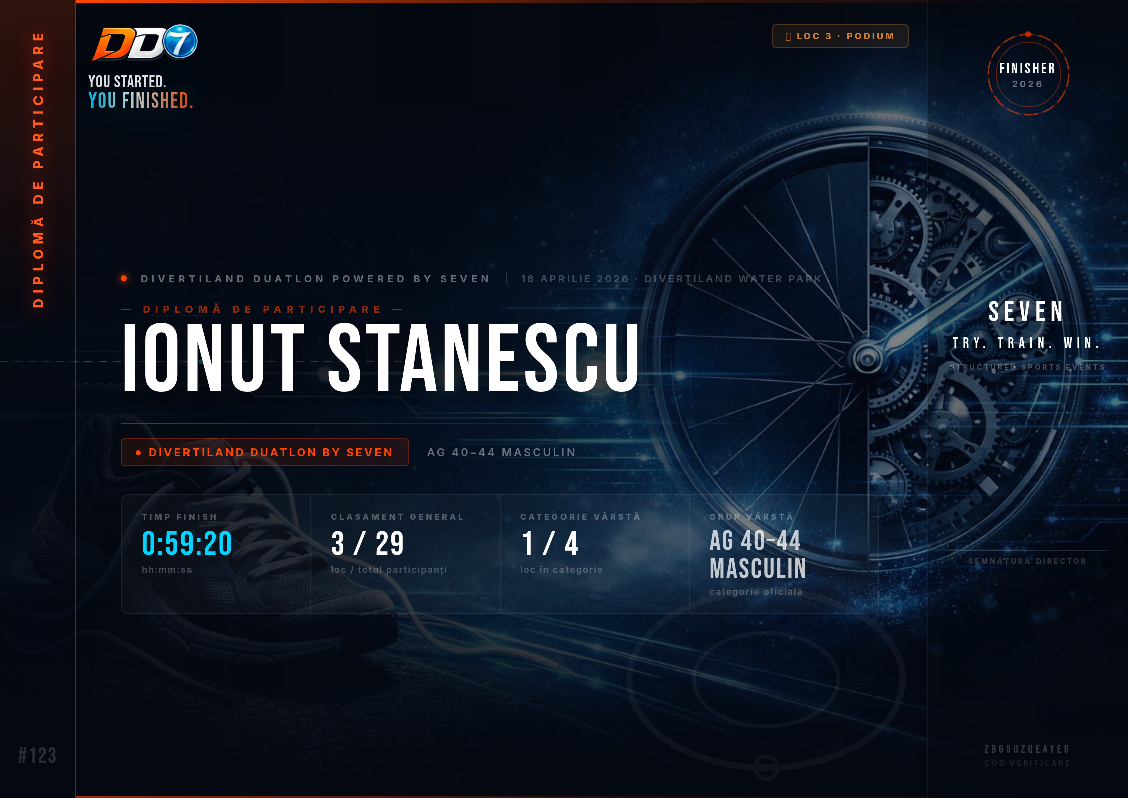 | 1 | 123 | Ionut Stanescu | AG 40–44 Masculin | M | 0:08:46 | 0:00:59 | 0:16:29 | 0:01:04 | 0:08:52 | 0:01:00 | 0:16:54 | 0:05:18 | 0:59:20 | 📜 |